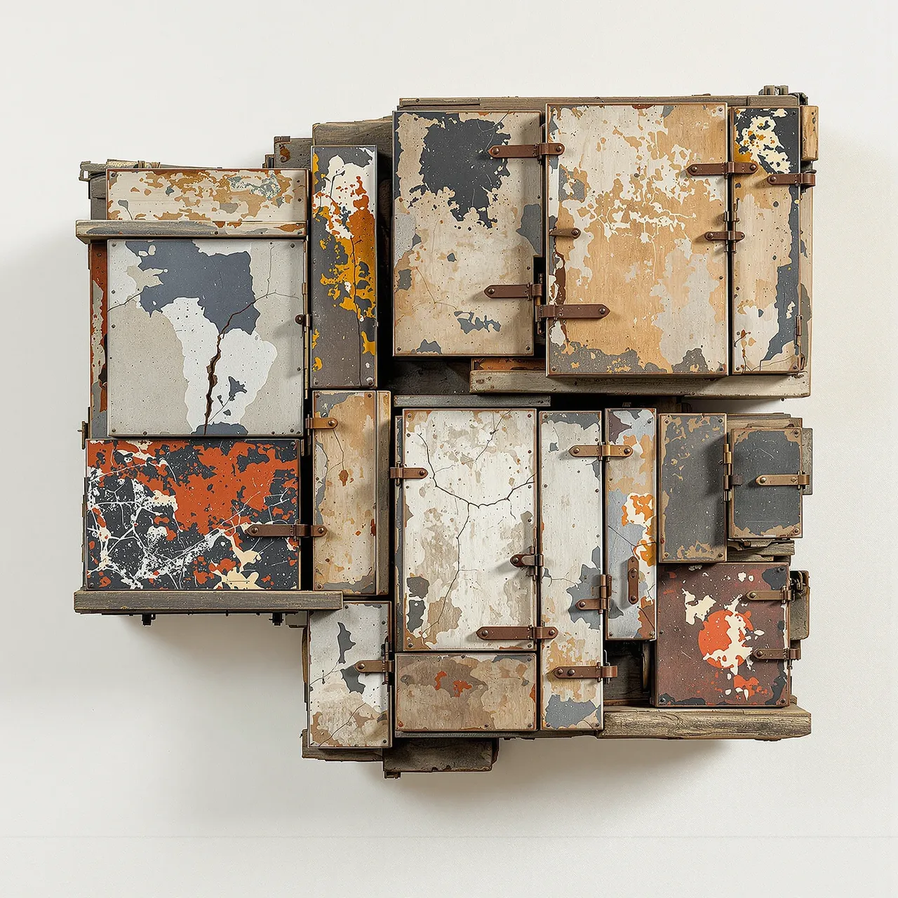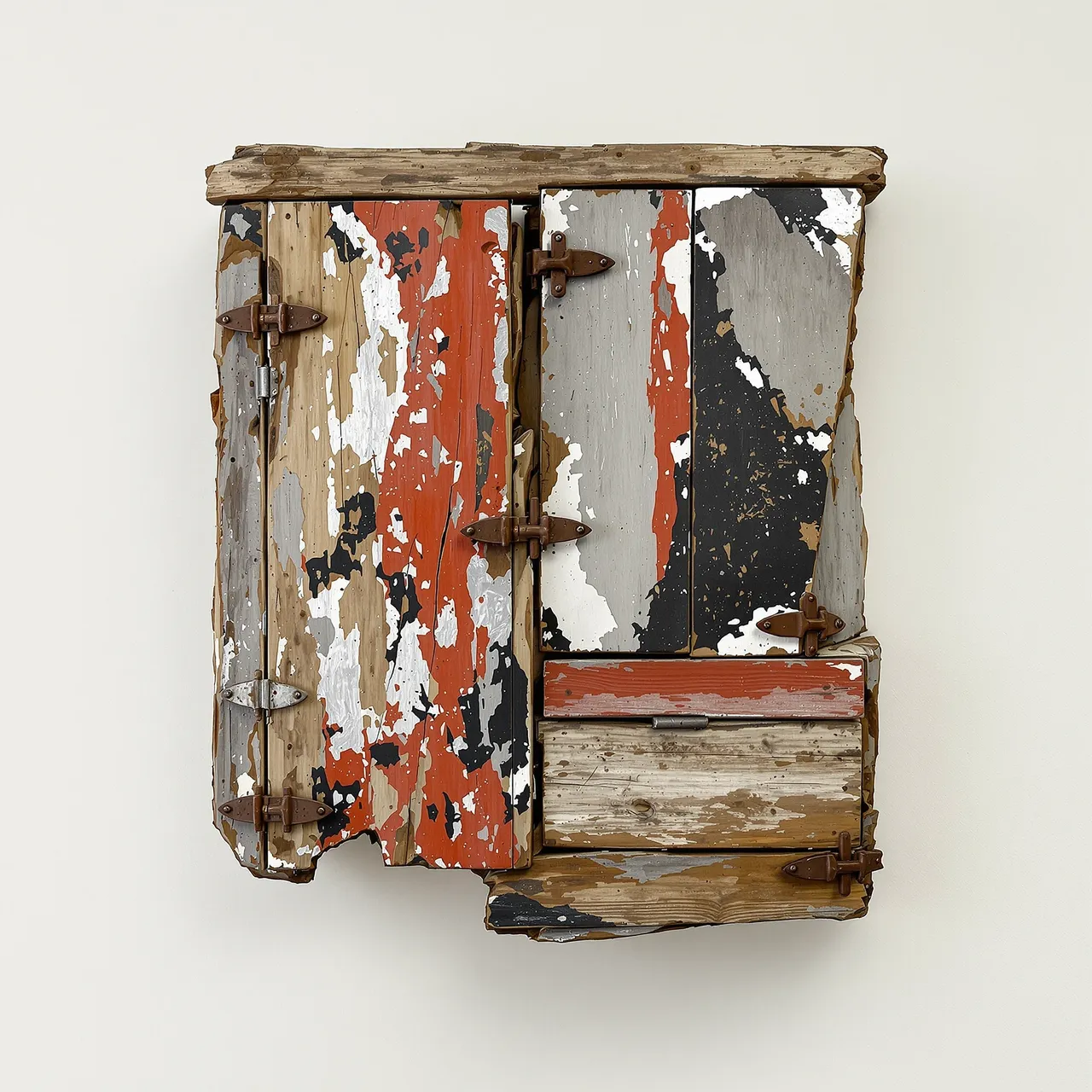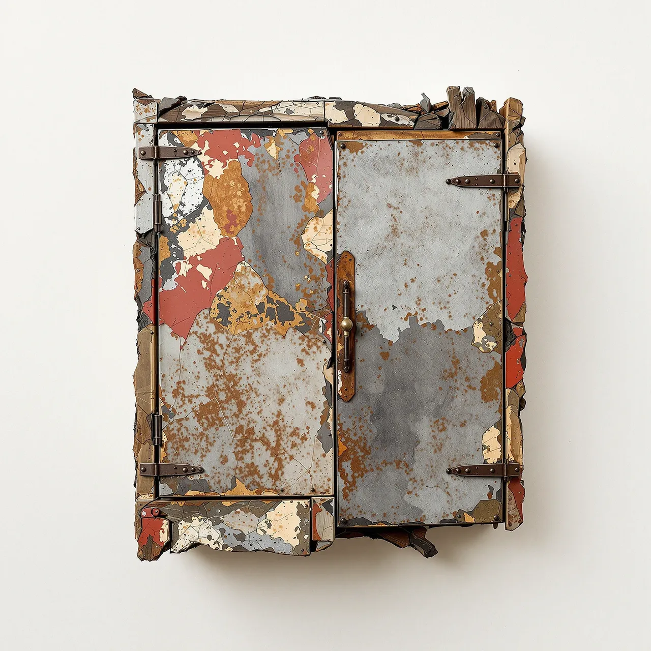 At home I live with a collection of handmade driftwood cabinets. Their construction is simple at the core — solid backs and sides of ordinary timber — but their faces are intricate, assembled from weathered planks, salvaged locks, and rusted hinges. They are at once functional and improbable: rough fragments transformed into objects of unexpected beauty. Arca extends that fascination into another register. Using artificial intelligence, I reimagine the cabinets not as furniture but as impossible artefacts — objects summoned from latent space, where fragments of wood and metal combine into forms that feel real but exist only as probability. The material illusion of driftwood, peeling paint, and corroded fittings remains, but the objects exist only as images: plausible, tactile, and yet unreal.