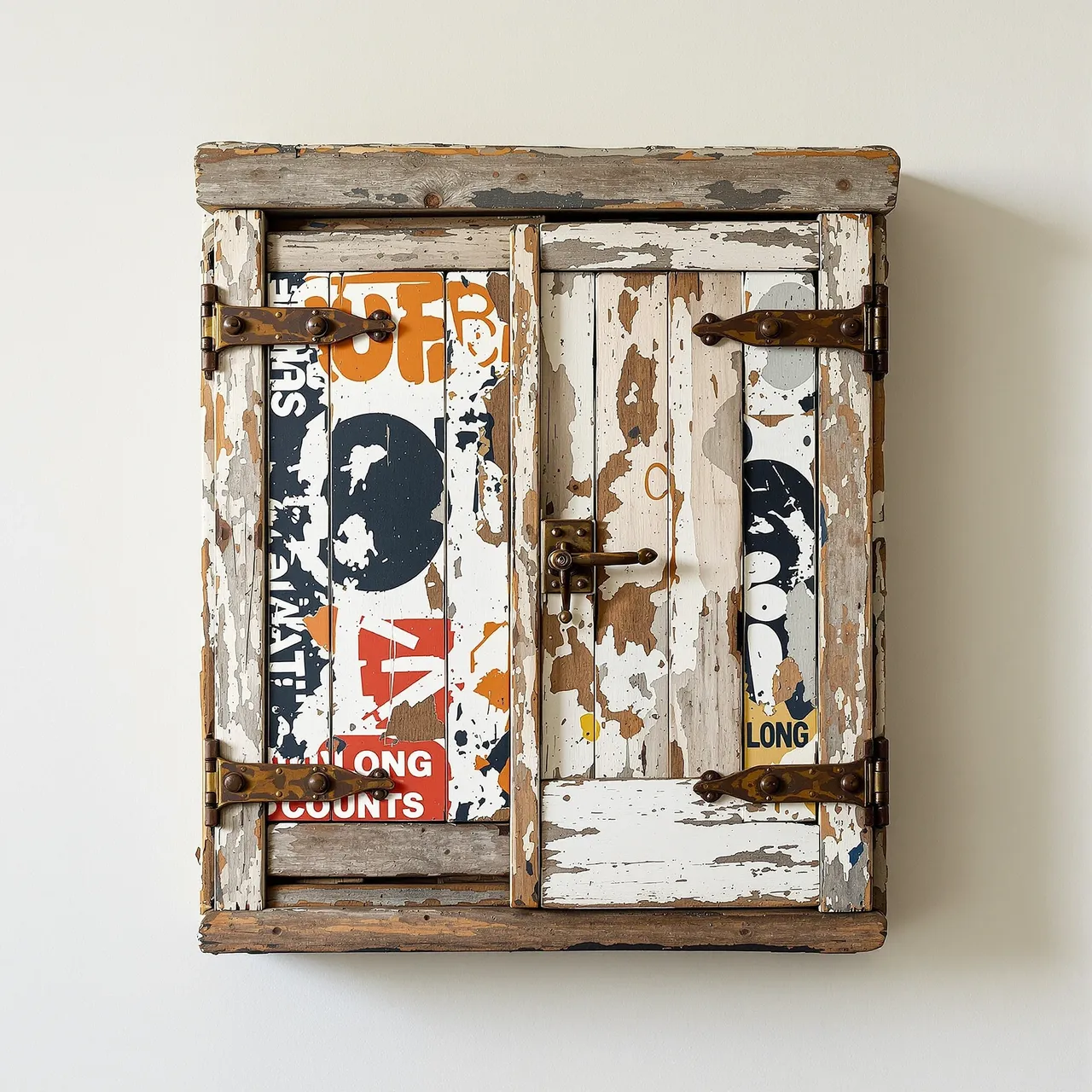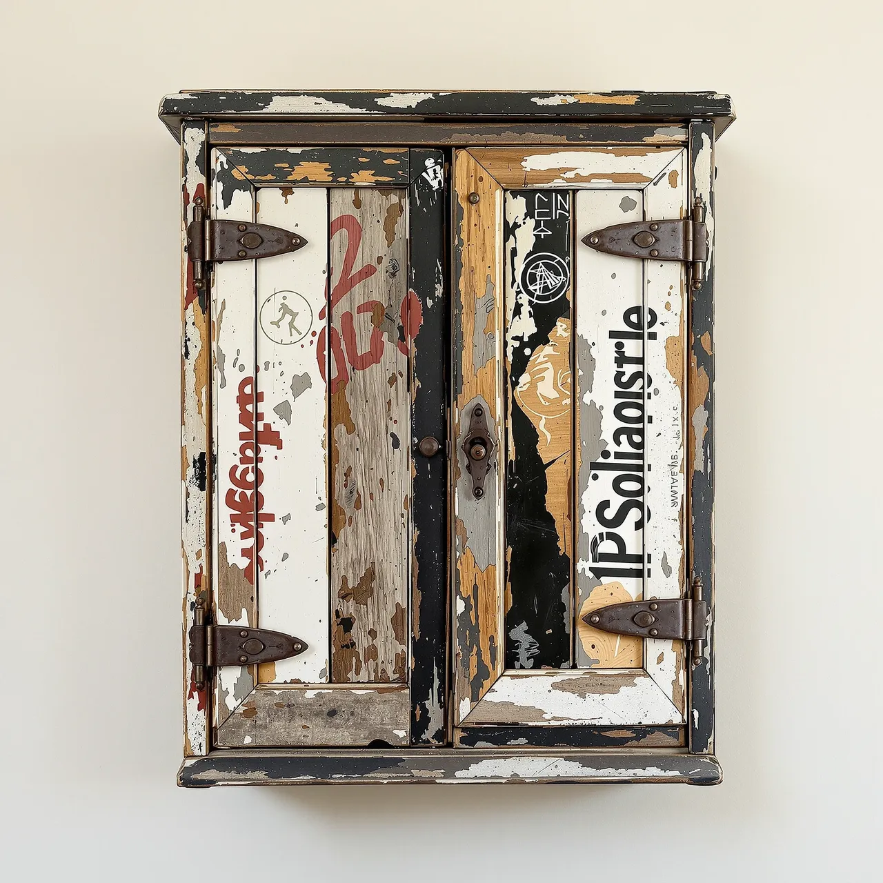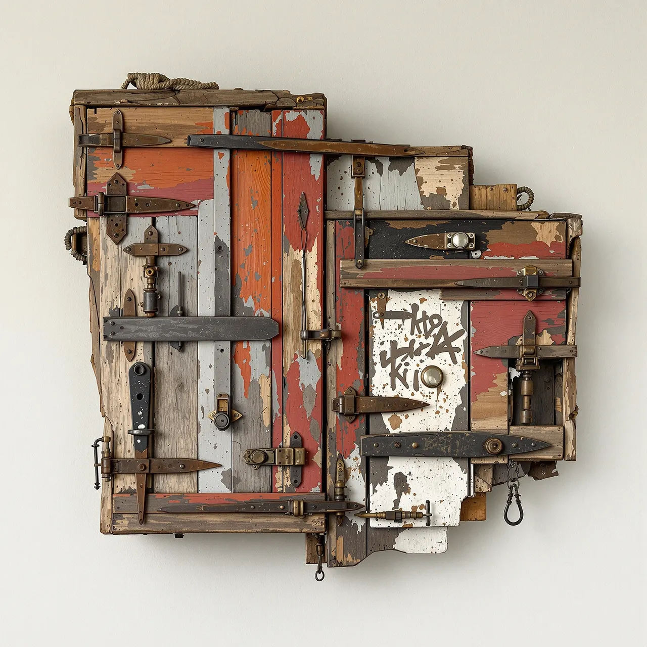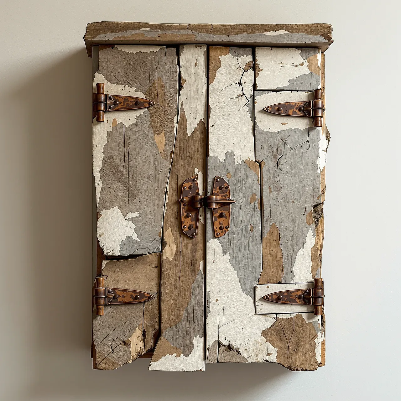 At home I live with a collection of handmade driftwood cabinets. Their construction is simple at the core — solid backs and sides of ordinary timber — but their faces are intricate, assembled from weathered planks, salvaged locks, and rusted hinges. They are at once functional and improbable: rough fragments transformed into objects of unexpected beauty. Arca extends that fascination into another register. Using artificial intelligence, I reimagine the cabinets not as furniture but as impossible artefacts — objects summoned from latent space, where fragments of wood and metal combine into forms that feel real but exist only as probability. The material illusion of driftwood, peeling paint, and corroded fittings remains, but the objects exist only as images: plausible, tactile, and yet unreal.