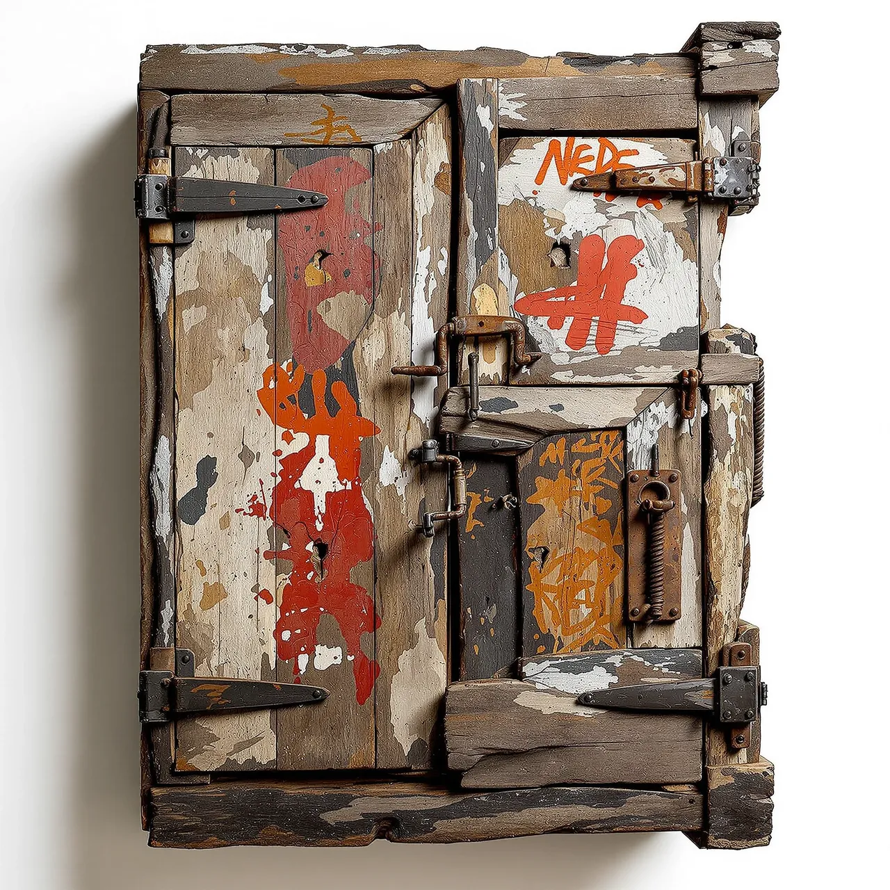 If Robert Rauschenberg built his Combines from the wreckage of modernity, these works are assembled from the wreckage of reality itself. Arca is an act of synthesis, conjuring materiality through the immaterial. These cabinets exist, yet they do not. Their surfaces tell a story of decay — peeling paint, rusted hinges, tarnished metal, splintered driftwood — yet they have no weight, no scent, no tactility beyond the glass of a screen. They are artefacts from a parallel history, crafted not by hand but through synthography — a process that does not replicate the real but invents it anew. Wood does not rot; metal does not corrode; hinges do not stiffen. They only appear to. Yet their cracked paint, corroded latches, and traces of graffiti suggest history — a past function that never truly existed. Ce n’est pas la réalité.