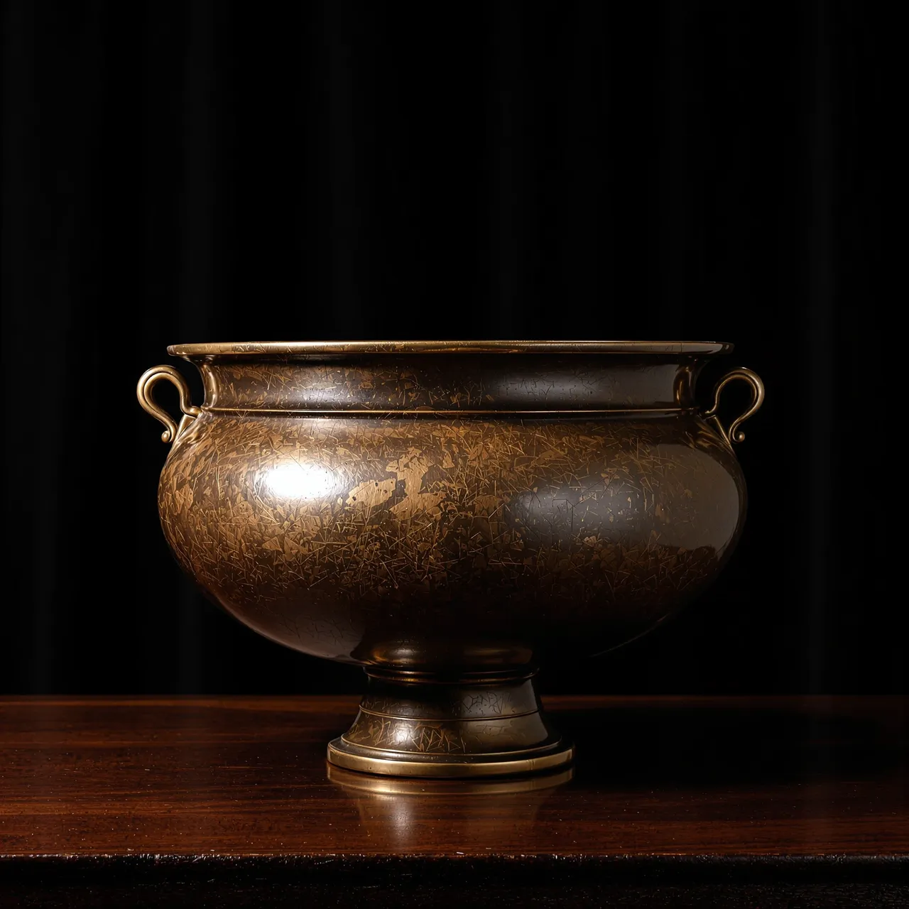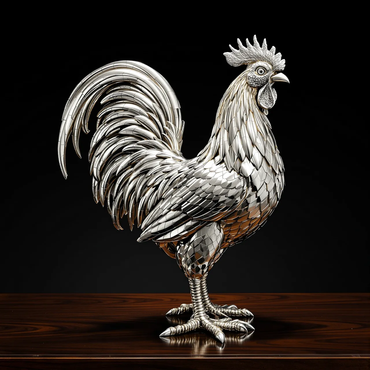 Each object in Aurum is fabricated entirely through artificial intelligence. A goblet, a spoon, a tea pot, a crown: all are conjured through text prompts and rendered with clinical precision. Every image follows the same controlled arrangement — a polished walnut table, a seamless black background, and a single directional spotlight, as if staged for museum photography. This discipline isolates the objects, stripping away narrative or distraction. What remains are forms suspended between fiction and reality, convincing in their detail yet impossible in their existence. In this sense the project is a kind of digital alchemy: language transformed into surface, texture, and gleam.
