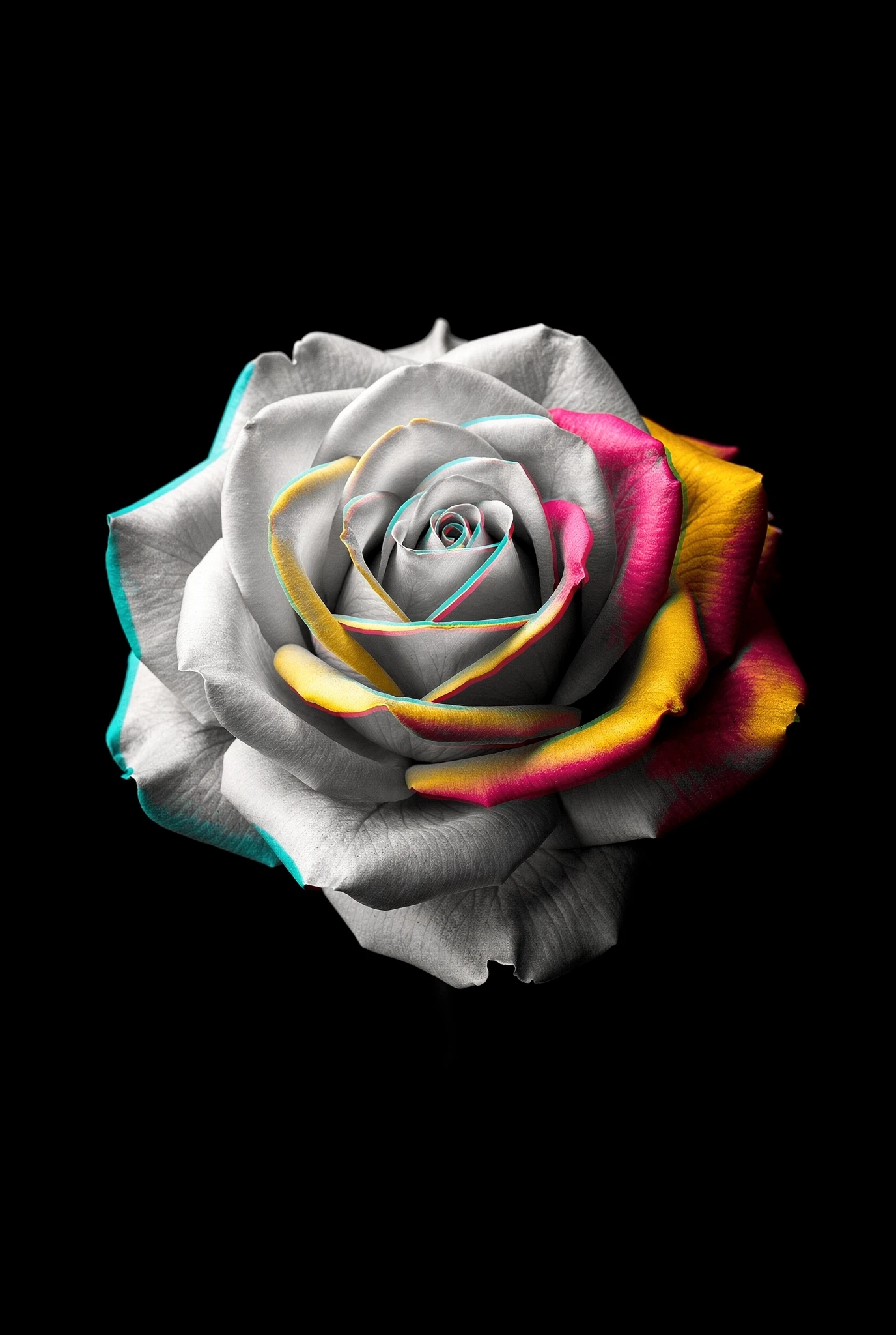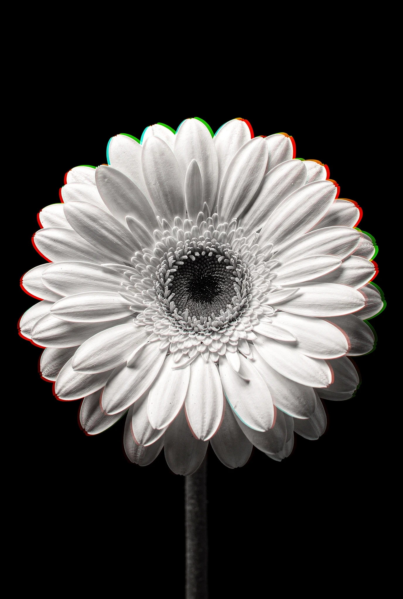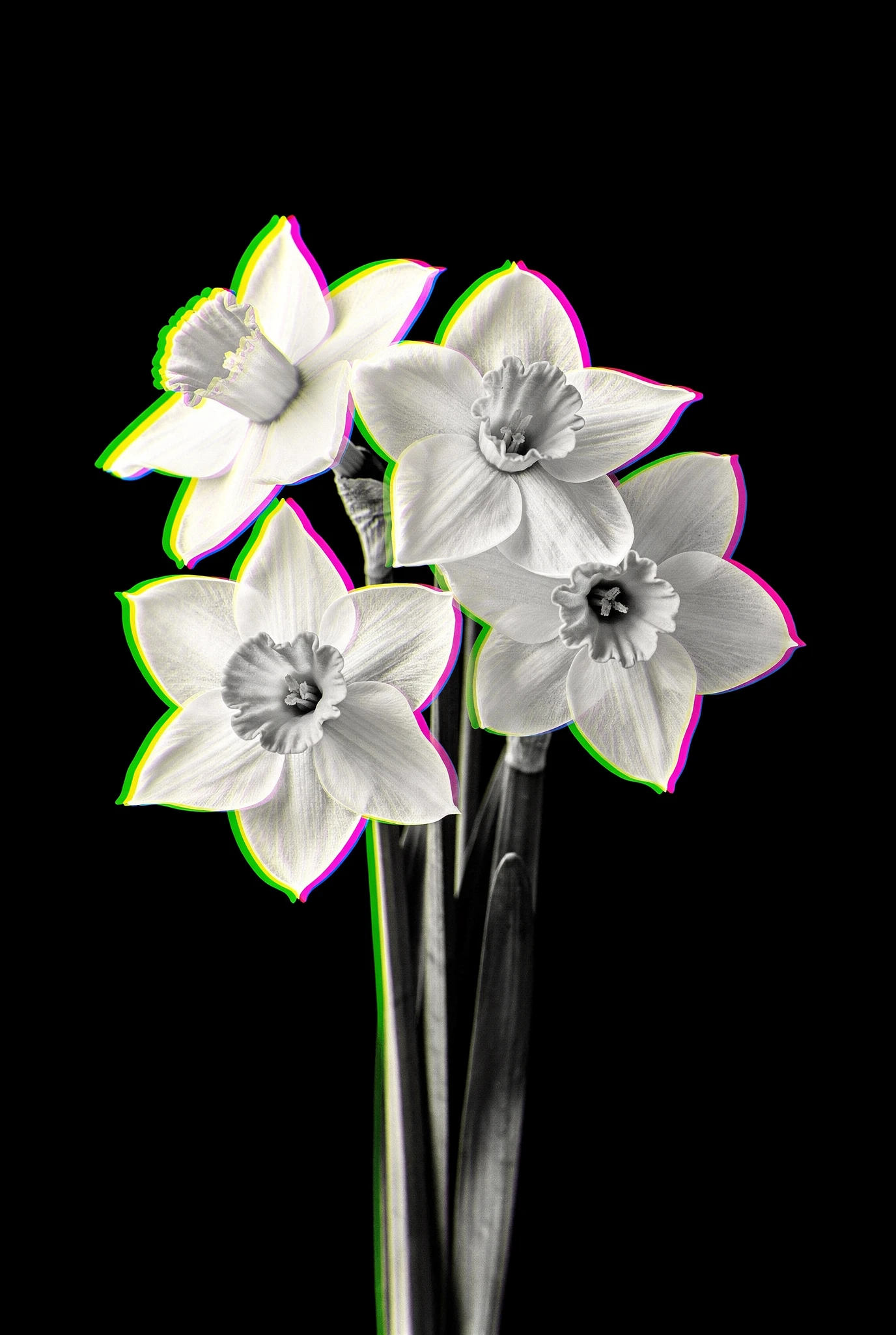 The images behave like unstable Technicolor prints. Hidden colour begins to surface: chromatic edges appear, channels drift out of alignment, and dormant dyes seem to awaken. In some images colour slowly seeps back into the petals like light passing through stained glass. In others it behaves less politely, slipping sideways, colourising, or blooming unexpectedly as though a hidden process had stirred to life inside the synthograph. The flowers themselves remain composed and indifferent, perfectly centred and still. What changes is the image around them. In Chroma, colour is not added to the flowers. It reawakens within them — bright, unruly, and joyful — as if the monochrome world could no longer keep it contained.