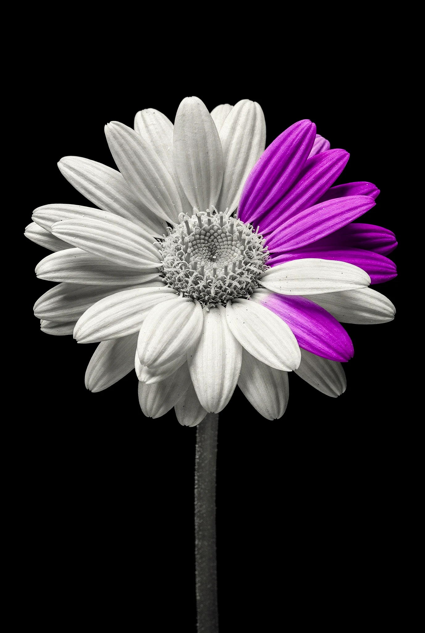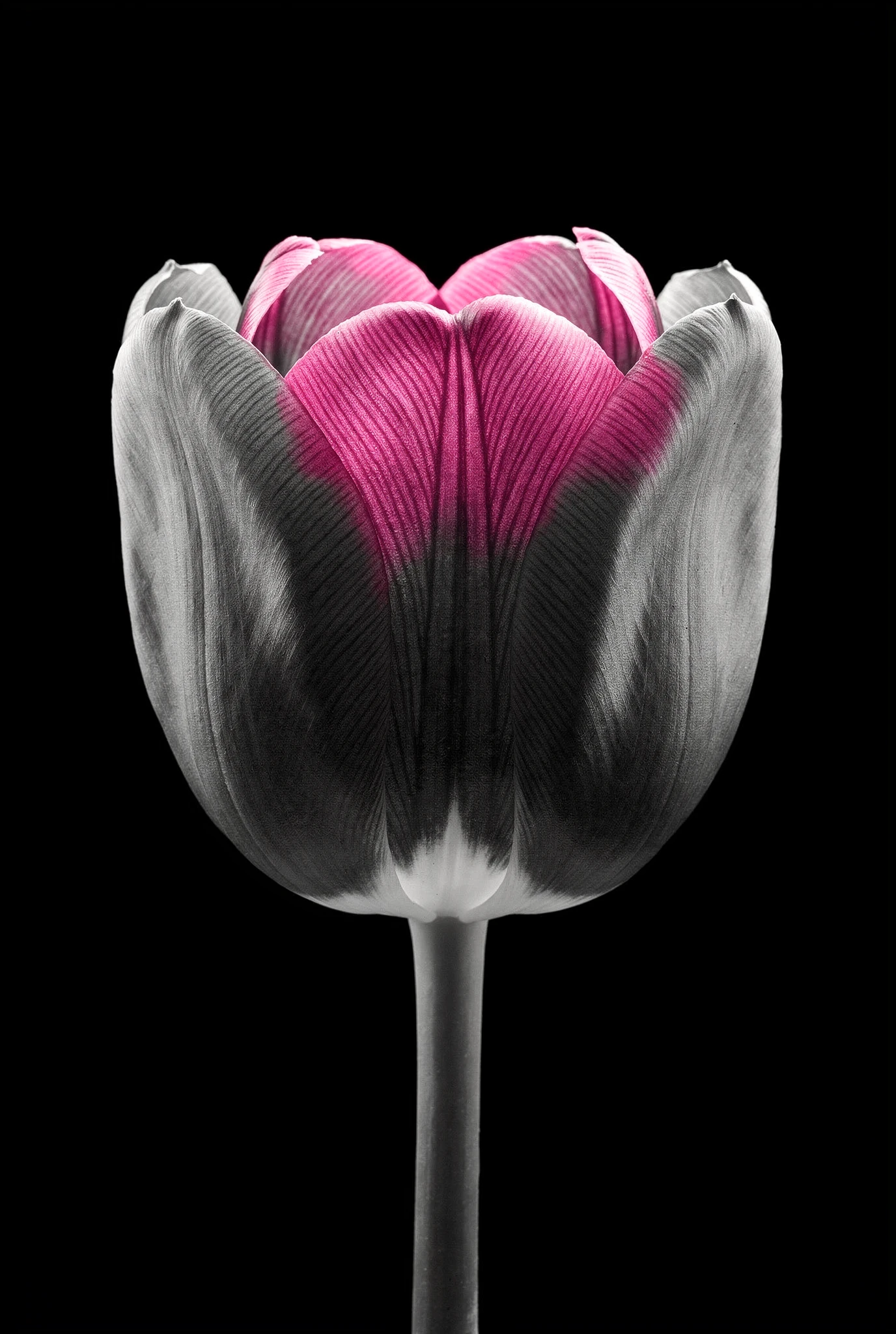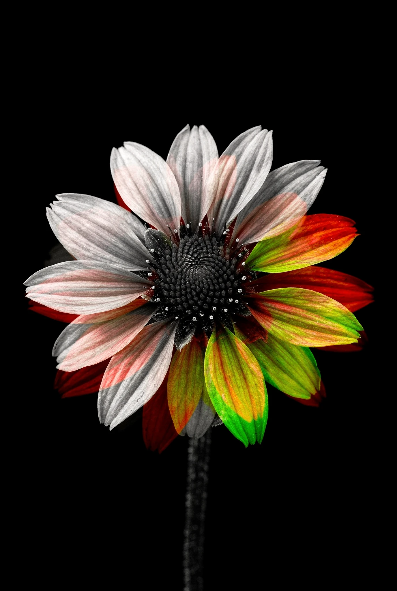 Historically, black-and-white photography never truly lacked colour. Colour was simply recorded differently. Chroma begins in that territory — each flower rendered with clarity. But the monochrome system cannot hold indefinitely. Each flower is isolated against darkness like a specimen plate — calm, centred, almost clinical in its precision. Monochrome photography has always carried a certain austerity, a sense of order and restraint. Yet black-and-white does not truly erase colour; it merely holds it in suspension. In the chemistry of film, in the dyes of printing, and in the strange alchemy of the darkroom, colour has always lingered somewhere beneath the surface. Chroma suggests that beneath the monochrome image lies another possibility.