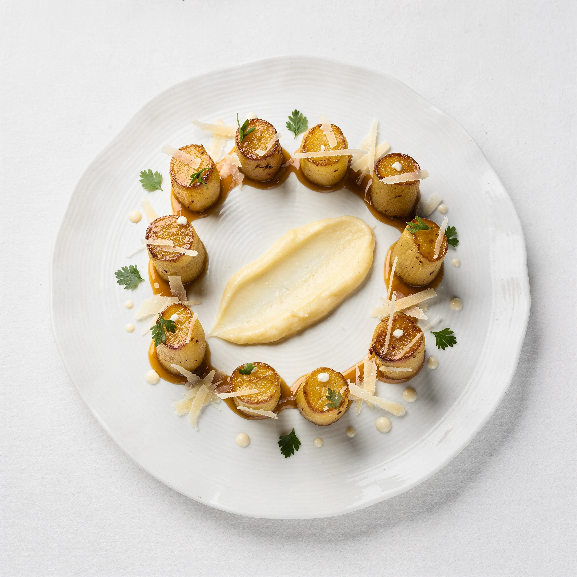 EAT ME DRINK ME is an art project that uses the visual language of modern European haute cuisine as a conceptual device, not as subject matter. It takes the form of an 18-course tasting menu, realised as 18 synthographs generated with Flux.2 Pro, but it is not concerned with food photography in the conventional sense. Drawing on French technique and contemporary fine-dining aesthetics, the work presents dishes that appear immaculate, confident, and aspirational. At first, everything signals quality and control: pristine plating, careful restraint, ingredients that imply expense and expertise. The food looks edible, safe, and desirable — designed to be trusted.