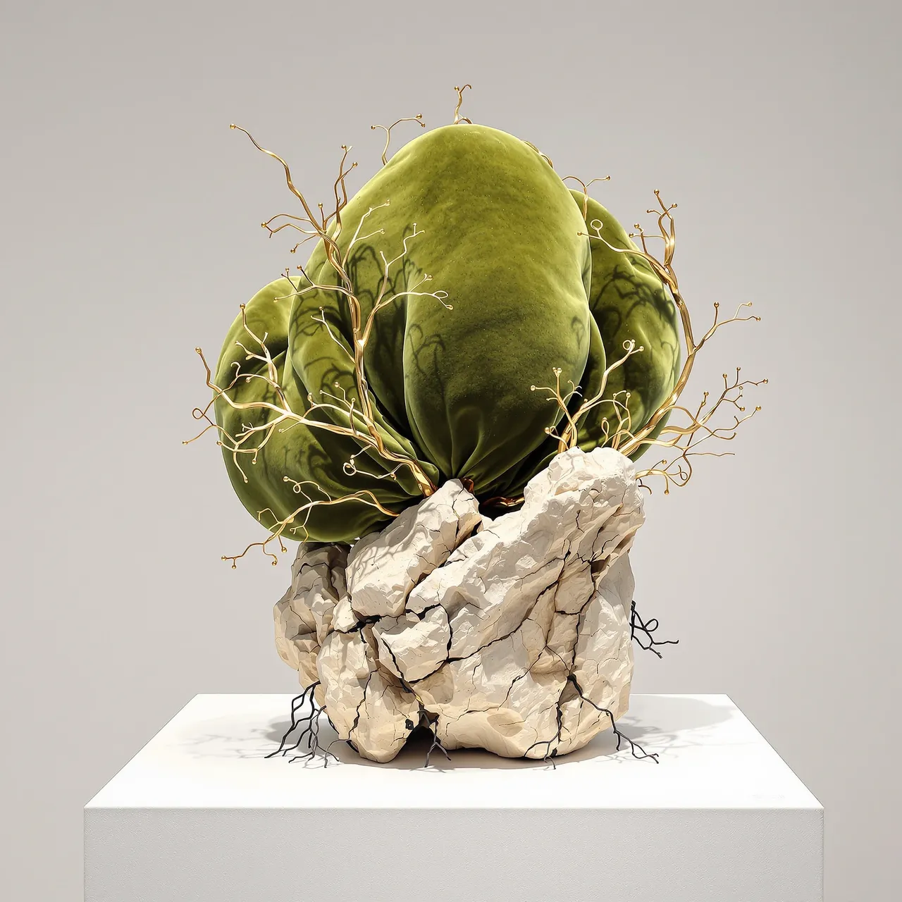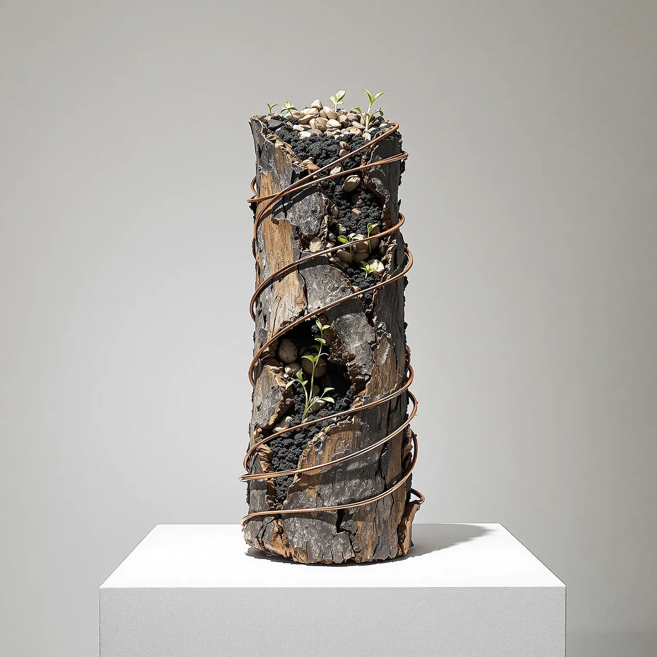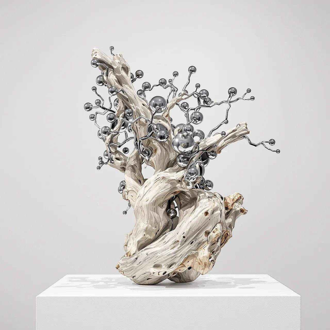 The series explores how artificial intelligence can be used not to mimic existing objects, but to invent entirely new ones — specimens from a fictional archive of forms. The sculptures are composed of simulated materials: metal, charred wood, compressed bark, glass, stone, and wire — sometimes overlaid with growths that resemble shells, fungi, or roots. And yet none of these materials are real. Their textures, their shadows, the way they absorb or reflect light — each has been imagined, rendered, and hallucinated. There is no original. The object is the image. The image is the artefact.