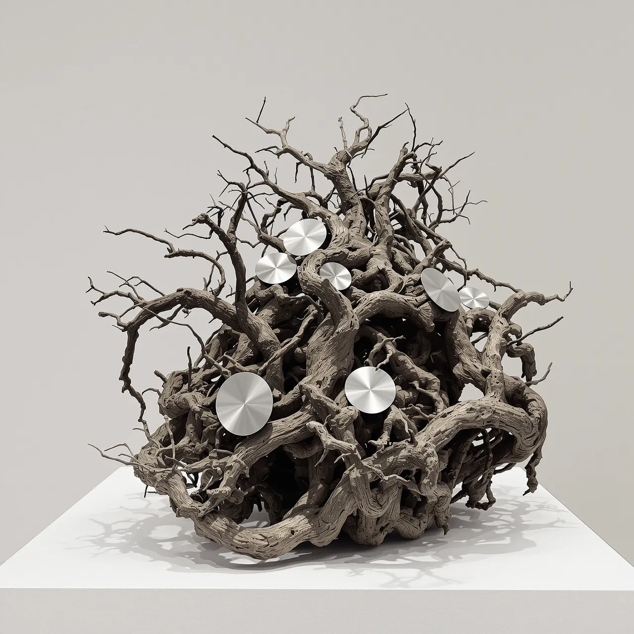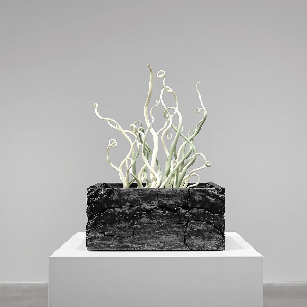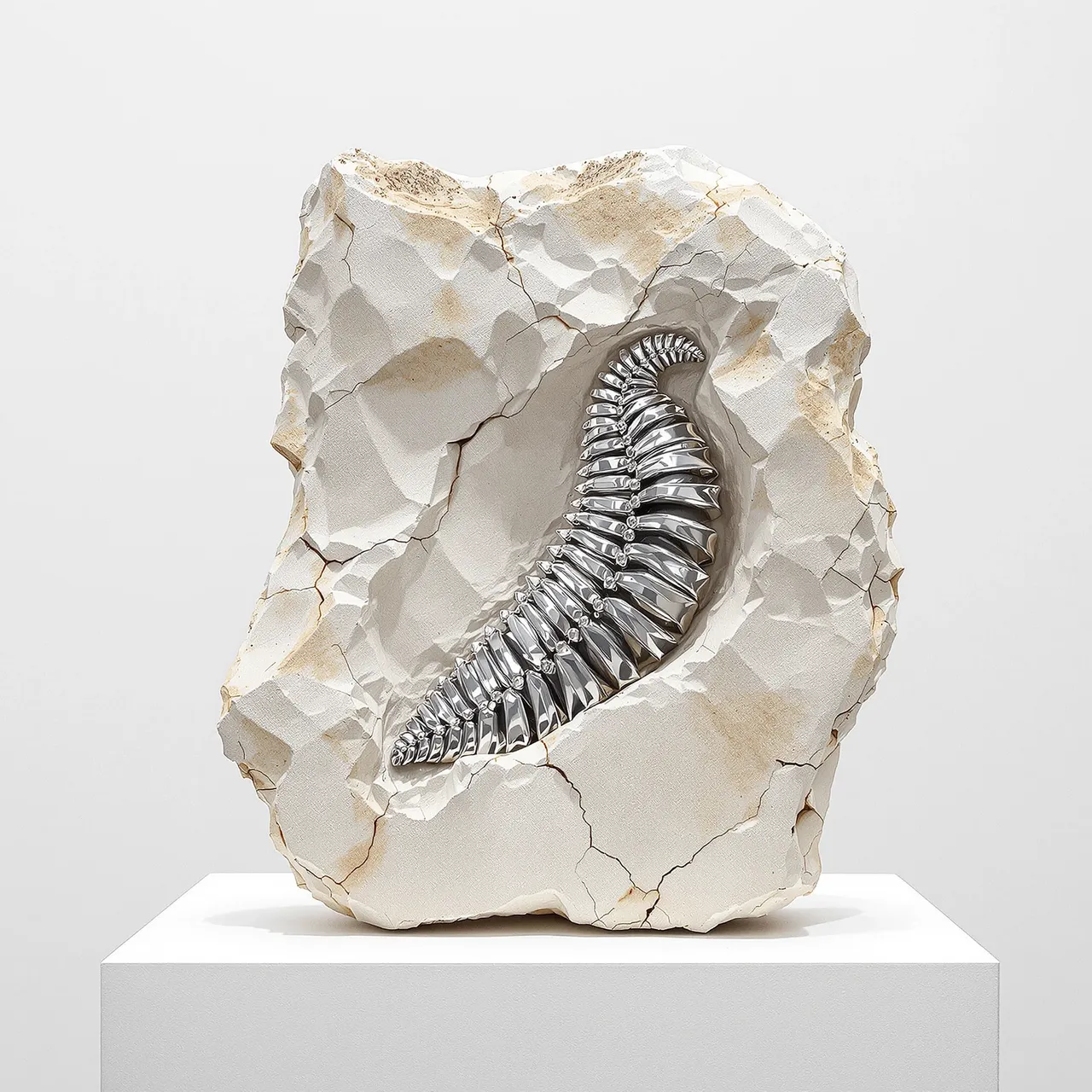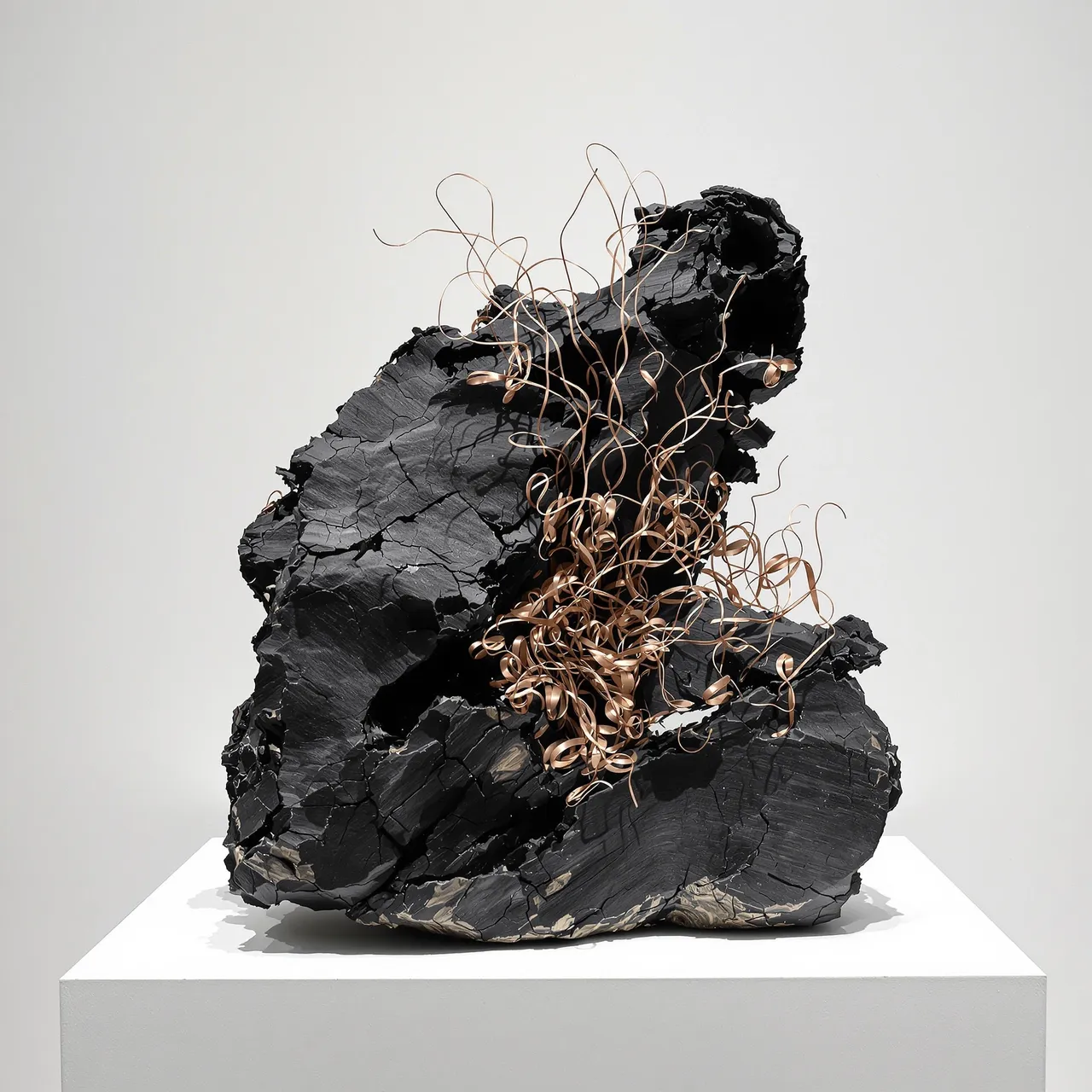 The series explores how artificial intelligence can be used not to mimic existing objects, but to invent entirely new ones — specimens from a fictional archive of forms. The sculptures are composed of simulated materials: metal, charred wood, compressed bark, glass, stone, and wire — sometimes overlaid with growths that resemble shells, fungi, or roots. And yet none of these materials are real. Their textures, their shadows, the way they absorb or reflect light — each has been imagined, rendered, and hallucinated. There is no original. The object is the image. The image is the artefact.