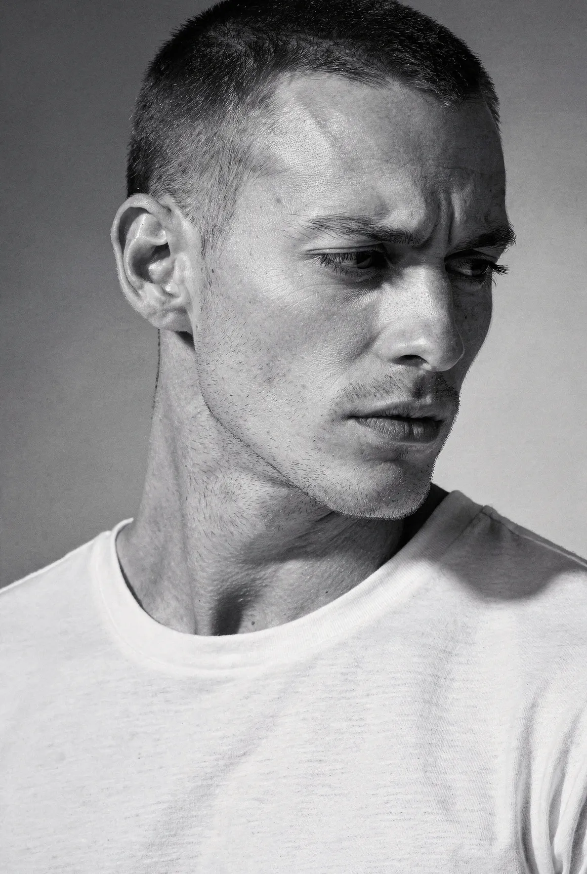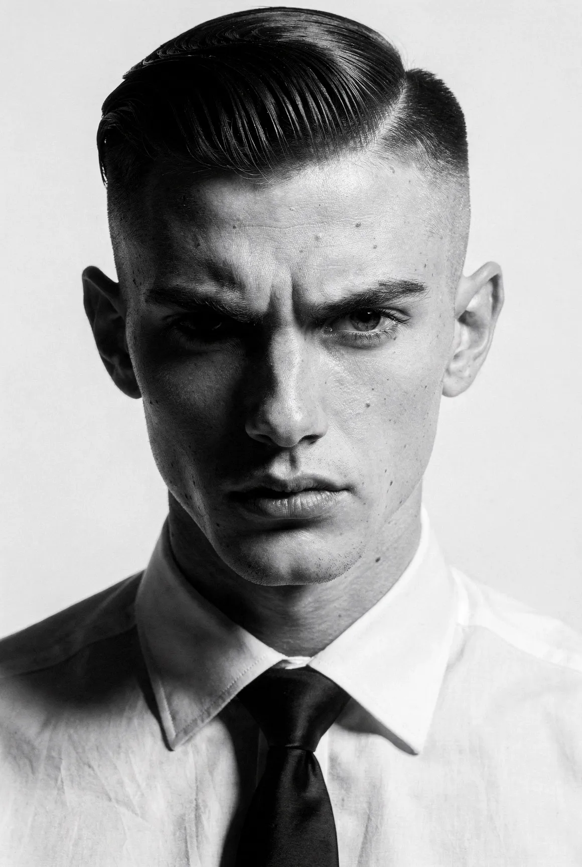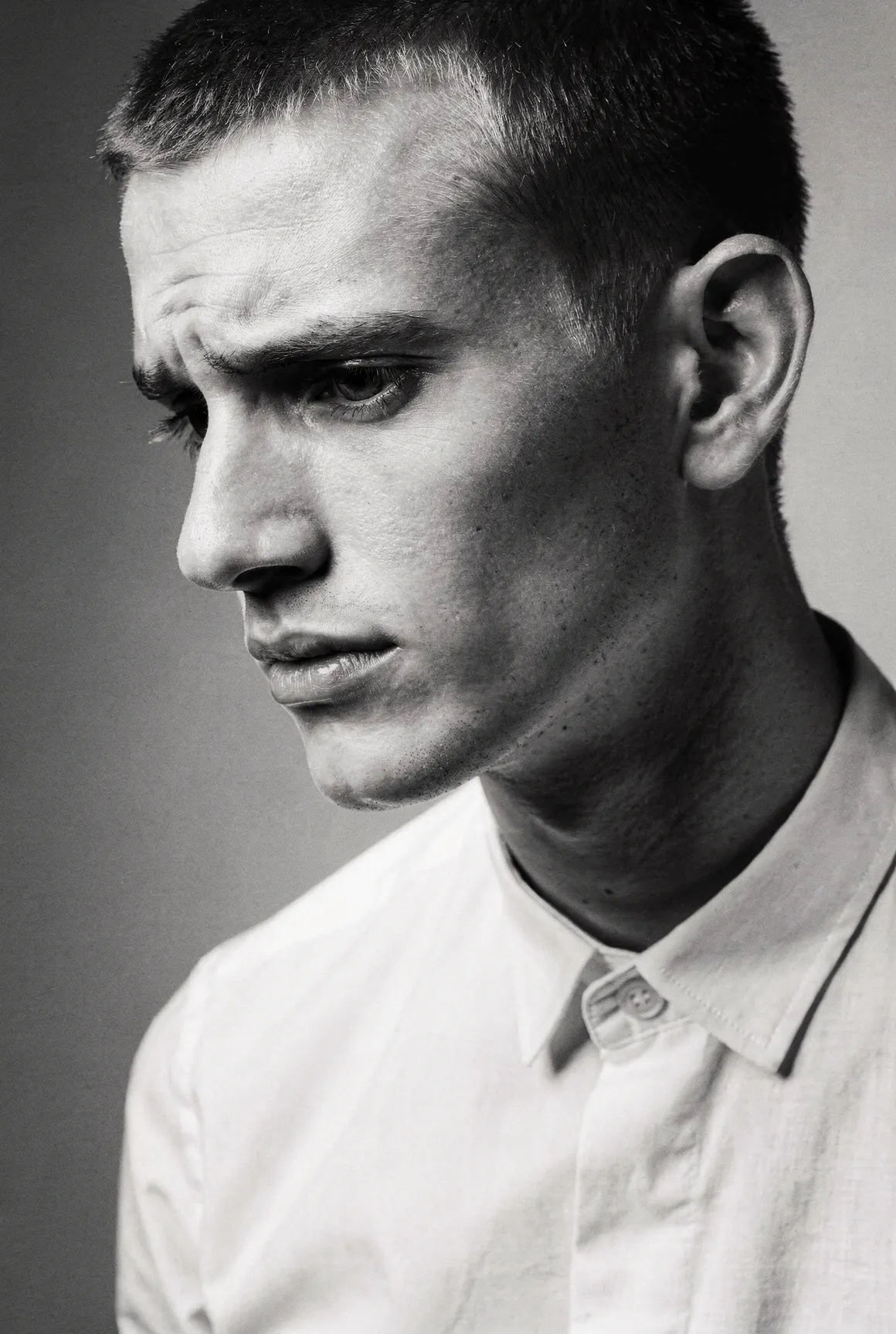 Each portrait presents a figure shaped by aesthetic codes we recognise — the sharpness of fashion editorials, the poise of professional models, the neutrality that invites projection. They are young men who could populate any major city — or the pages of any major magazine, but here they stand alone, removed from branding, styling excess, or trend. Clothing is minimal and purposeful: shirts, T-shirts, jackets, pieces chosen not as fashion statements but as structural elements that guide posture and tone. Light defines them more than costume does. Expression defines them more than narrative does. The focus is on the face, the presence, the almost-human gravity that emerges when a synthetic figure is rendered with enough precision to feel observed rather than invented. These are not AI faces stitched together from clichés. This is not "AI portraiture." This is portraiture — full stop.
