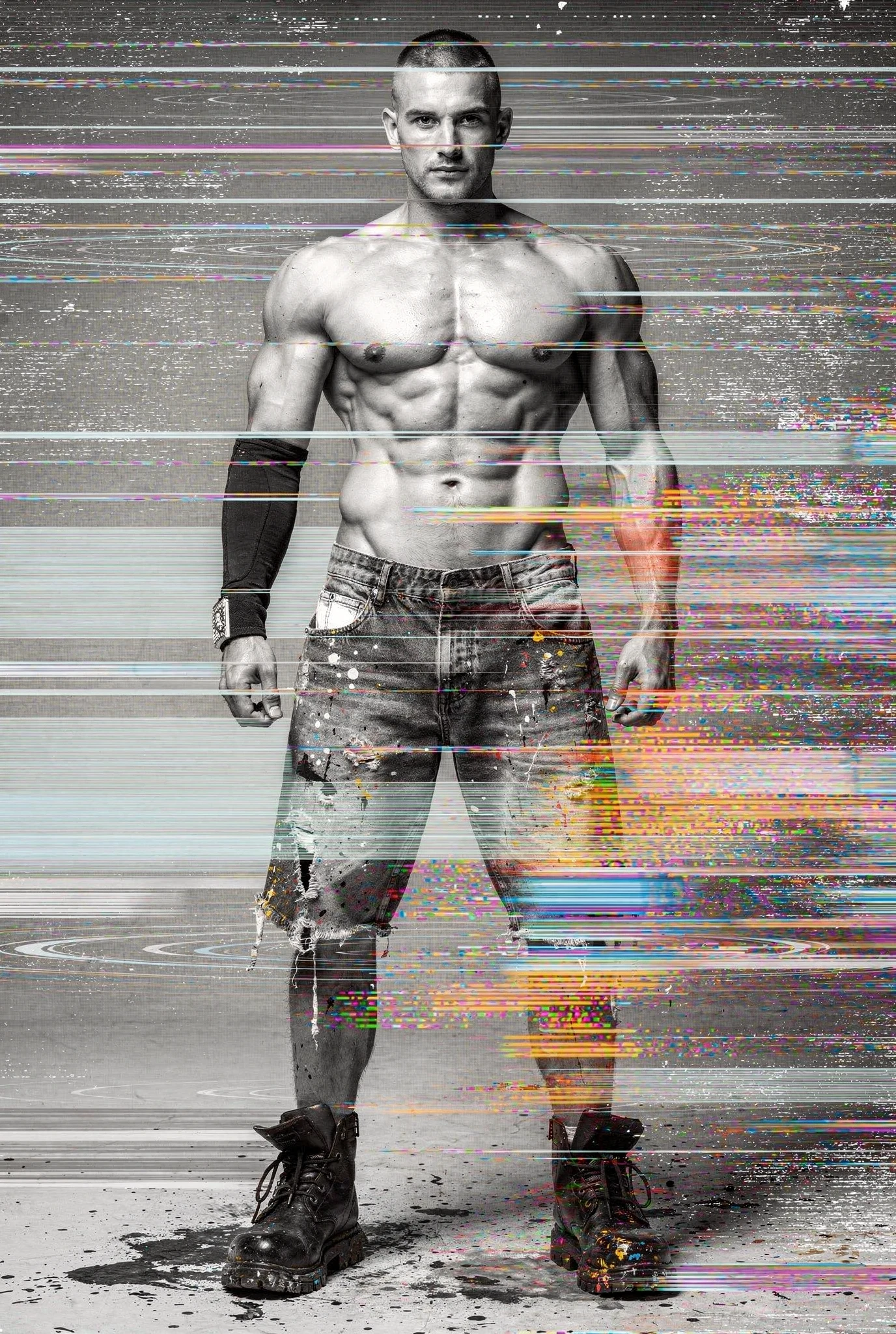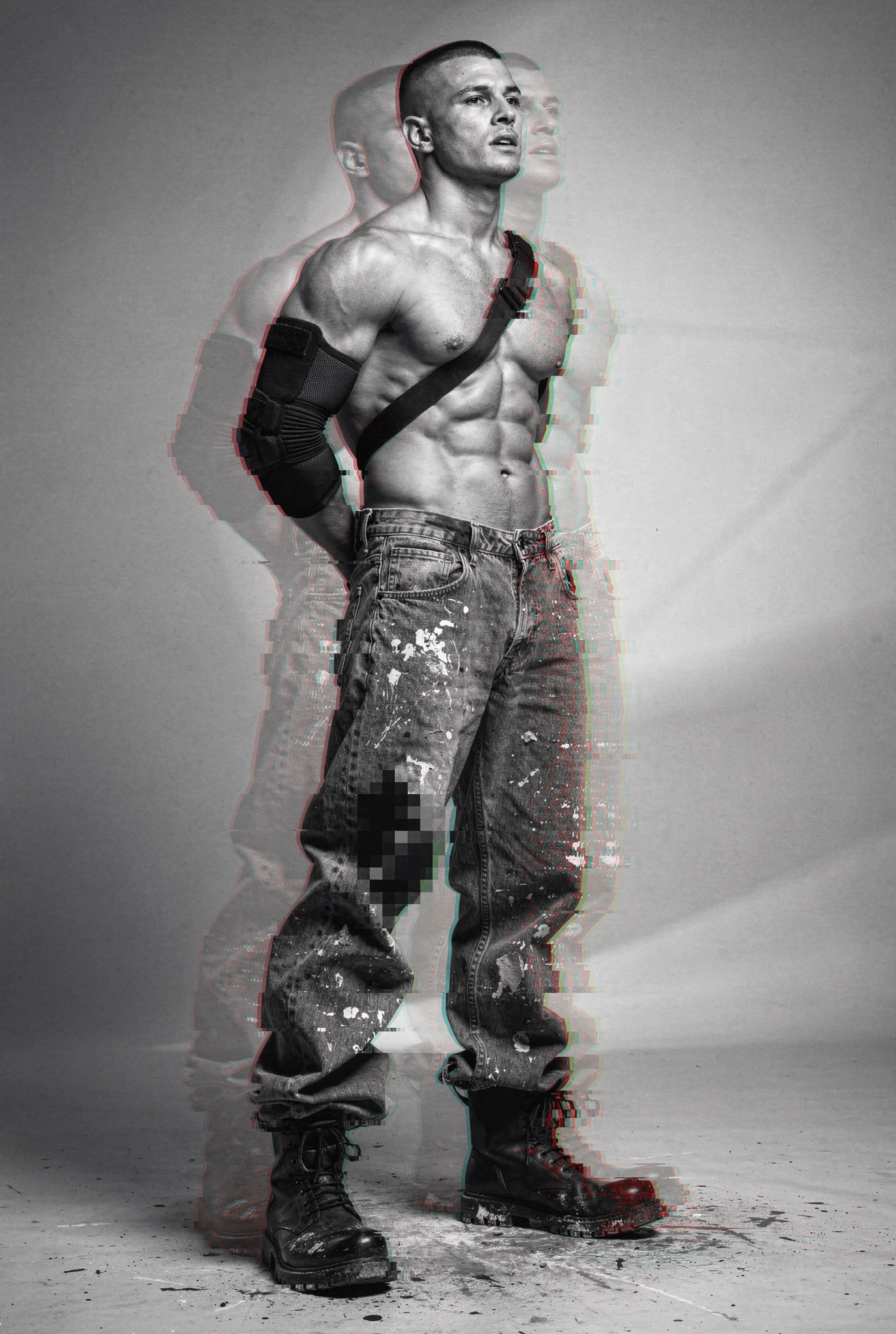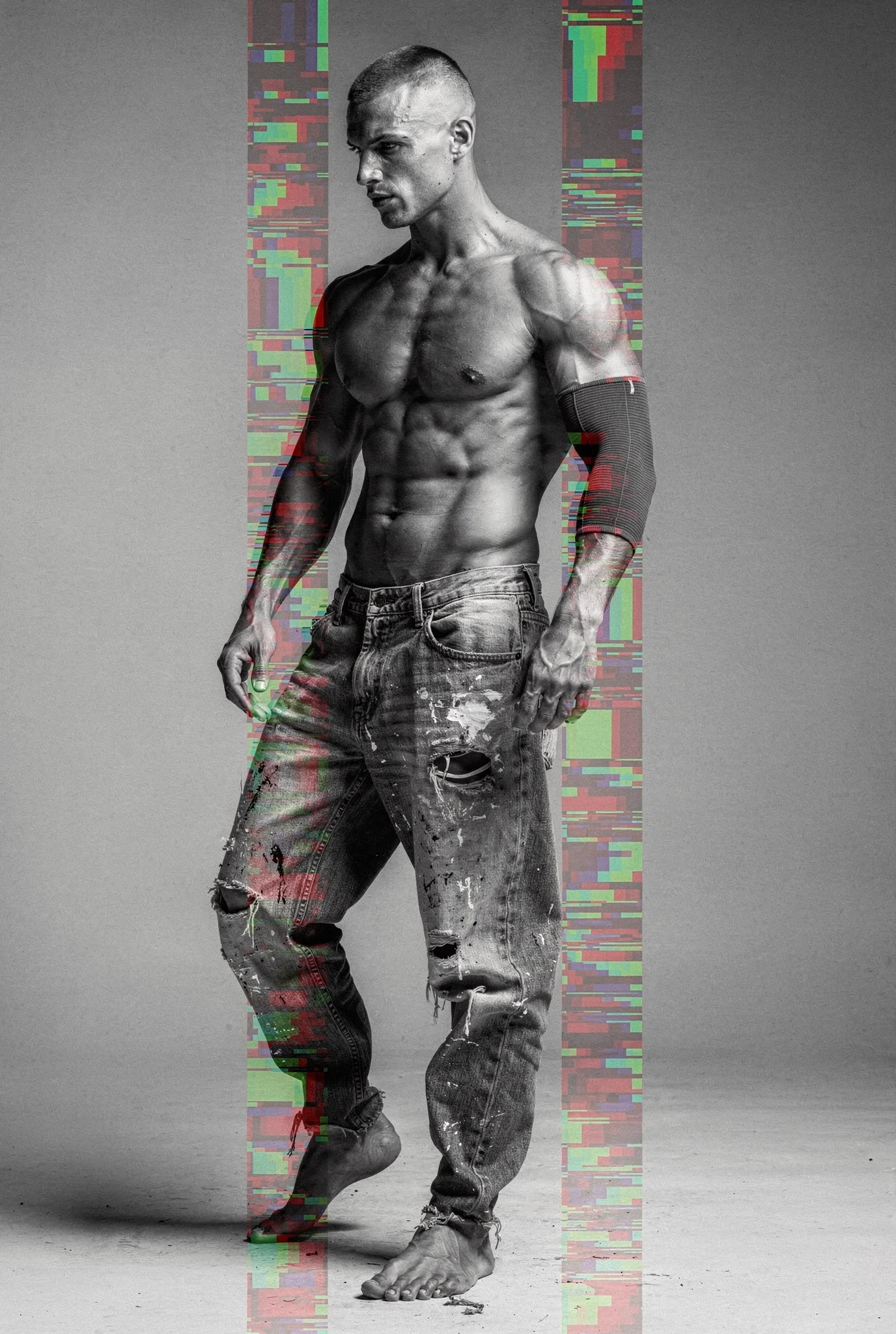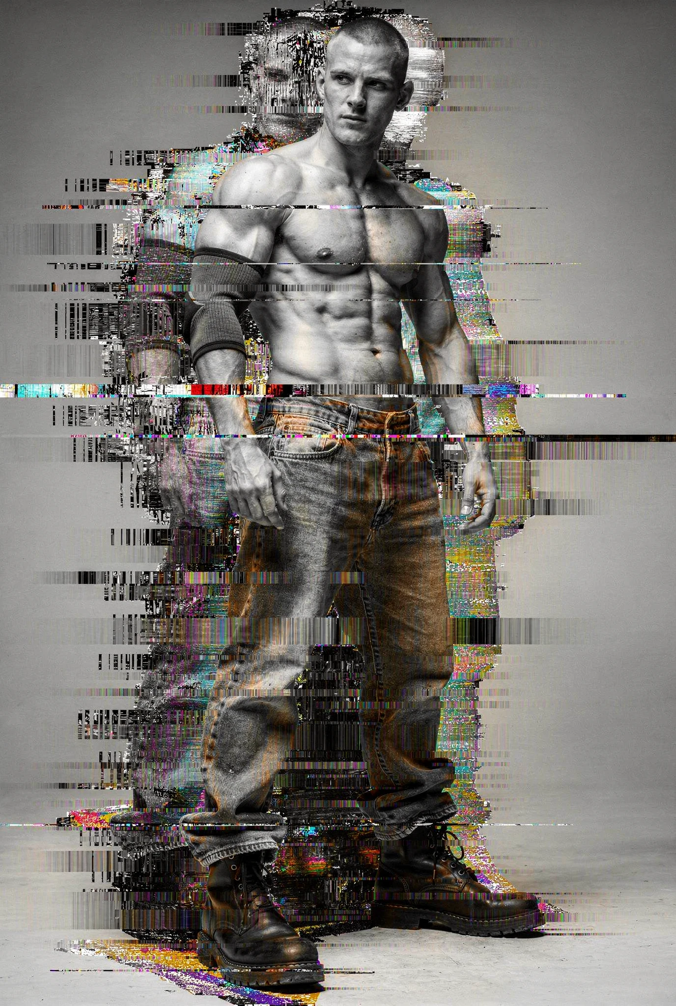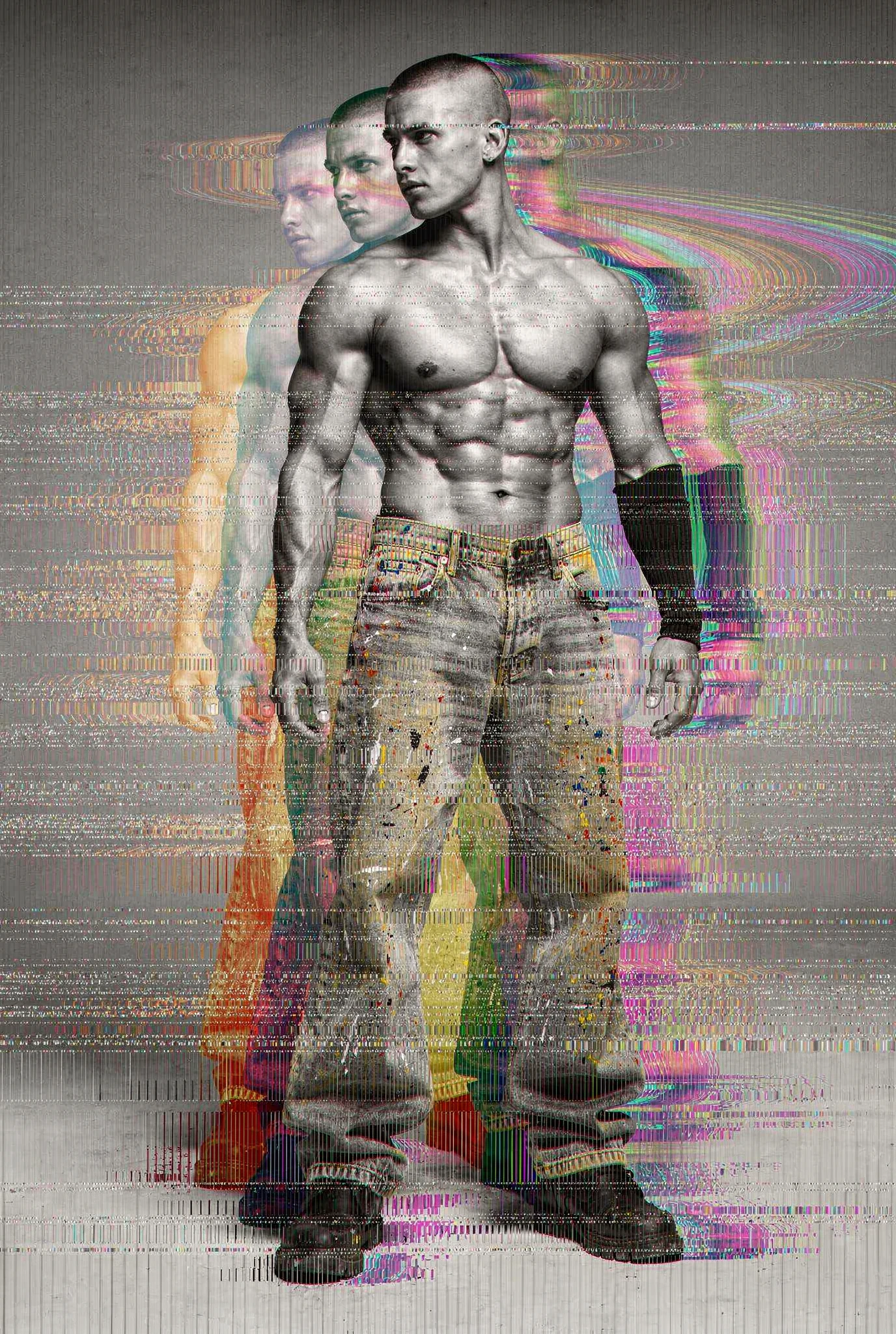 Black-and-white male portraits are presented as sites of interference. The body, traditionally treated as a stable ideal in photographic history, becomes a carrier signal disrupted by colour incursions, temporal echoes, and structural shifts. Distortions slice, duplicate, stain, and displace, yet they do not conceal form — they clarify it, because the eye searches harder when coherence begins to collapse. Beauty emerges not from perfection but from resistance, from the tension between anatomical order and electronic accident. Each figure stands inside a field of breakdown, composed and uncomposed at once, an image both present and in the process of vanishing before us.