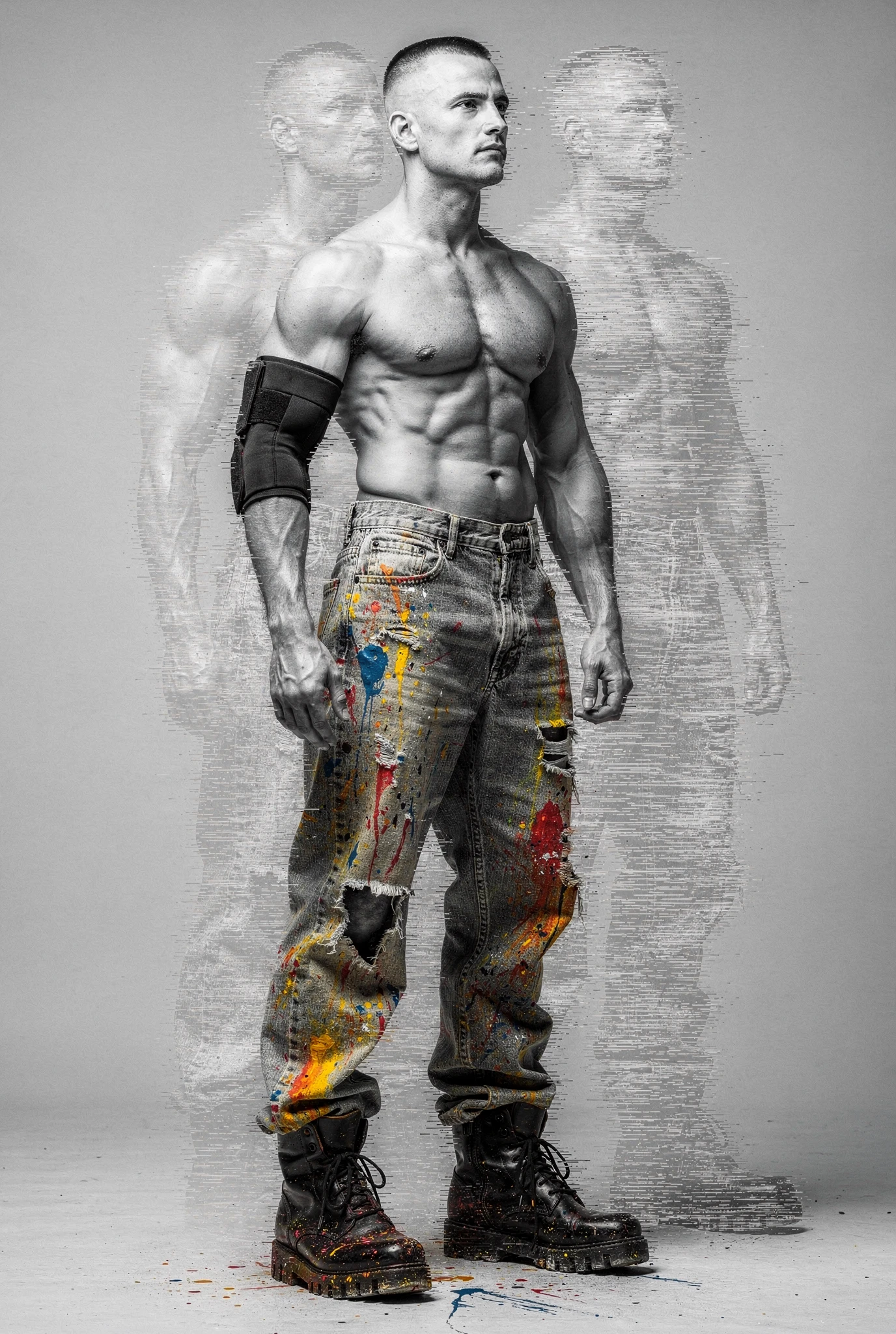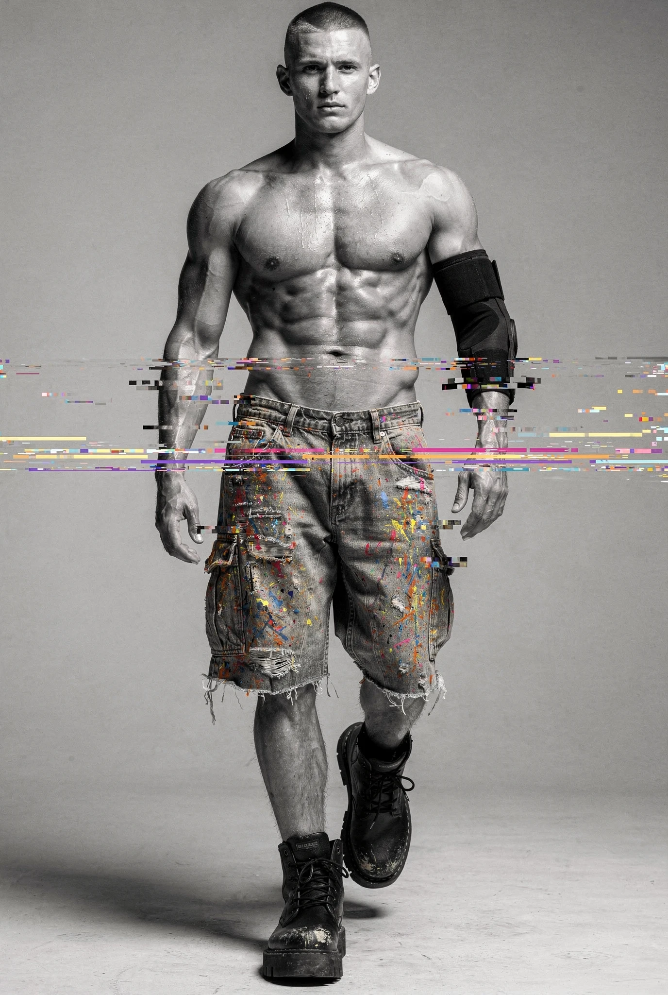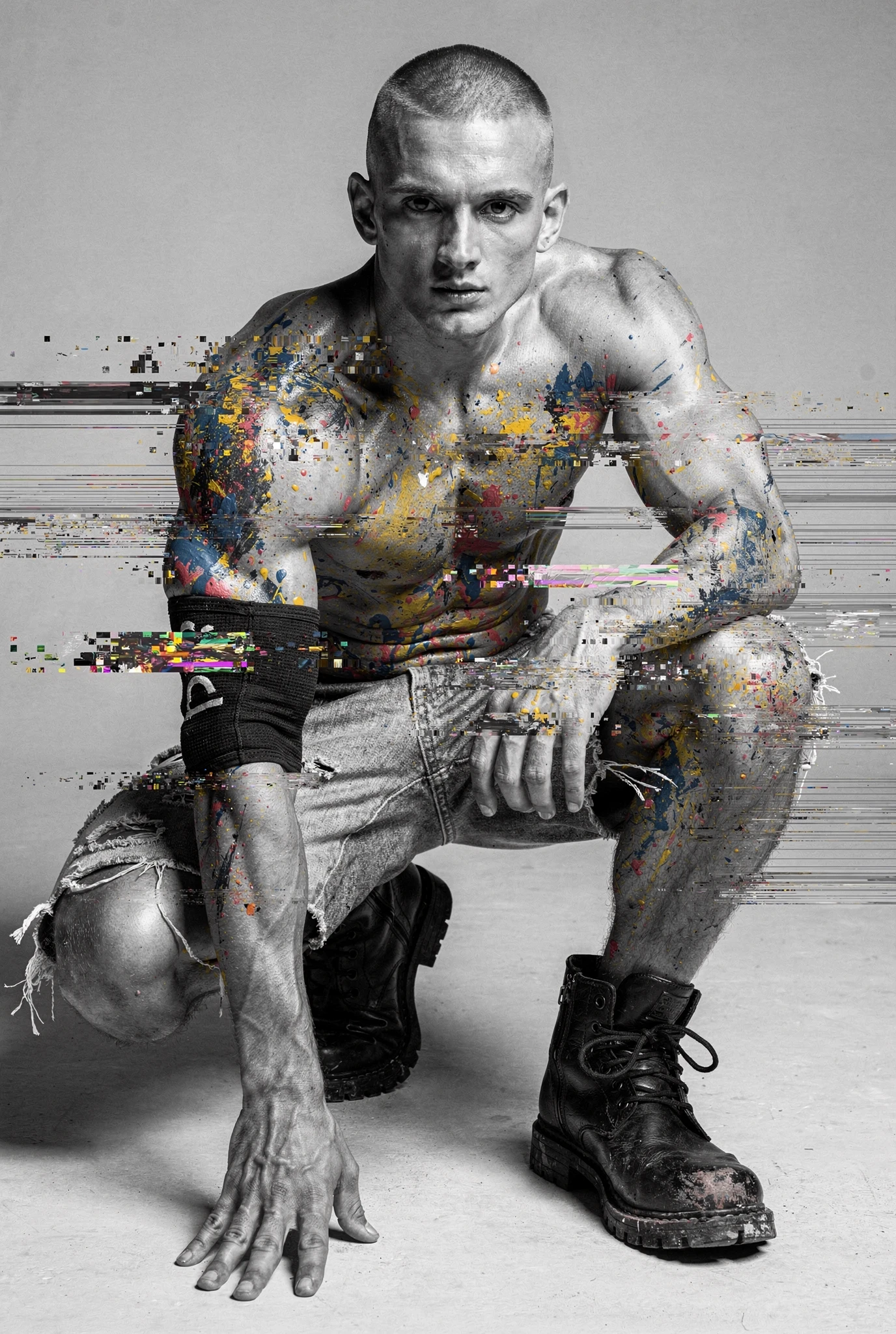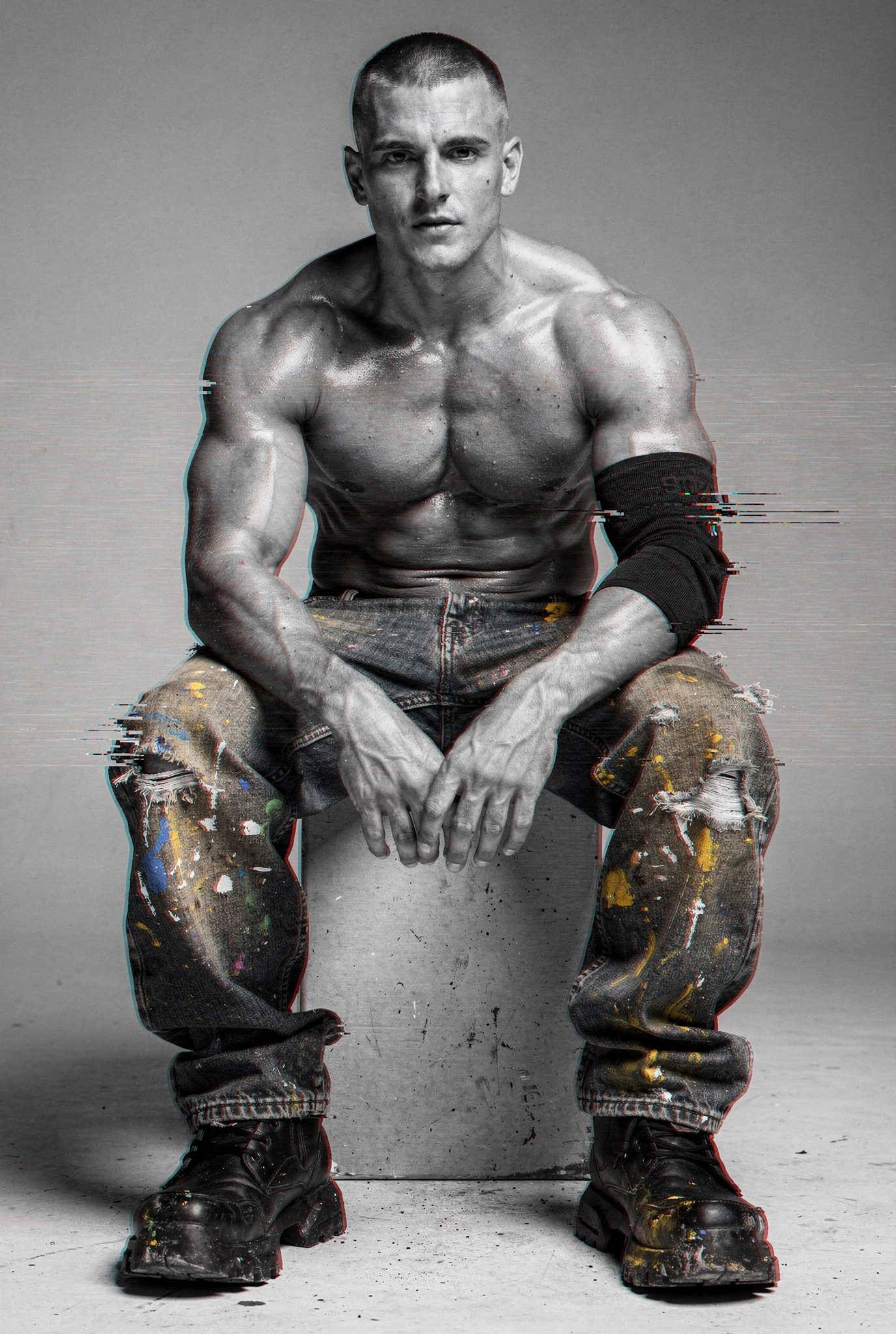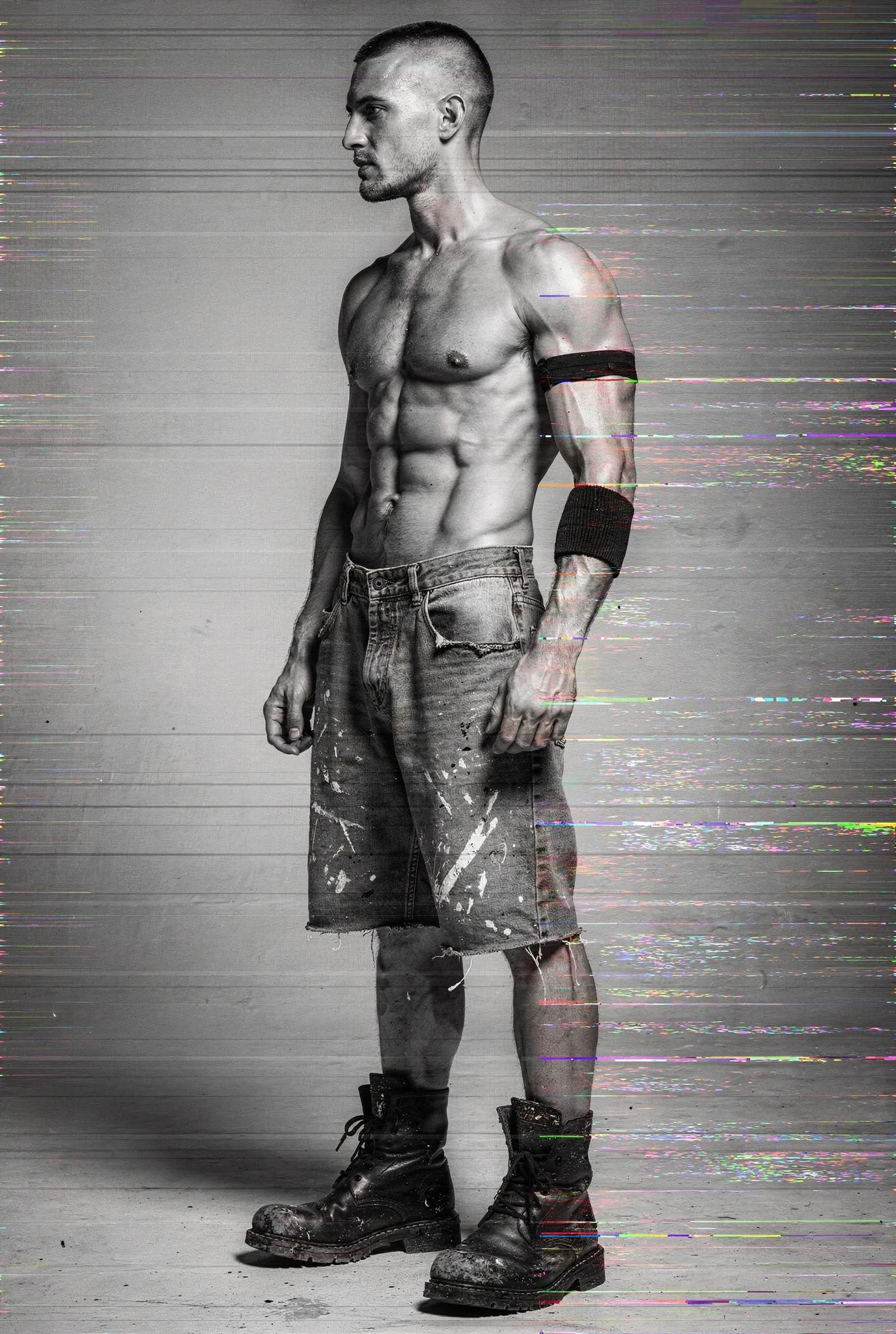 Black-and-white male portraits are presented as sites of interference. The body, traditionally treated as a stable ideal in photographic history, becomes a carrier signal disrupted by colour incursions, temporal echoes, and structural shifts. Distortions slice, duplicate, stain, and displace, yet they do not conceal form — they clarify it, because the eye searches harder when coherence begins to collapse. Beauty emerges not from perfection but from resistance, from the tension between anatomical order and electronic accident. Each figure stands inside a field of breakdown, composed and uncomposed at once, an image both present and in the process of vanishing before us.