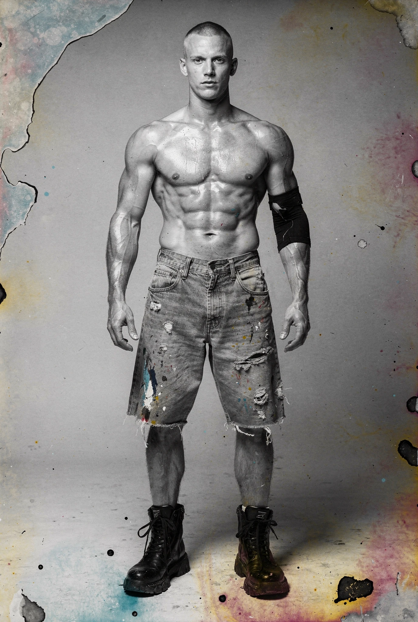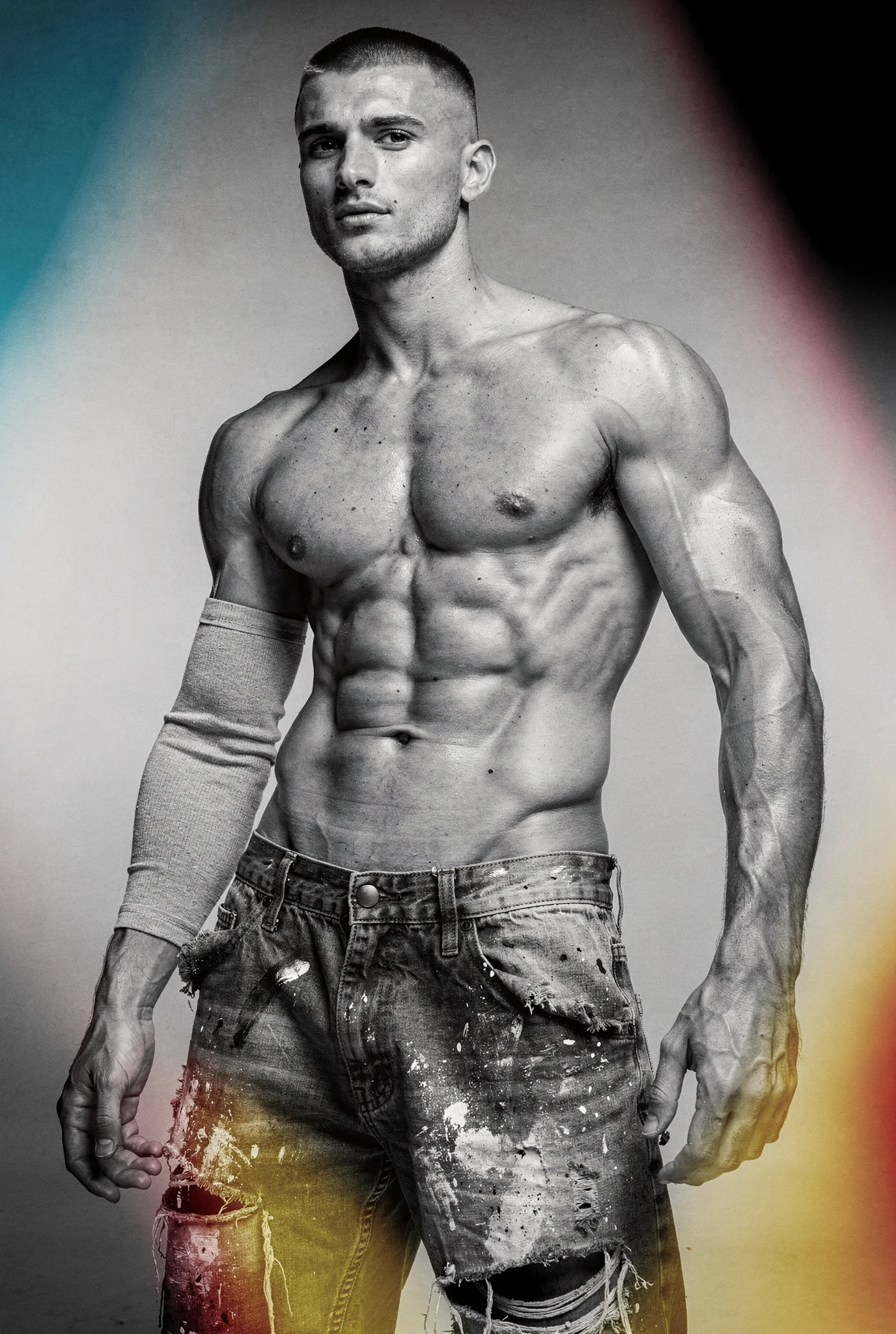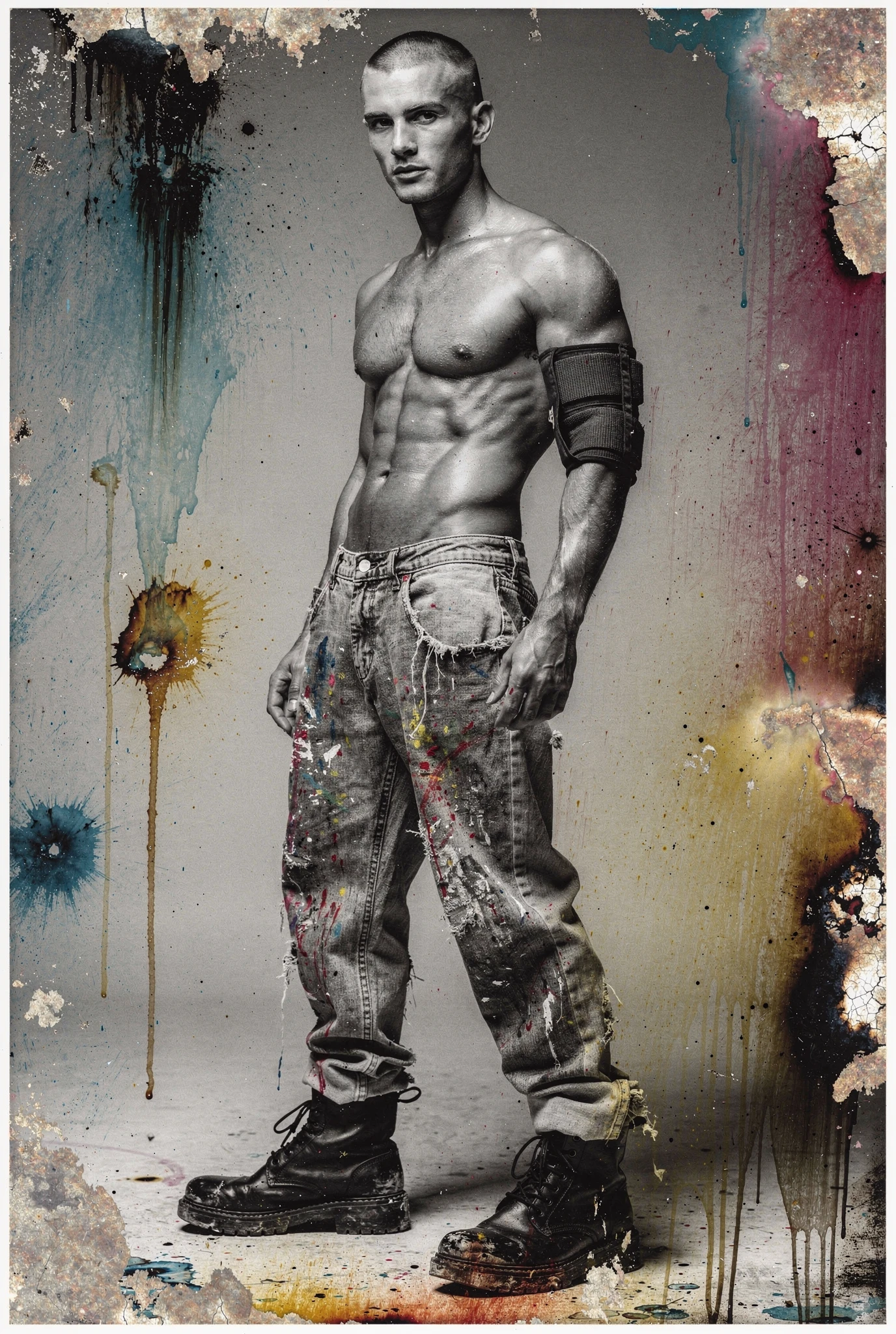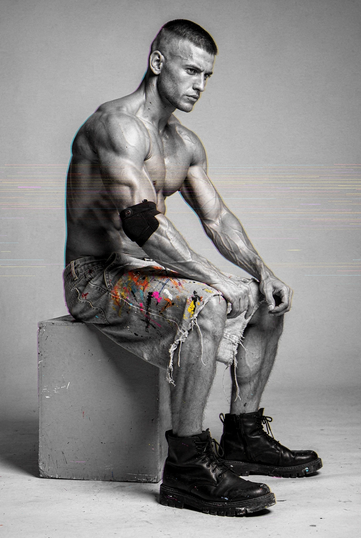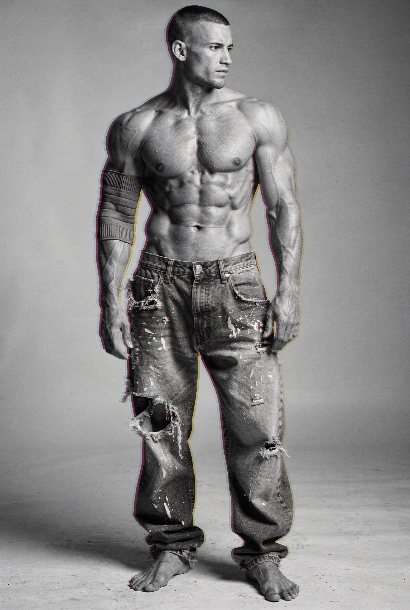 Black-and-white male portraits are presented as sites of interference. The body, traditionally treated as a stable ideal in photographic history, becomes a carrier signal disrupted by colour incursions, temporal echoes, and structural shifts. Distortions slice, duplicate, stain, and displace, yet they do not conceal form — they clarify it, because the eye searches harder when coherence begins to collapse. Beauty emerges not from perfection but from resistance, from the tension between anatomical order and electronic accident. Each figure stands inside a field of breakdown, composed and uncomposed at once, an image both present and in the process of vanishing before us.
