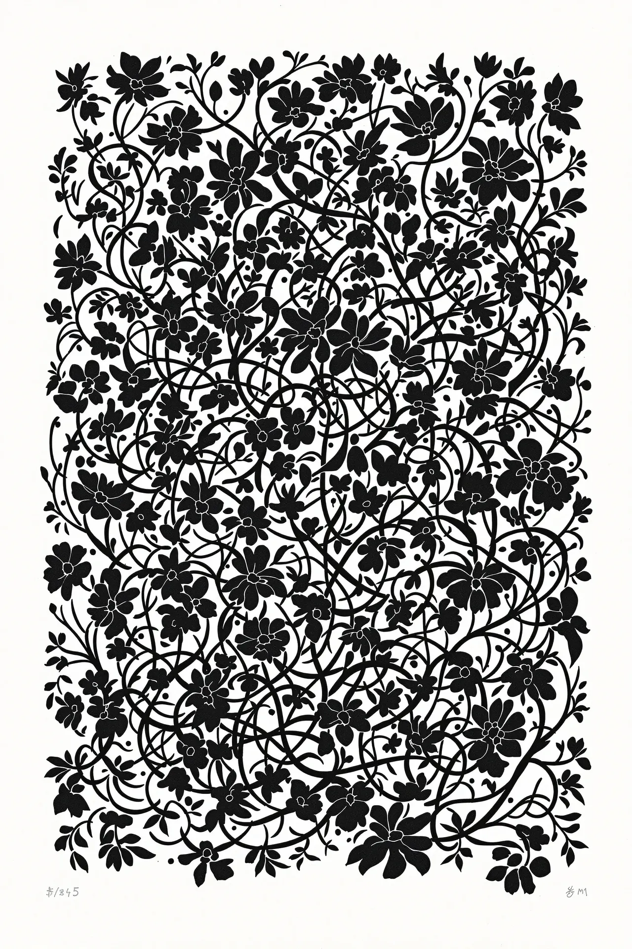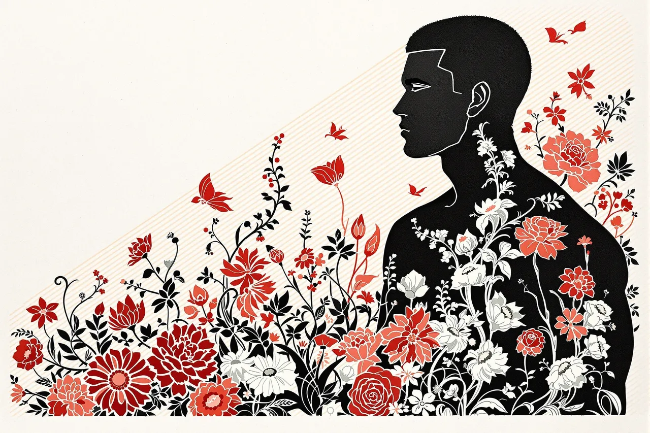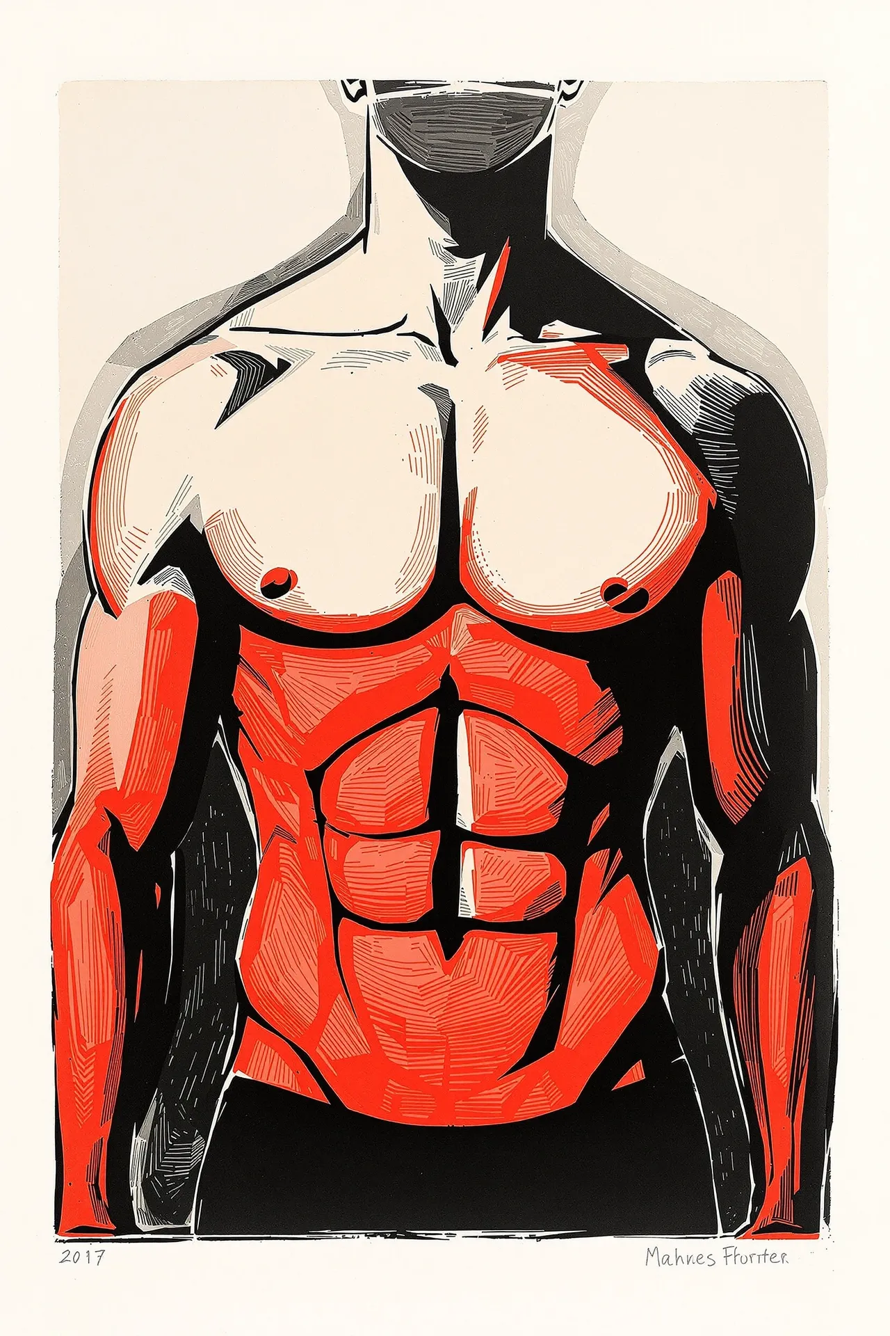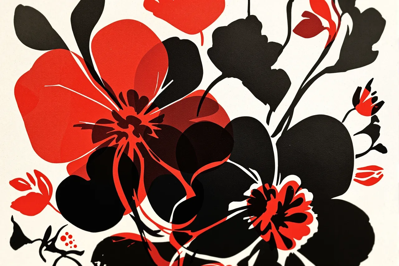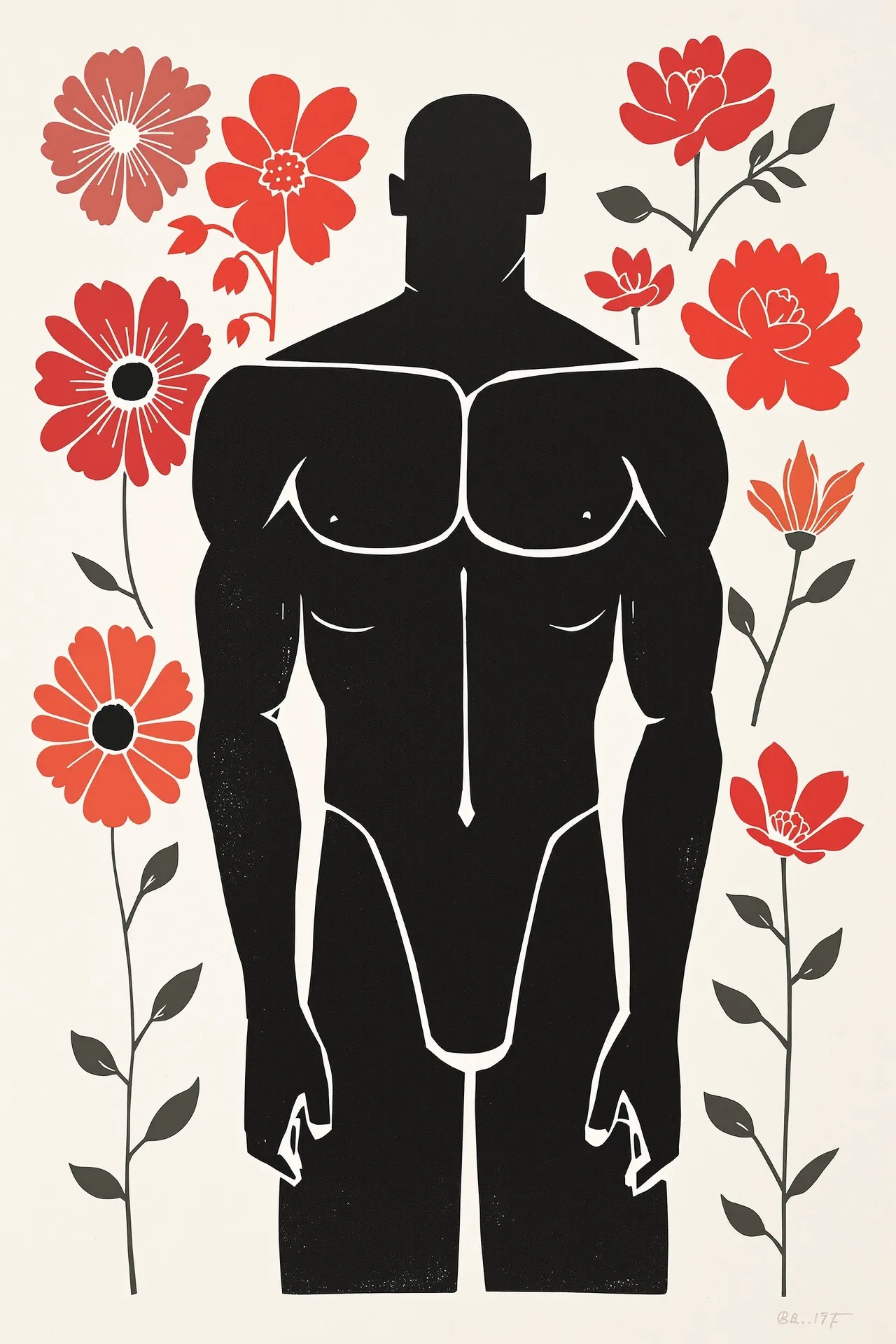 Alongside this material evolution runs a symbolic pairing of subject matter — the floral motif and the male body. These elements recur in varying configurations, sometimes separate, sometimes entwined. Flowers stand in for repetition, variation, and ornament. The male figure — carved into angular planes with a strong physical presence — offers a sense of quiet solidity. The colour palette was intentionally constrained: black, red, grey, and white. These colours carry printmaking associations, but also serve to focus the images — eliminating decorative excess in favour of clarity and structure. Some images bear artificial signatures or edition numbers — hallucinated by Flux itself. Rather than erase these marks, they have been embraced as artefacts of the process, accepted as part of the medium's distortion. What you see is exactly what Flux produced. Incis does not attempt to reproduce traditional printmaking. Instead, it explores how digital tools can echo manual techniques — not by replicating them, but by remembering what they felt like.