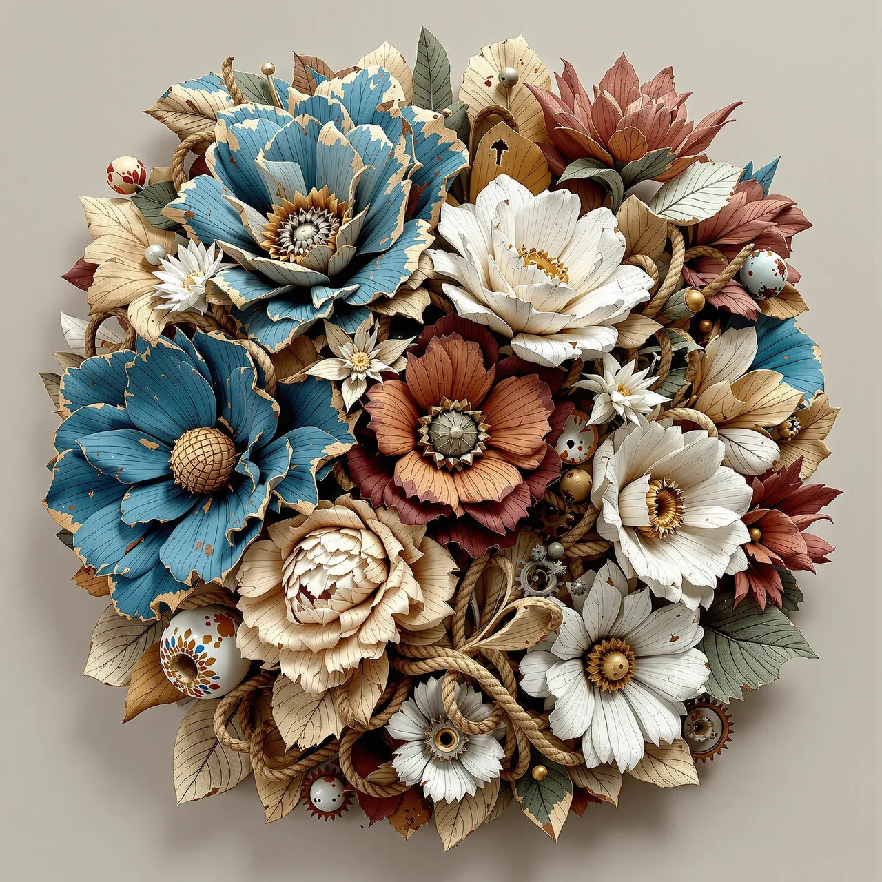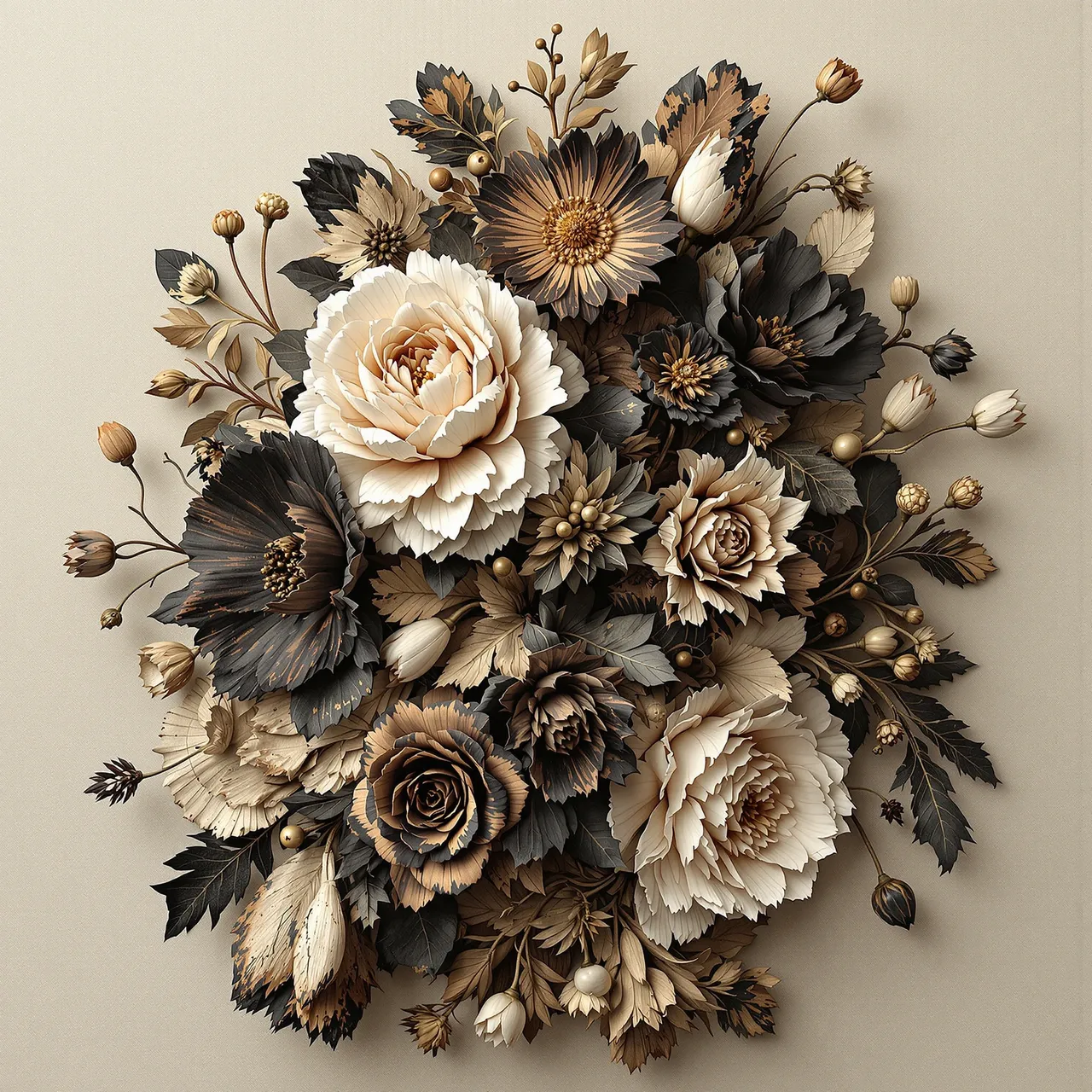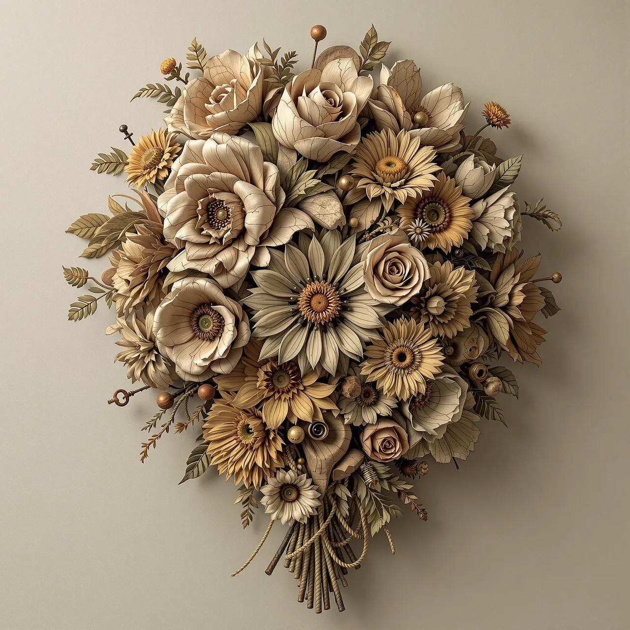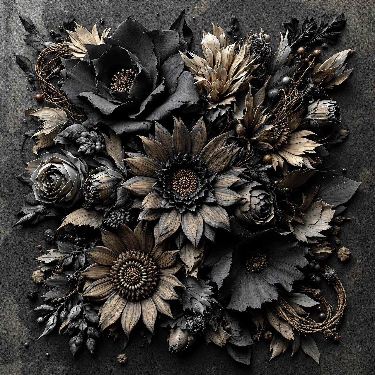 Artificial intelligence has shattered the boundaries between the imagined and the real. These flowers are not flowers. Neither are they wood. They are not painted, carved, or photographed. They are synthographs — sculptural hallucinations crafted from data, structured with language, and rendered with an impossible material fidelity. The petals carry the weight of their past; ghosts of colour cling to their edges, and the tension between fragility and permanence is preserved in exquisite detail. The aesthetic is one of controlled entropy: wabi-sabi meets the surreal, chance meets craftsmanship. What remains is something tactile and evocative. These are artefacts that do not exist physically — yet they confuse the mind because they are so convincing. They force you to question the nature of reality.