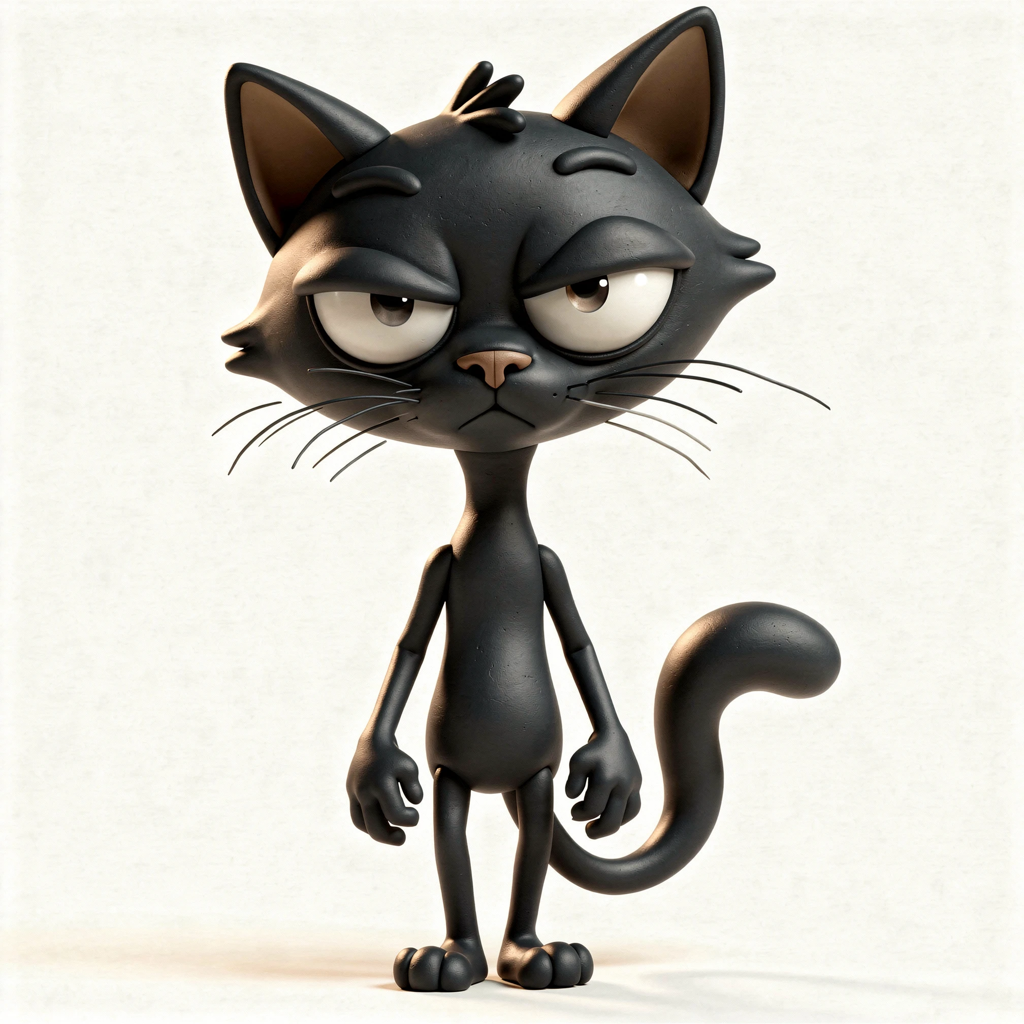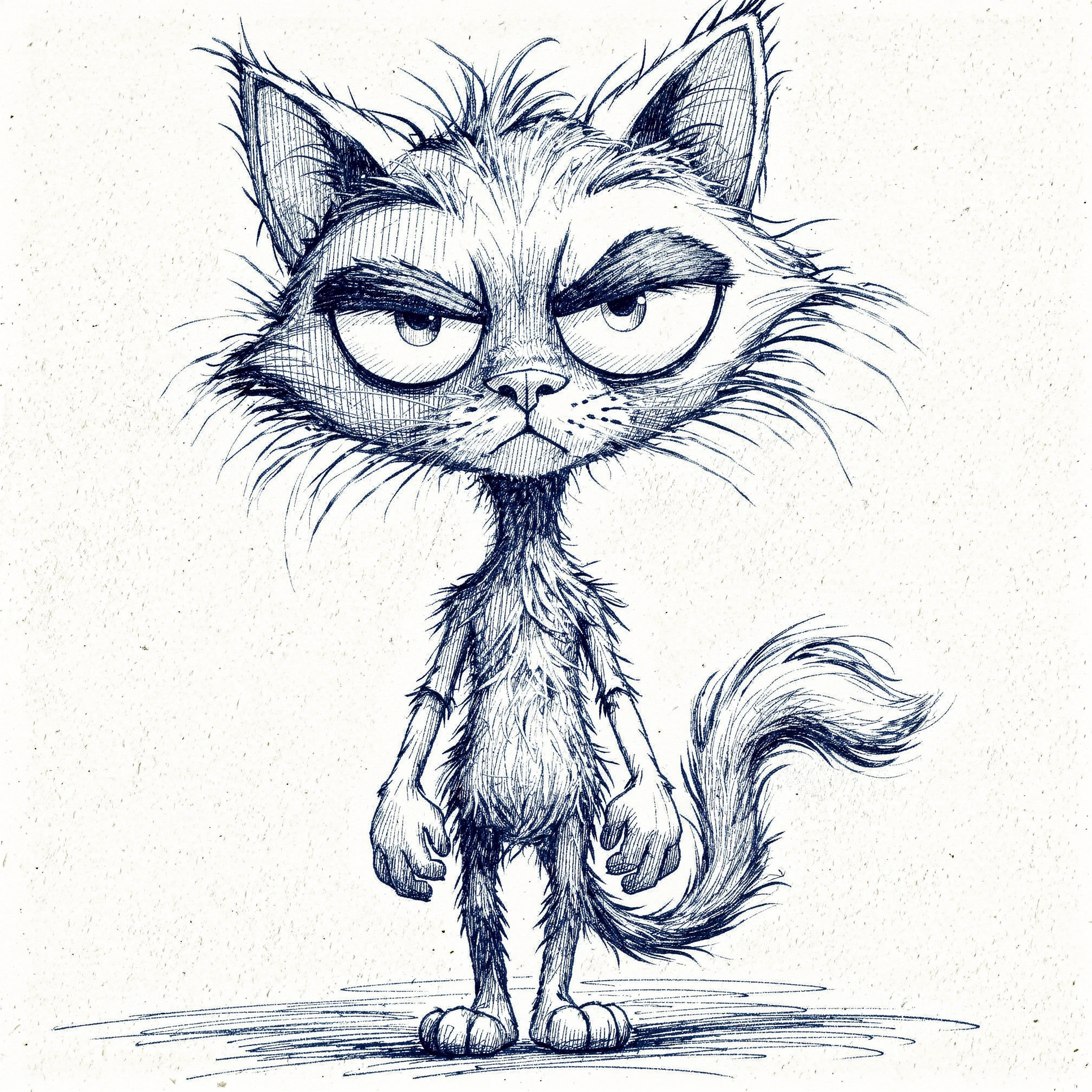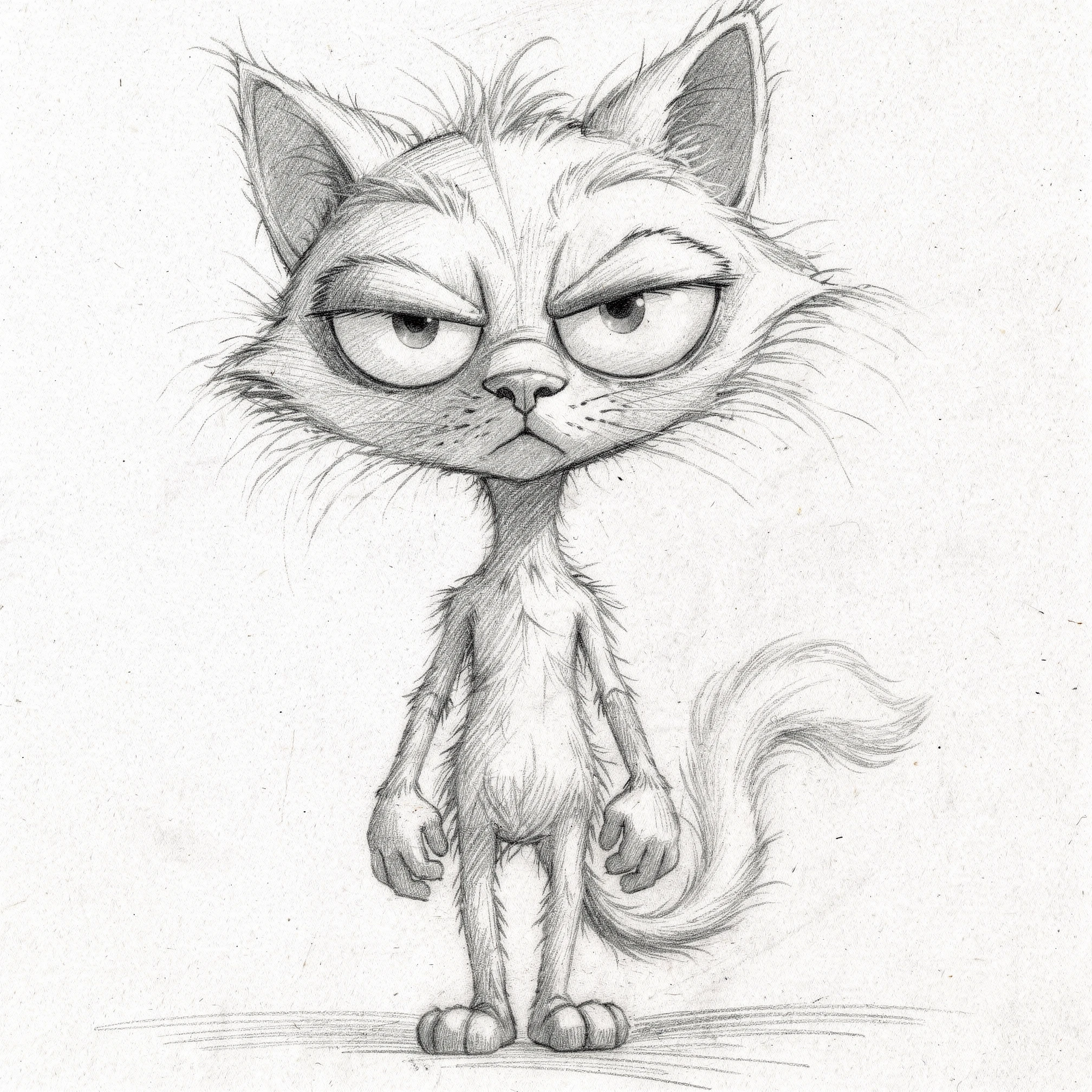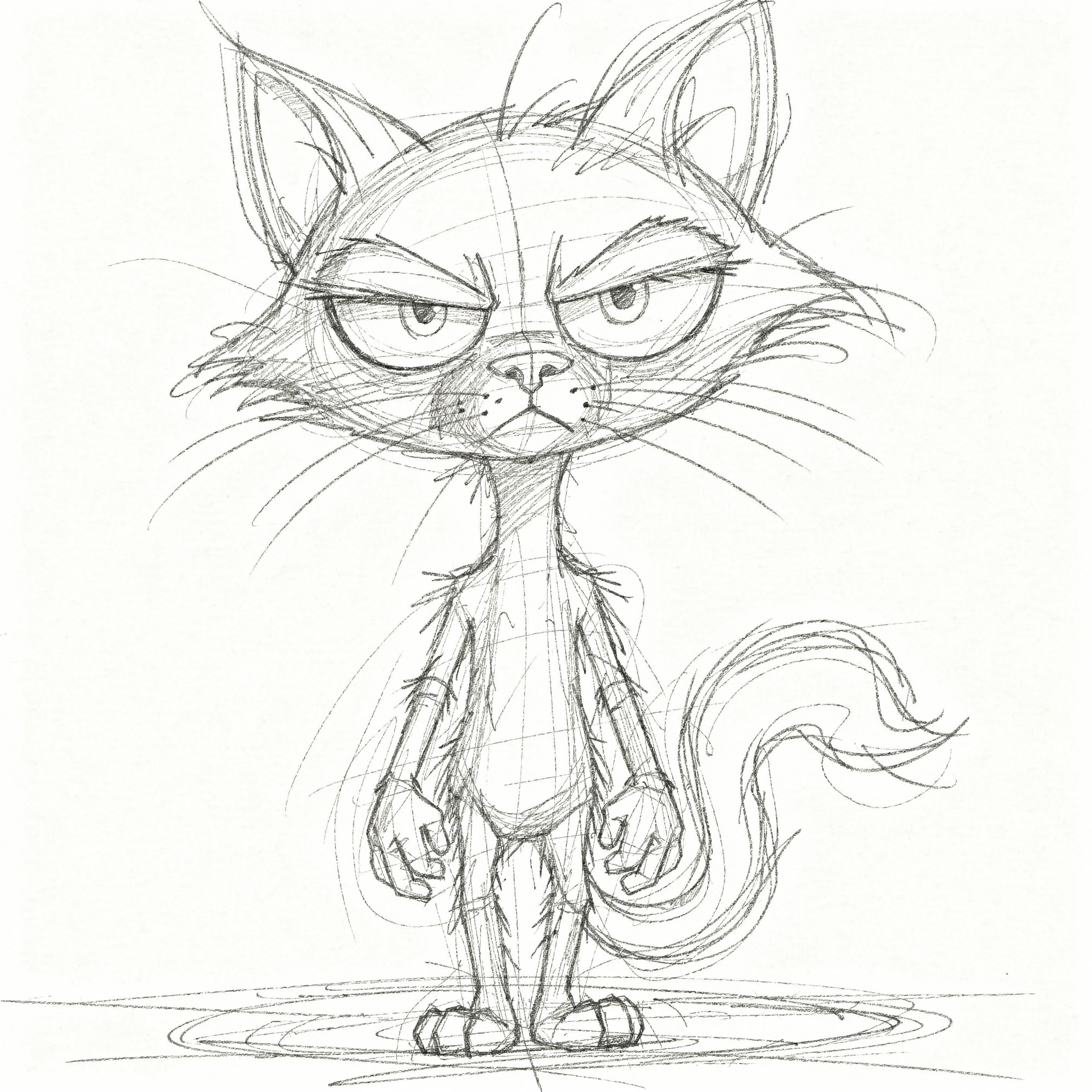 Osuneko is a Japanese term meaning male cat — osu denoting maleness, neko meaning cat — a simple, functional name for a character who resists embellishment. The project presents a single character held constant while everything around him shifts. Across eighteen images, the same cat appears to pass through a familiar arc of artistic development: from loose pencil gesture to tightened line, from ink to colour, from suggestion to volume, and finally into a fully realised three-dimensional presence. The cat's power lies in being slightly feral, a bit underloved, and absolutely unimpressed by the world's nonsense. His expression barely changes, yet his form is repeatedly translated — not to tell a story, but to test how identity survives repetition. Osuneko does nothing in particular. He simply exists, and in doing so invites projection: attitude, history, mischief, indifference.