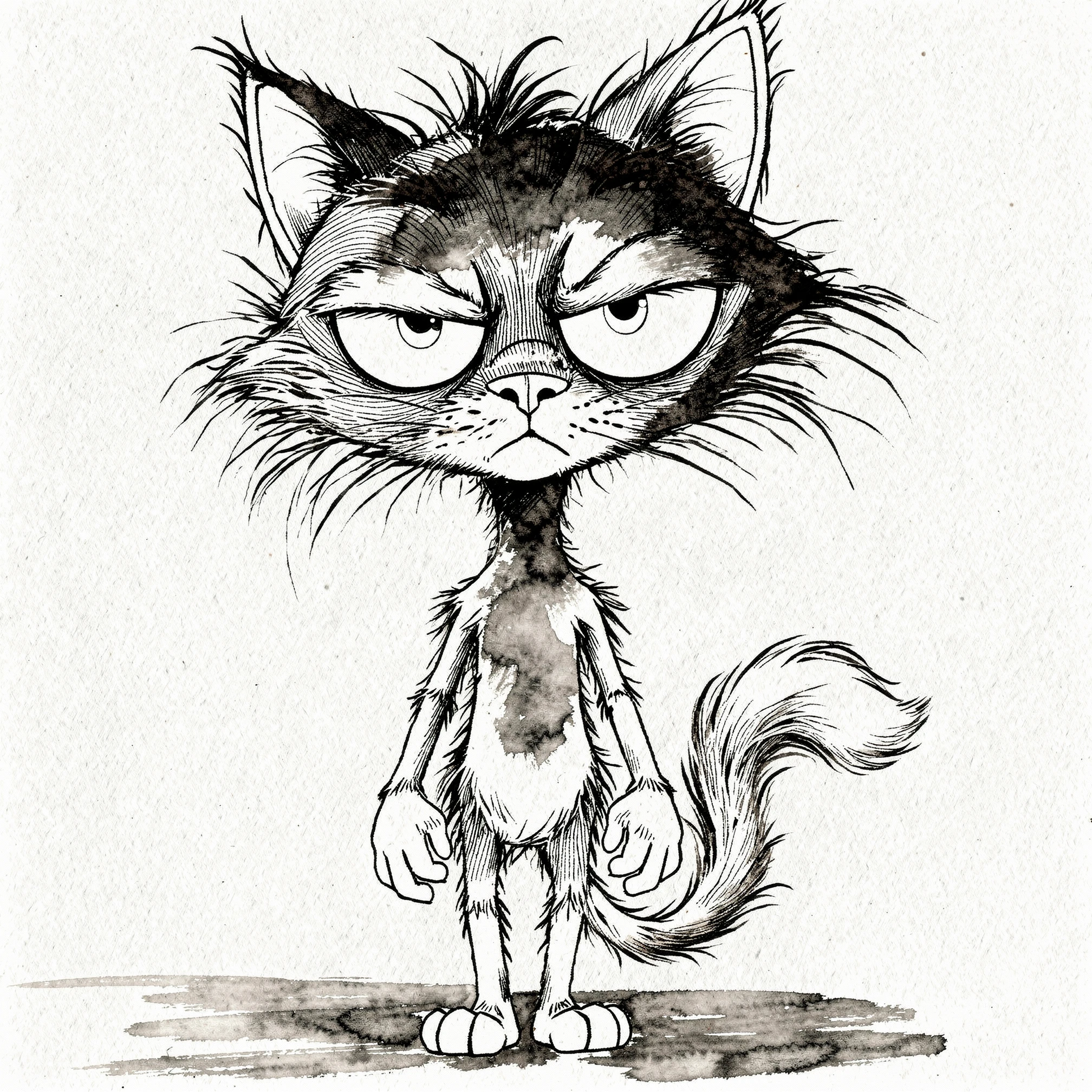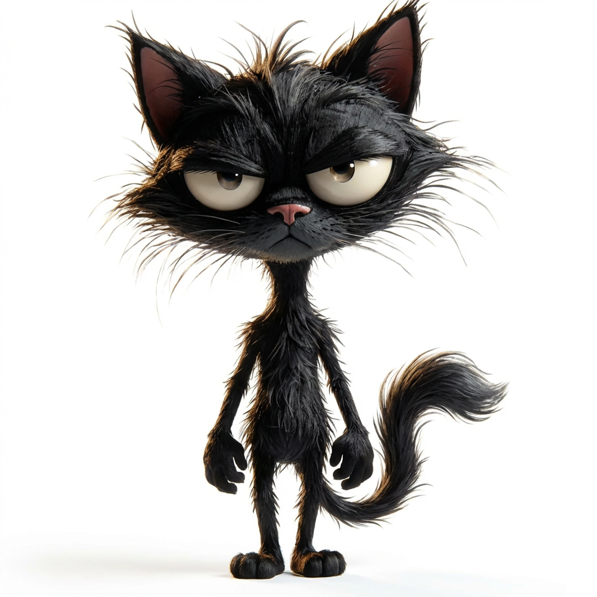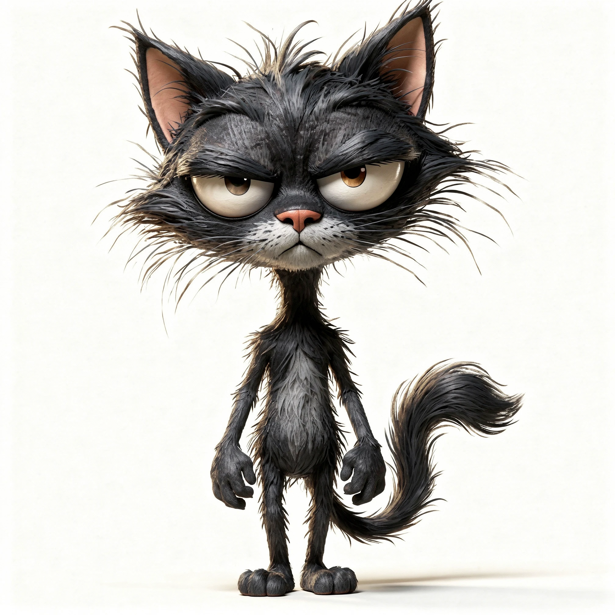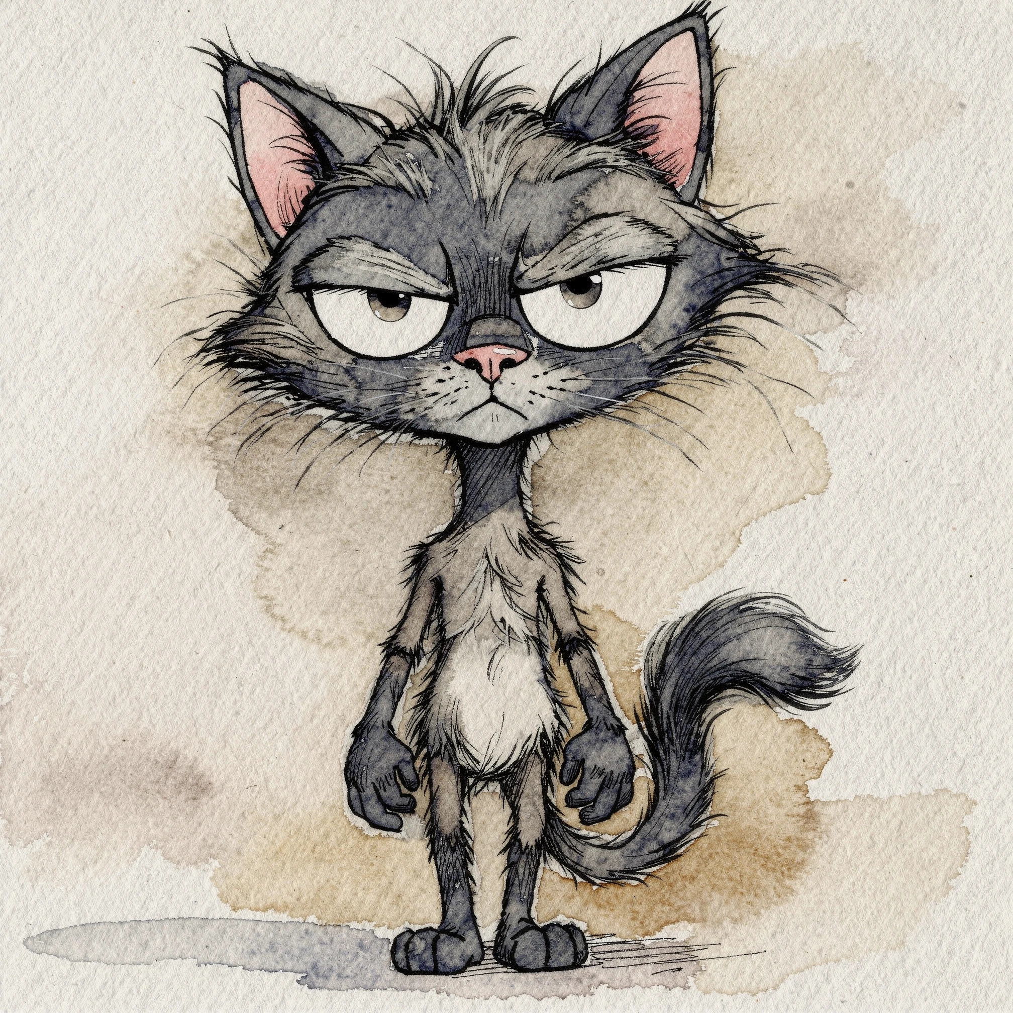 Osuneko is a Japanese term meaning male cat — osu denoting maleness, neko meaning cat — a simple, functional name for a character who resists embellishment. The project presents a single character held constant while everything around him shifts. Across eighteen images, the same cat appears to pass through a familiar arc of artistic development: from loose pencil gesture to tightened line, from ink to colour, from suggestion to volume, and finally into a fully realised three-dimensional presence. The cat's power lies in being slightly feral, a bit underloved, and absolutely unimpressed by the world's nonsense. His expression barely changes, yet his form is repeatedly translated — not to tell a story, but to test how identity survives repetition. Osuneko does nothing in particular. He simply exists, and in doing so invites projection: attitude, history, mischief, indifference.