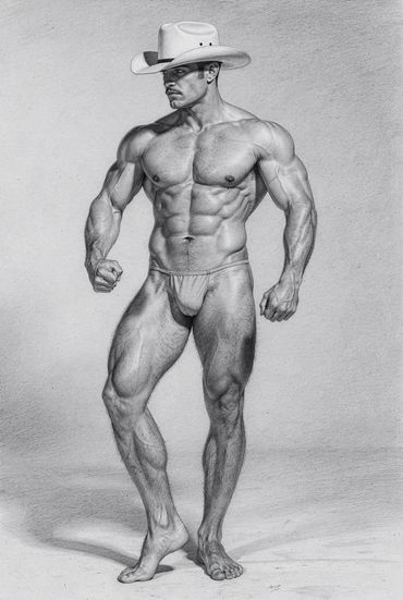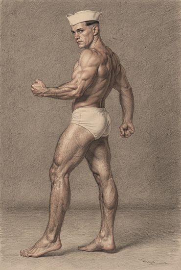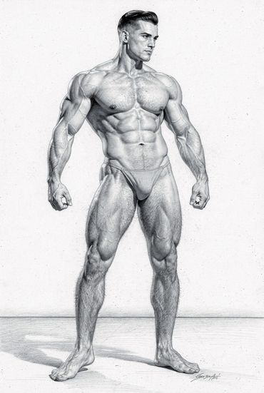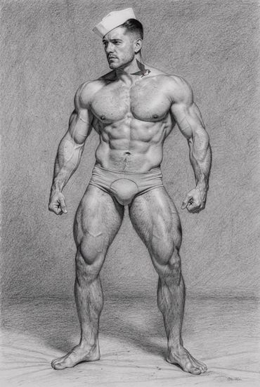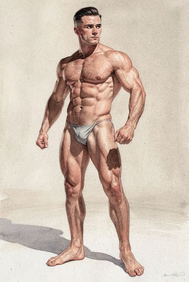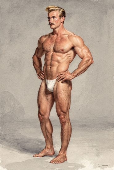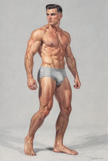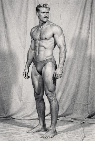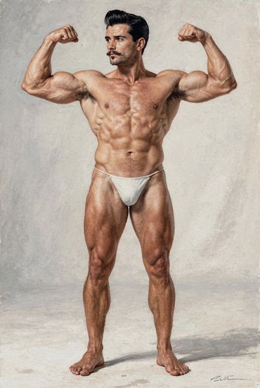Running through Pictoria is a dialogue between these histories and the later precision of Robert Mapplethorpe. Where Mizer encoded desire to evade scrutiny, Mapplethorpe exposed it with formal exactness, transforming flesh into object and statement. Pictoria occupies the space between these approaches. Photographic images behave like polished gelatin-silver prints — controlled, tonal, and exact — while gouache, oil, and pencil studies introduce a second register, one of idealisation. Together they reflect how masculinity and desire have long been constructed across different eras and mediums. Using contemporary generative tools, the project does not imitate these histories but re-reads them, exploring how men and their bodies can be presented in the age of artificial intelligence.