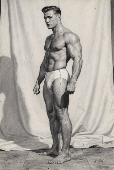 Bob Mizer’s Physique Pictorial stands at the centre of this tradition. Its figures are athletic, composed, and often arranged in contrapposto or classical twists that recall sculpture as much as sport. The emphasis was not flamboyance but restraint: clean backgrounds, controlled lighting, and poses that presented the body as evidence rather than spectacle. Alongside photography, illustration played a parallel role in shaping gay visual culture. Artists such as George Quaintance refined the male form into an idealised, almost pastoral vision of masculinity, while Tom of Finland pushed the drawn body toward erotic insistence and graphic clarity. Pencil and paint allowed desire to move beyond documentation into projection, exaggeration, and fantasy, filling gaps where photography could not safely go.
