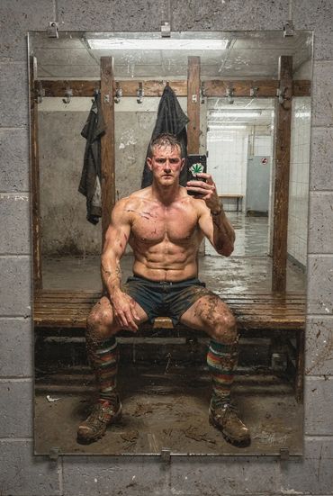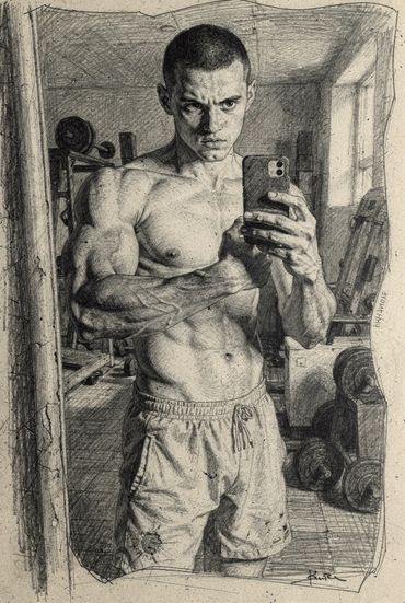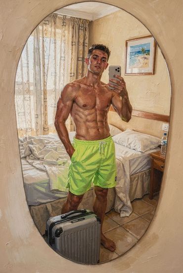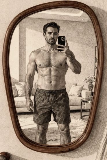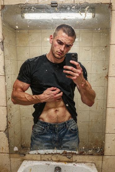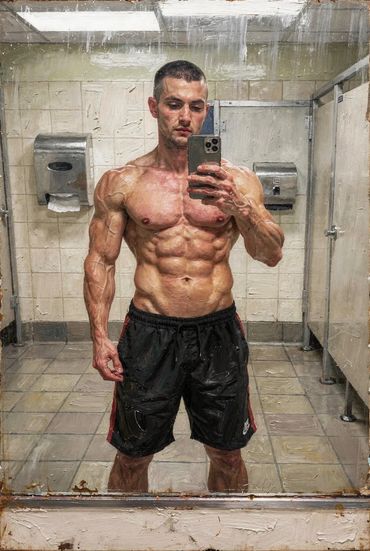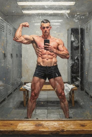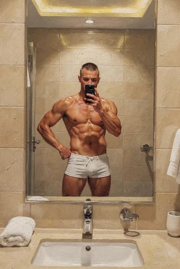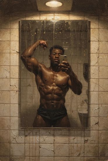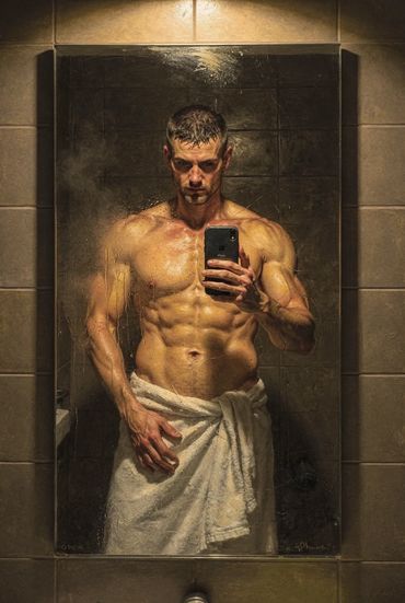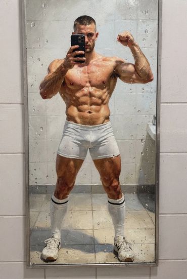 Just reaching out, bro… thanks for the follow. You into fitness? At the heart of Selfie is a man alone with his smartphone — flexing, posing, teasing, documenting his own body as though reporting to an unseen audience. The men in these synthographs don’t exist, yet they still want to be admired by people they don’t know, for reasons they can’t explain. It’s beautiful, ridiculous, erotic, shallow, tender, vain, and true. Straight boys are obsessed with each other — their gains, their rituals, their progress pics, their underwear. Instagram is a cathedral of male vanity, and the mirror selfie is its central liturgy. Meal plans. Testosterone boosters. Endless abs. Bottomless egos. Men are strange creatures: confident, competitive, insecure. A mass of muscle and contradictions. You can look, but please don’t touch.