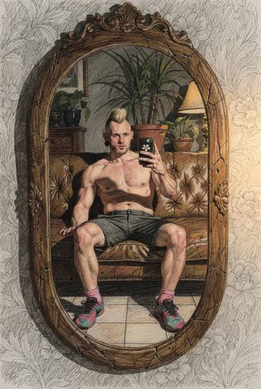 This is my first full engagement with Flux.2 Pro, and the results mark a shift. These are digital hallucinations rendered to resemble oil paintings, or pencil drawings. By stripping away the high-definition polish of the smartphone, the images rise beyond documentation into something more reflective and atmospheric. Unlike Gymnos, with its classical ideals, or Kalos, with its fetishised labour — both made with Flux.1 — this project is more confrontational, depicting private performances staged for public consumption. Technology made this behaviour possible, but the instinct is older. From Rembrandt’s self-portraits to Egon Schiele’s contorted bodies, the mirror has long been a place where the self is examined. Here, in Selfie — the mirror, smudged and imperfect, records everything.