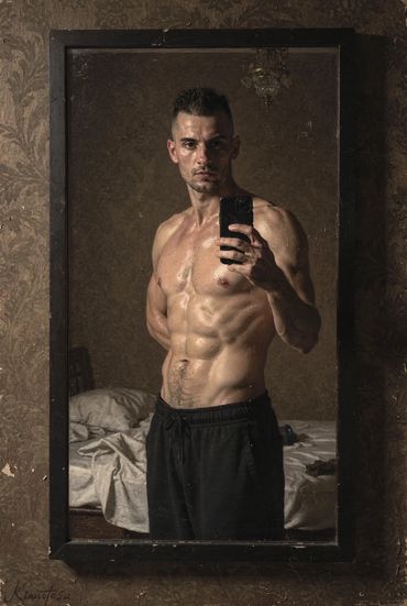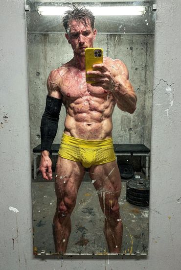The self-referential images “real men” produce today are steeped in homoerotic language even when their makers insist on heterosexual intent. “No homo, bro.” They’re creating gay imagery without realising it, posing in ways shaped by decades of homoerotic photography — Herb Ritts, Mapplethorpe, Bruce Weber, Rick Day — and distributing it inside a heteronormative space. Selfie is a critique and a love letter: cynical and affectionate at the same time. It’s also quietly funny — the over-eager flex, the slightly-too-damp skin, the socks that are doing far too much. These works explore performative masculinity in the age of social media, where competition, vanity, exhibitionism, and aspiration merge into a single gesture: the body offered to the camera by the person who desires the gaze the most.