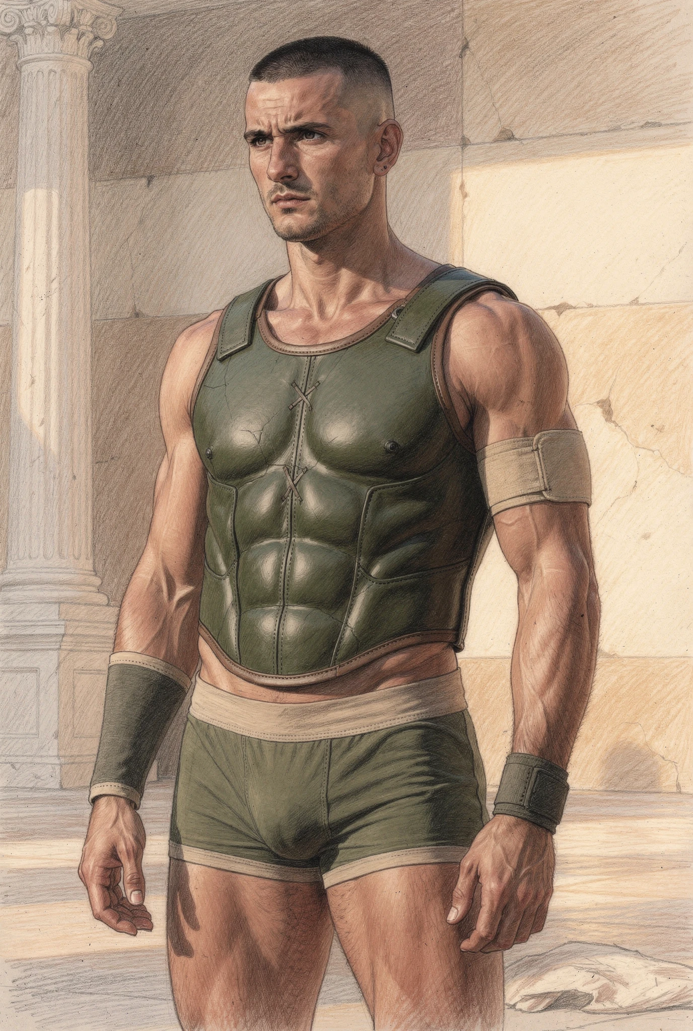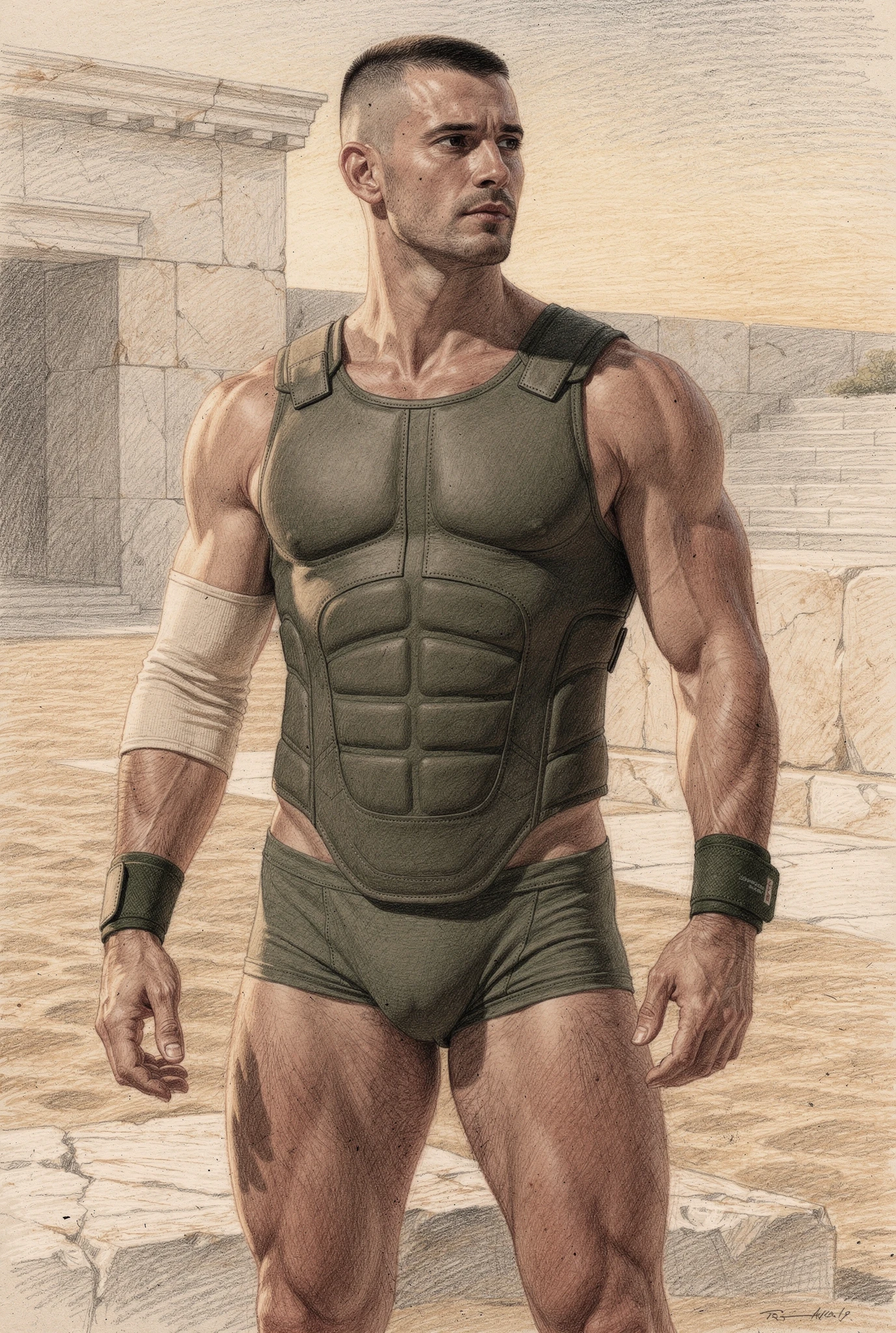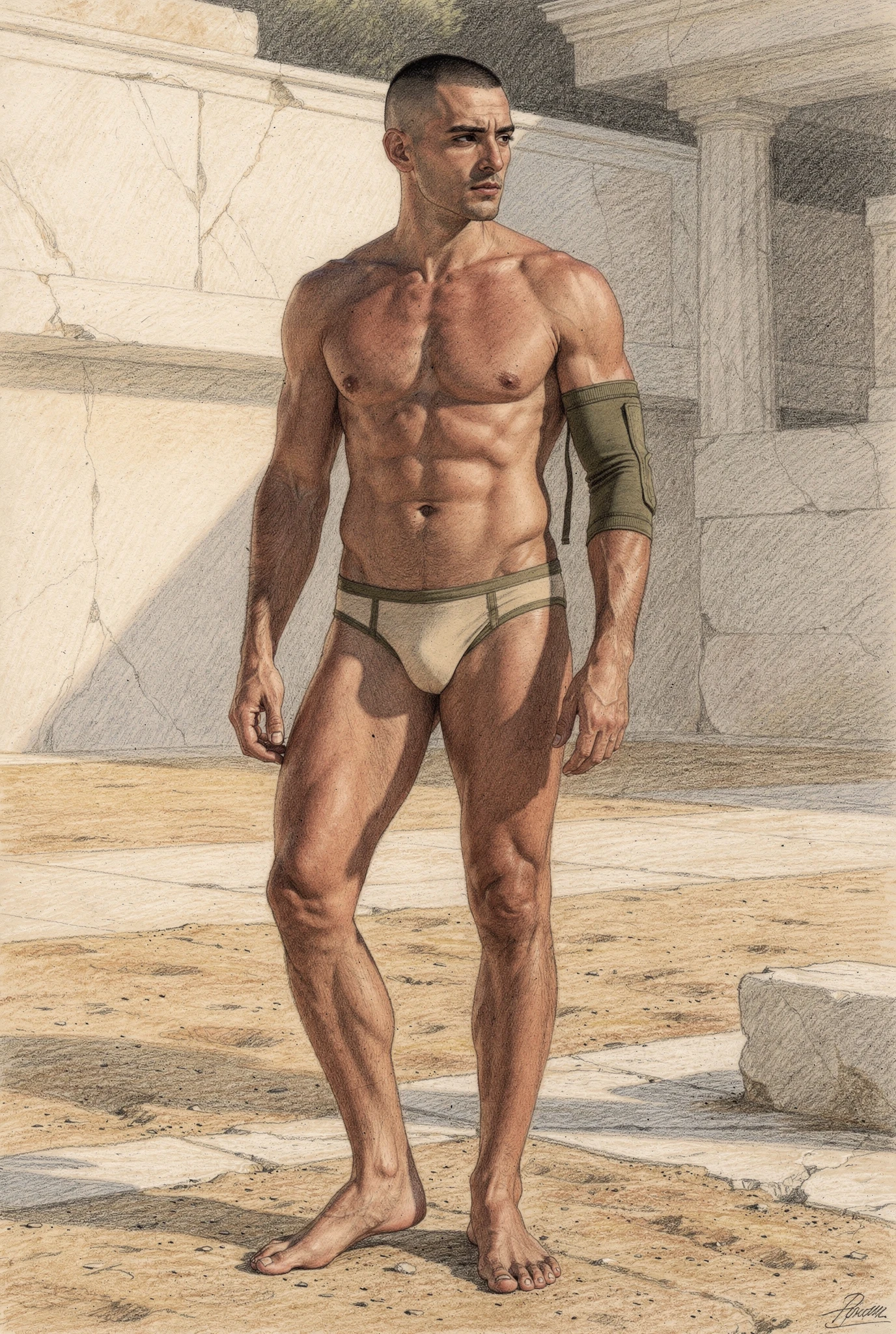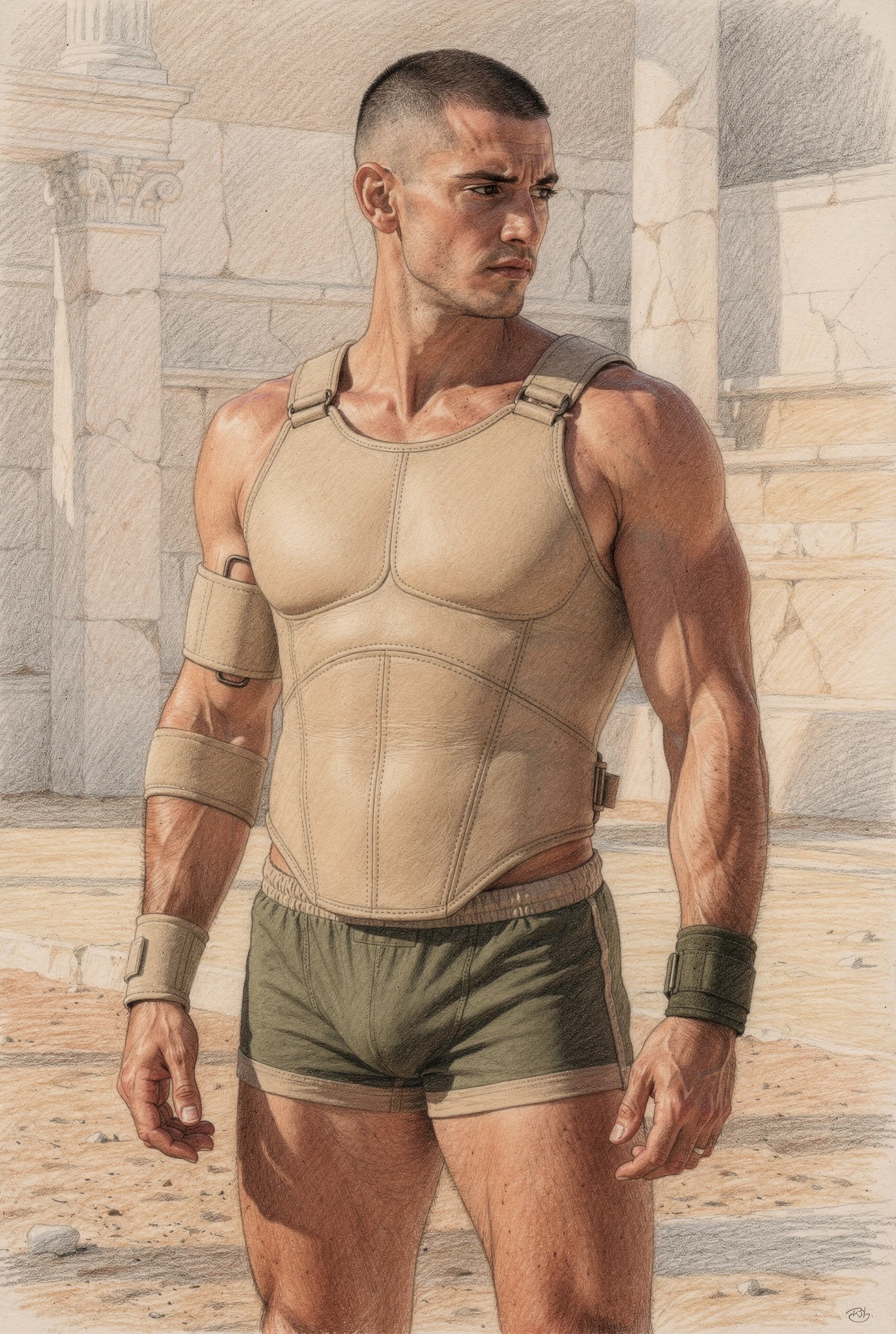 The figures in Soma are not portraits of real men but synthetic bodies rendered as flesh. Their skin is warm, sun-kissed, and shaped by training rather than chance, suggesting lives lived in Mediterranean climates where the body is formed through sport, exercise, and discipline. These bodies are not accidental; they are produced, maintained, and watched. They inhabit abstracted palaestra-like spaces — architectural residues of ancient training grounds — where physique culture, observation, and control converge. Modern garments and accessories situate the figures in contemporary time, while occasional references to the anatomical cuirass recall Roman strategies of power dressing, where armour mirrored an idealised physique rather than concealing it. Rendered through a dual logic in which environments dissolve into graphite while flesh remains chromatic and tactile, the figures appear both archaeological and contemporary, intercepted rather than staged.