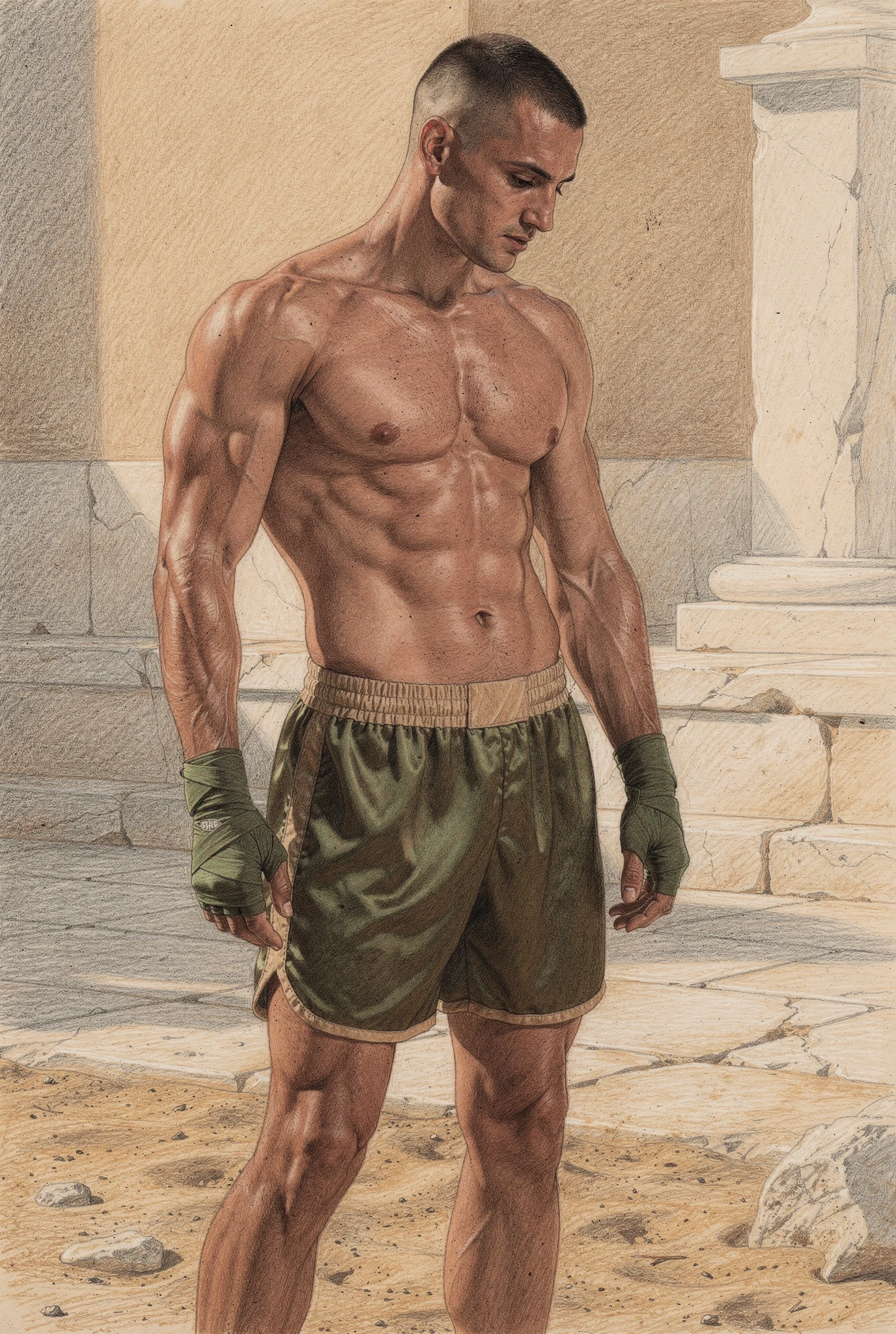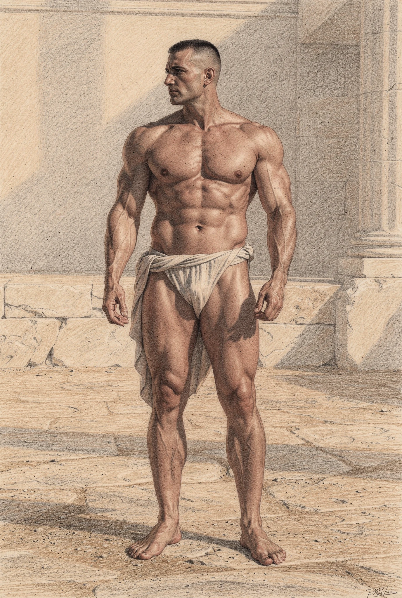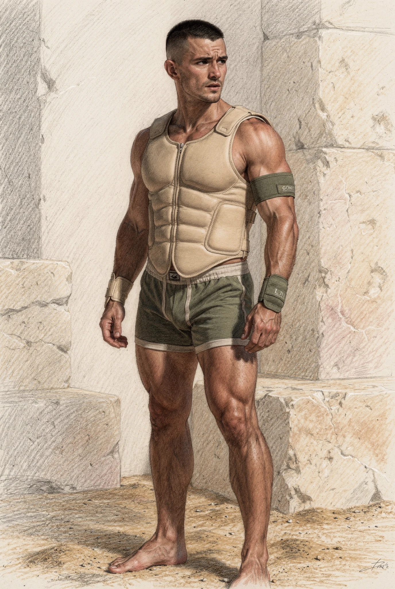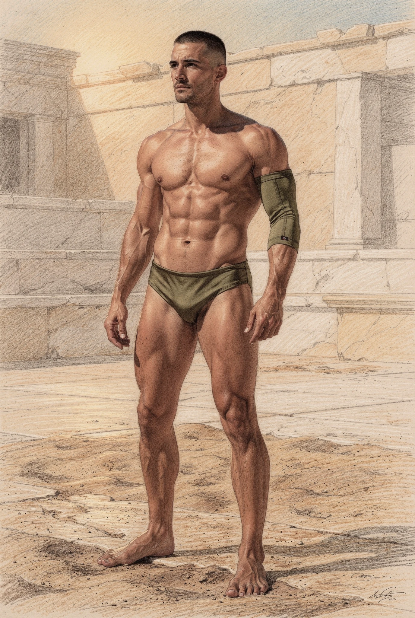 The figures in Soma are not portraits of real men but synthetic bodies rendered as flesh. Their skin is warm, sun-kissed, and shaped by training rather than chance, suggesting lives lived in Mediterranean climates where the body is formed through sport, exercise, and discipline. These bodies are not accidental; they are produced, maintained, and watched. They inhabit abstracted palaestra-like spaces — architectural residues of ancient training grounds — where physique culture, observation, and control converge. Modern garments and accessories situate the figures in contemporary time, while occasional references to the anatomical cuirass recall Roman strategies of power dressing, where armour mirrored an idealised physique rather than concealing it. Rendered through a dual logic in which environments dissolve into graphite while flesh remains chromatic and tactile, the figures appear both archaeological and contemporary, intercepted rather than staged.