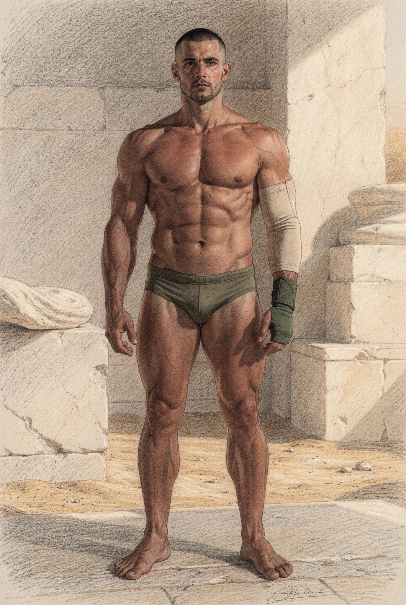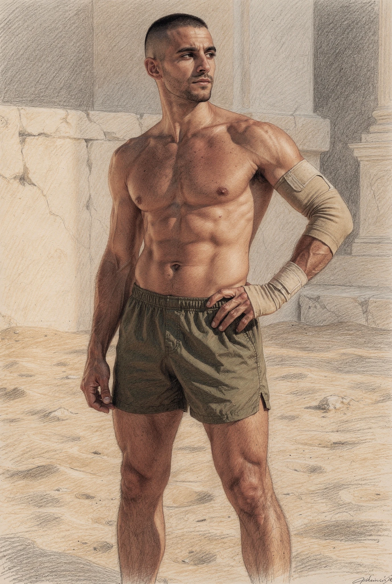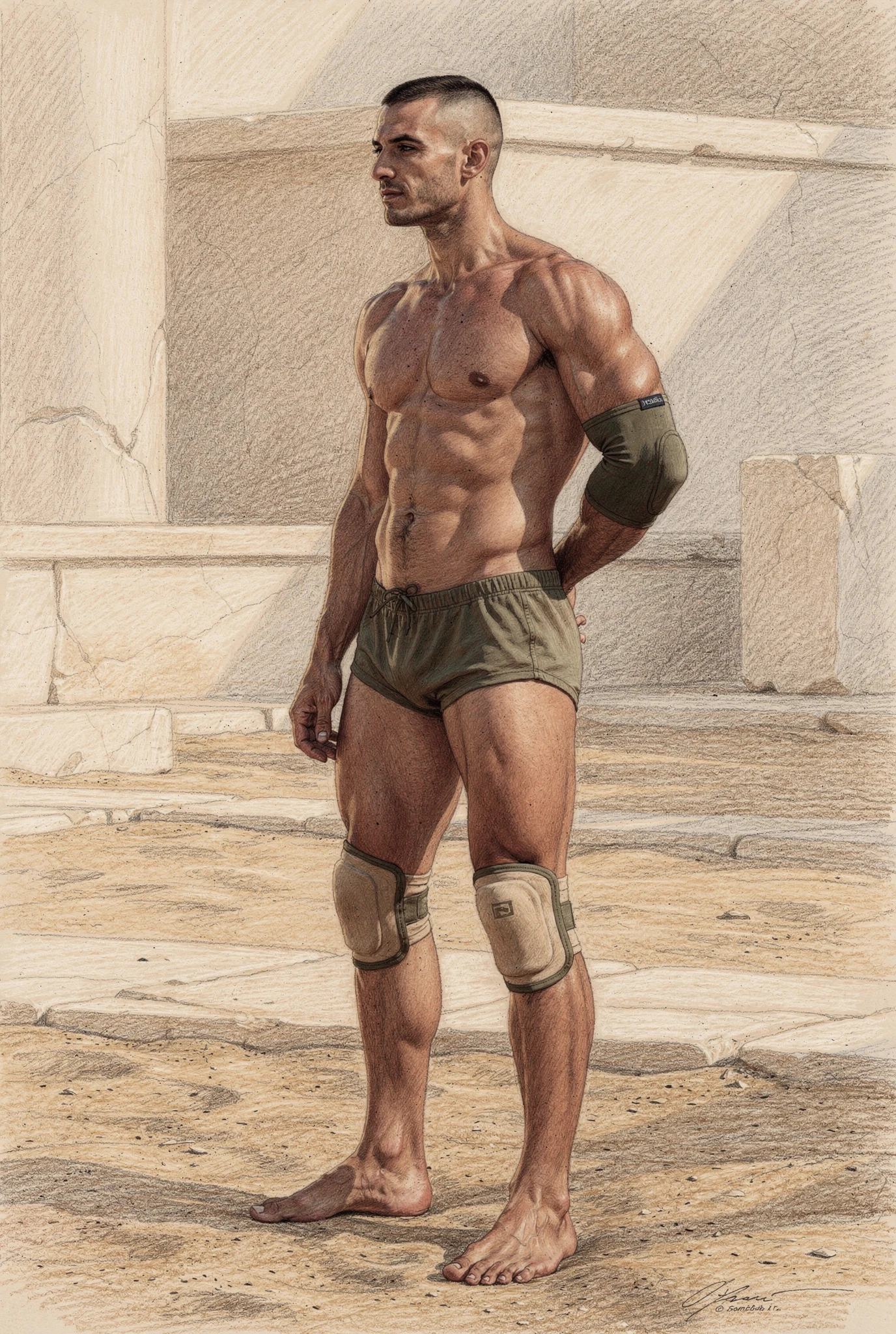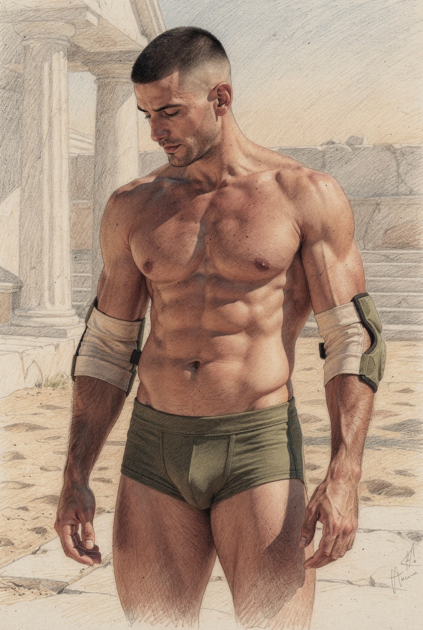 The figures in Soma are not portraits of real men but synthetic bodies rendered as flesh. Their skin is warm, sun-kissed, and shaped by training rather than chance, suggesting lives lived in Mediterranean climates where the body is formed through sport, exercise, and discipline. These bodies are not accidental; they are produced, maintained, and watched. They inhabit abstracted palaestra-like spaces — architectural residues of ancient training grounds — where physique culture, observation, and control converge. Modern garments and accessories situate the figures in contemporary time, while occasional references to the anatomical cuirass recall Roman strategies of power dressing, where armour mirrored an idealised physique rather than concealing it. Rendered through a dual logic in which environments dissolve into graphite while flesh remains chromatic and tactile, the figures appear both archaeological and contemporary, intercepted rather than staged.