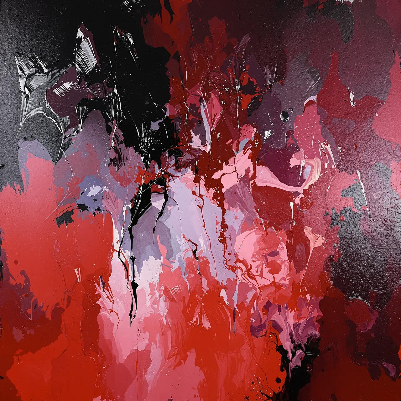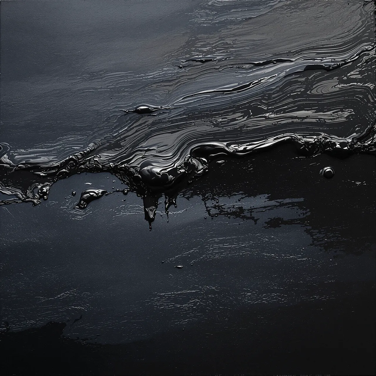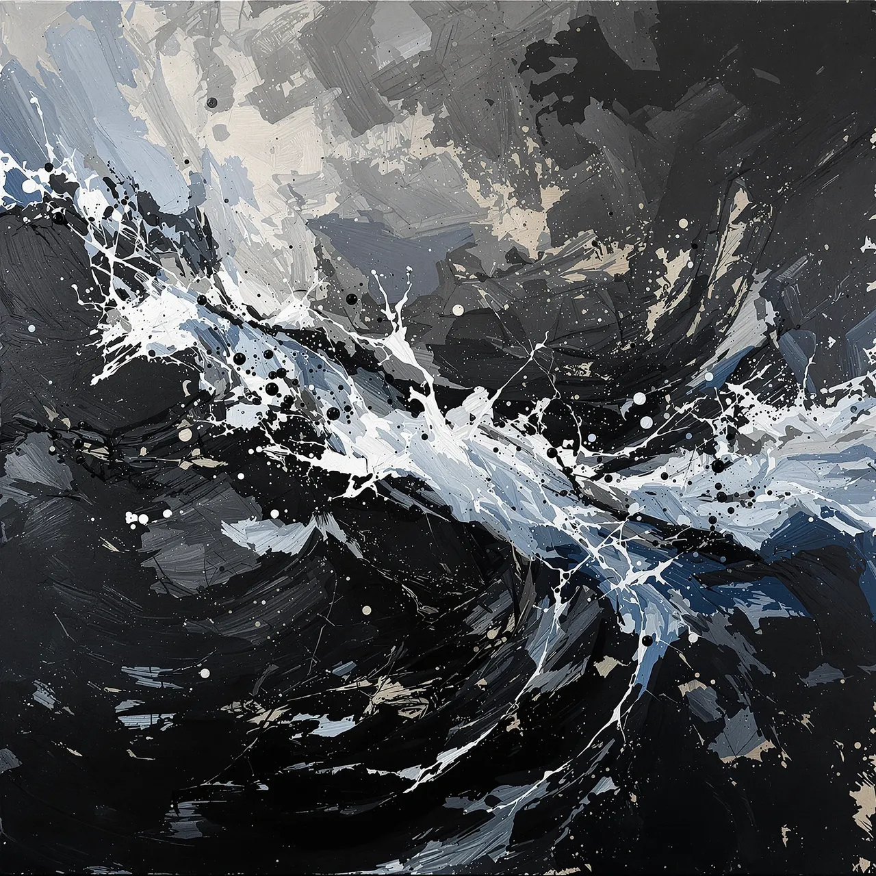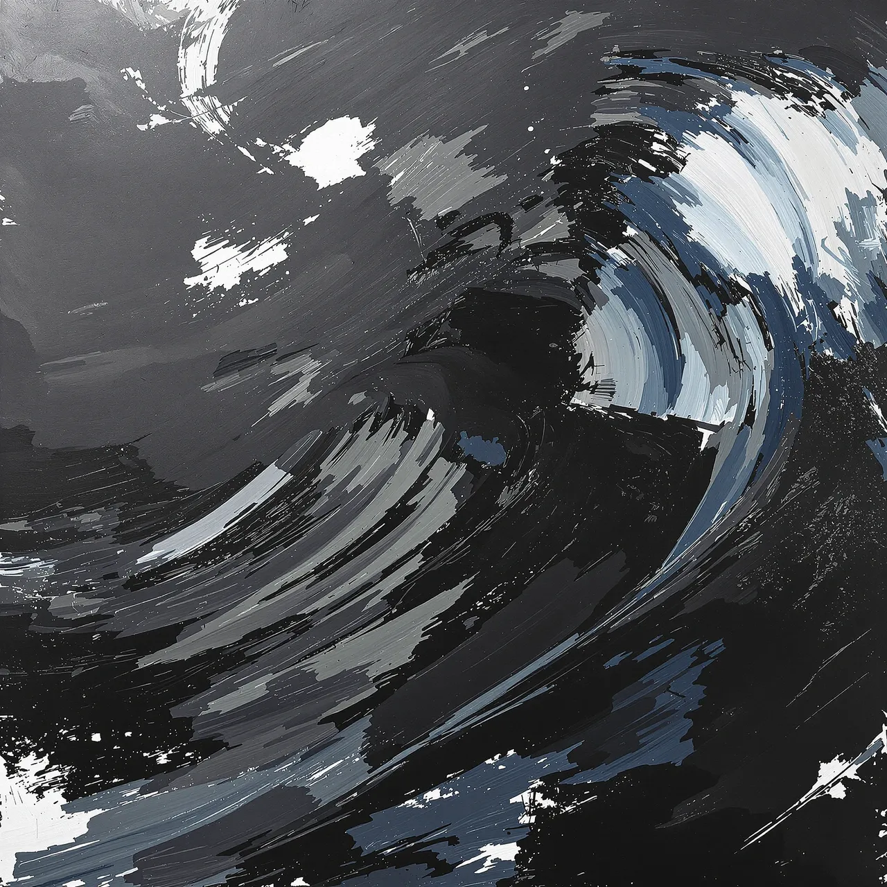 The weather outside, the weather inside — sometimes they blur. Storm is about how depression feels when it moves: agitated, heavy, cold, unrelenting, and restless with energy. These works explore storms as both atmosphere and psychology — the visible shape of invisible moods, the slow mechanics of a mind under pressure. The sea and the sky are mirrors here, each a language for instability. Black suggests darkness and a sense of foreboding; blood reds flare like warning lights. Elsewhere the palette narrows to greys, silvers, inky blues, and the tender colours of bruises — the world desaturated, as though drained of feeling. The surfaces behave like thought: they thicken, split, unfold, and reform.