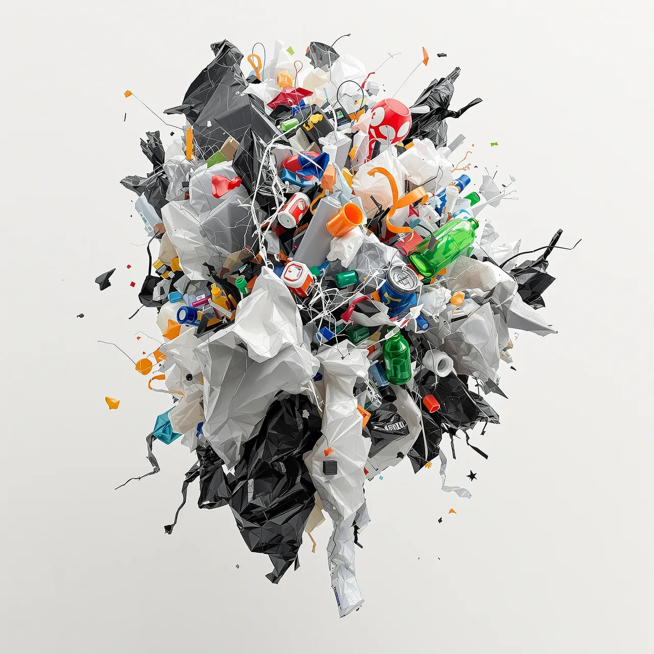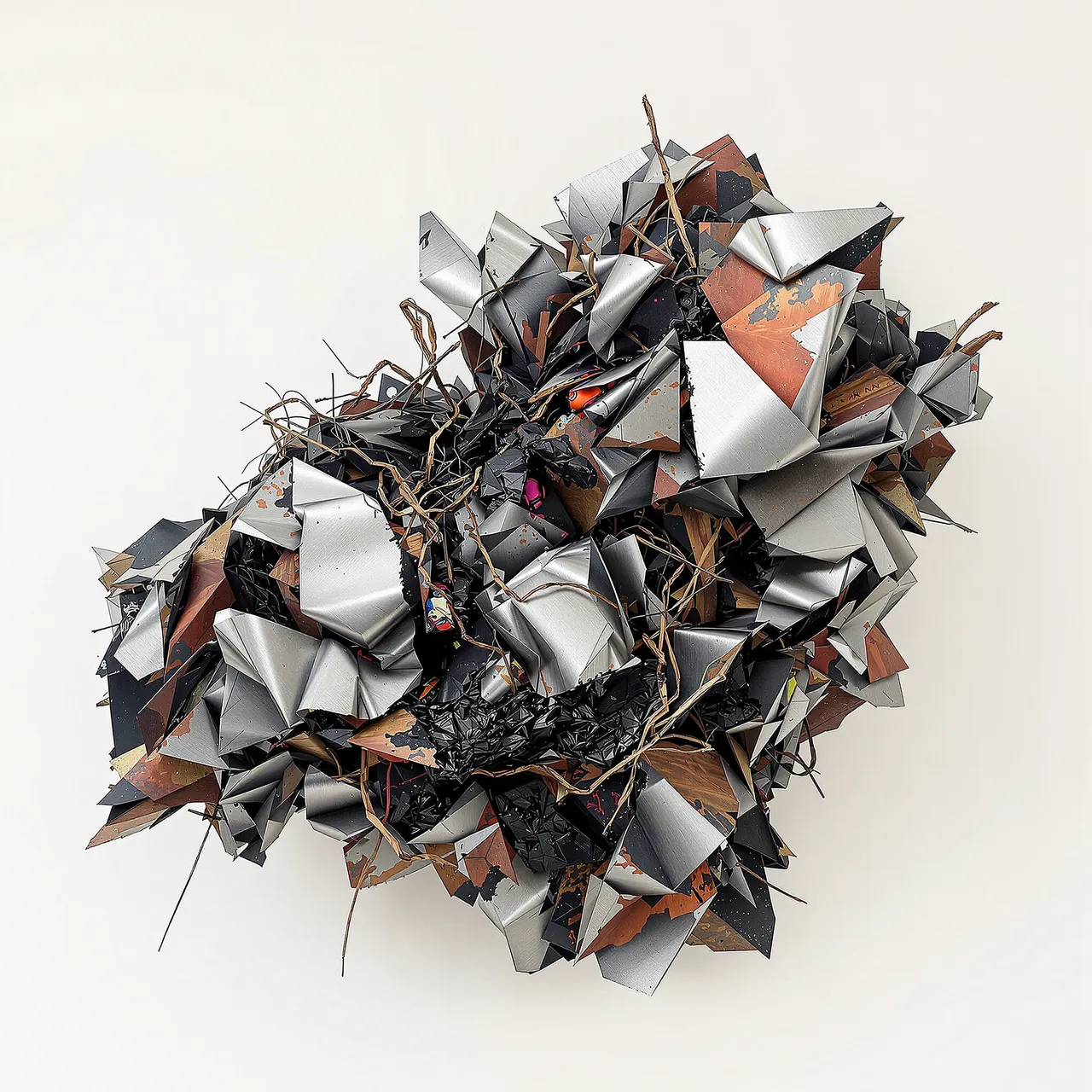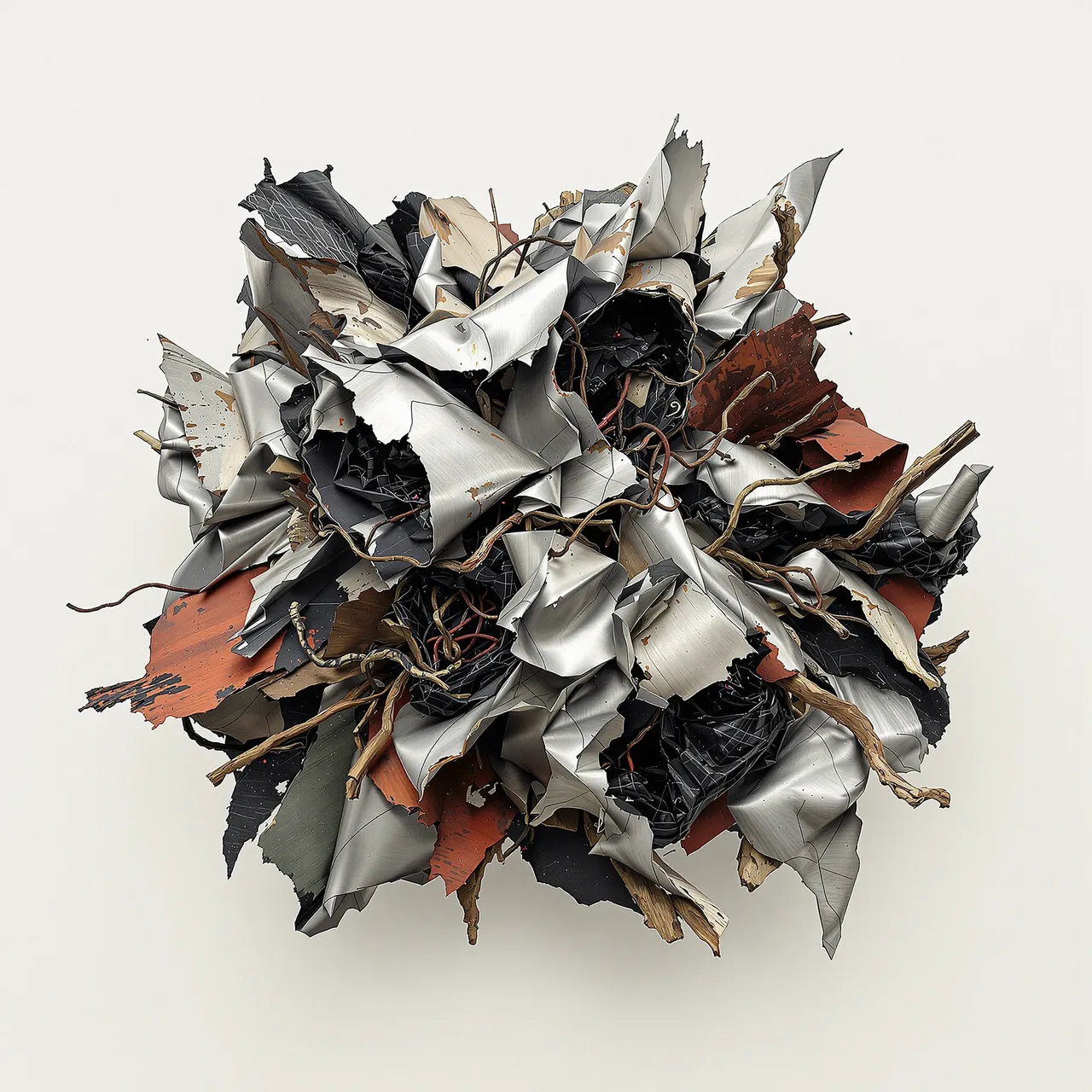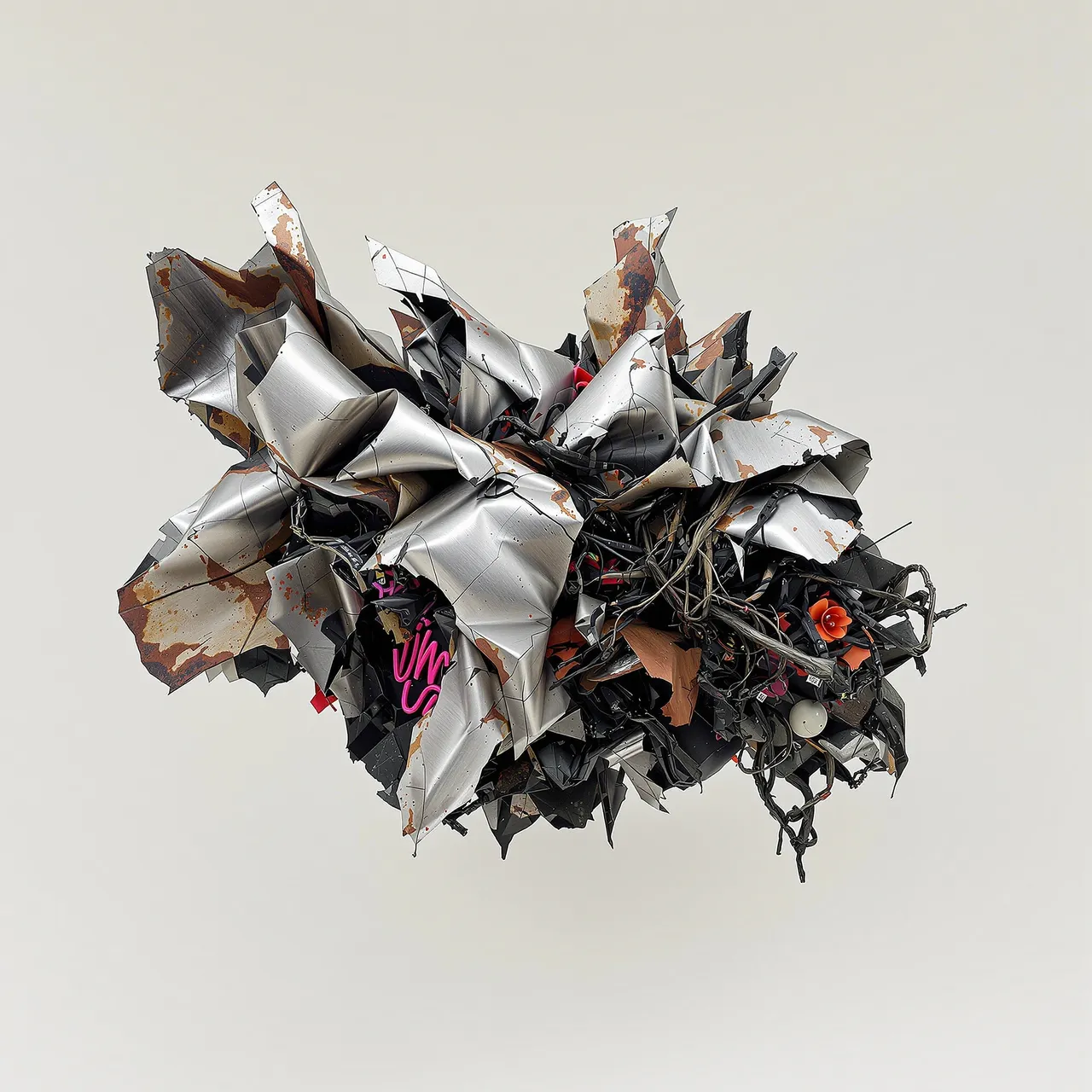 The series explores three distinct materialities: fabric, plastic, and metal — each behaving with startling realism. Twisted sheets of blackened metal, frayed cascades of fabric, and the chaotic detritus of discarded plastics are layered into dense, suspended masses. AI reveals an unexpected sensitivity to the textures and behaviours of these materials: fabric droops, folds, and drapes; metal shears, buckles, and twists; plastic crumples, bulges, and cracks. Each sculpture carries a hidden narrative about waste, accumulation, and decay — subtle commentaries on human excess, environmental exploitation, and the strange beauty of discarded things. The fabric and plastic works hint at broader questions about consumption and recycling, drawing attention to the tangled afterlife of the things we throw away.