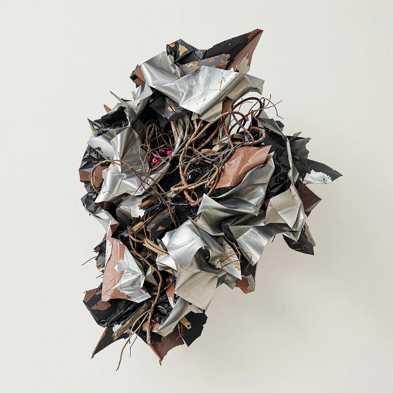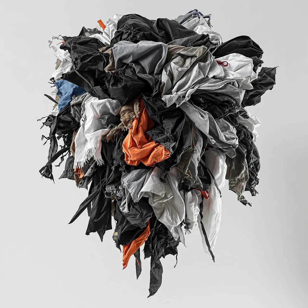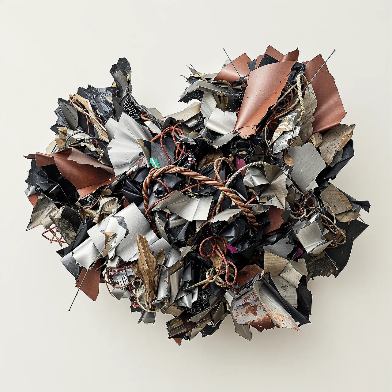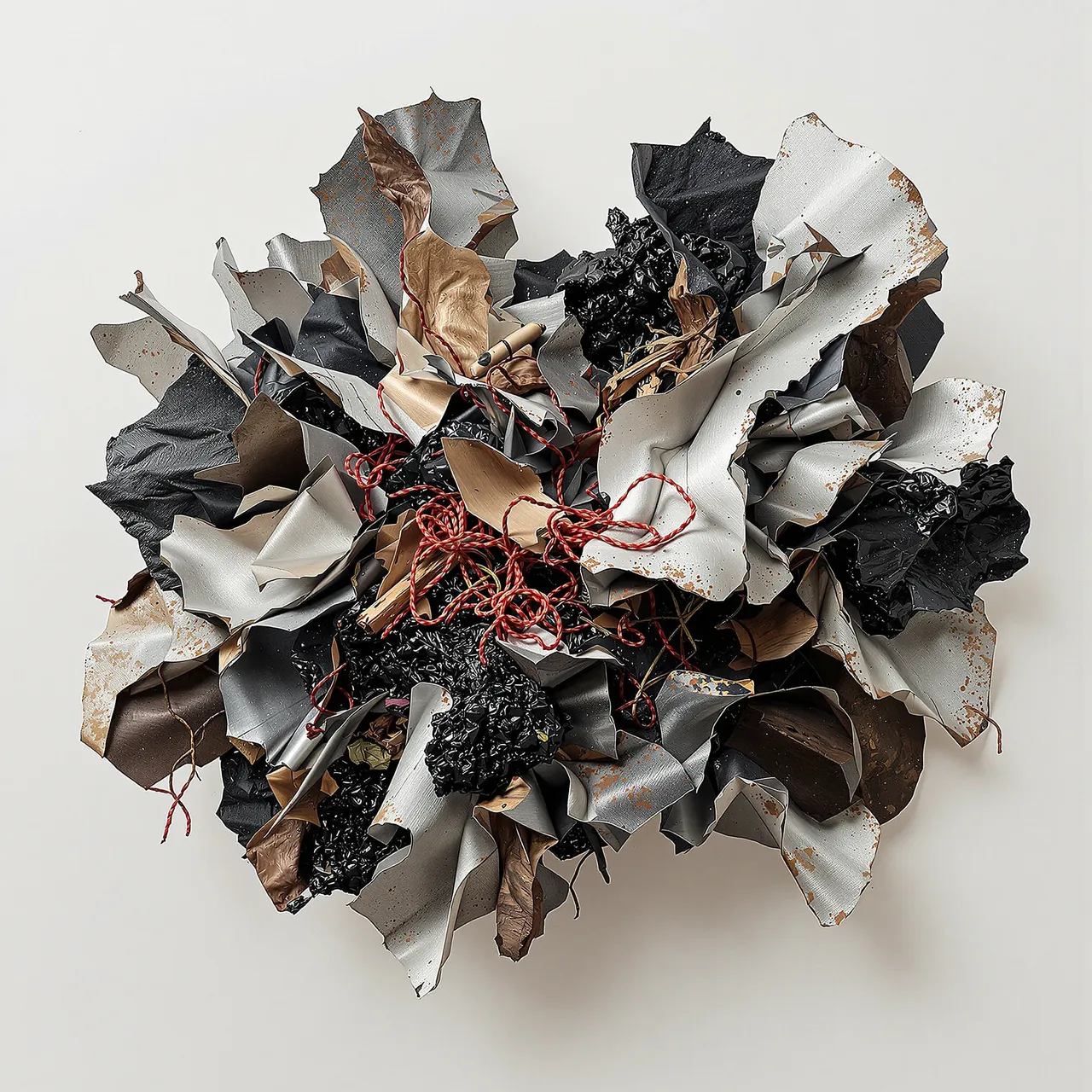 The series explores three distinct materialities: fabric, plastic, and metal — each behaving with startling realism. Twisted sheets of blackened metal, frayed cascades of fabric, and the chaotic detritus of discarded plastics are layered into dense, suspended masses. AI reveals an unexpected sensitivity to the textures and behaviours of these materials: fabric droops, folds, and drapes; metal shears, buckles, and twists; plastic crumples, bulges, and cracks. Each sculpture carries a hidden narrative about waste, accumulation, and decay — subtle commentaries on human excess, environmental exploitation, and the strange beauty of discarded things. The fabric and plastic works hint at broader questions about consumption and recycling, drawing attention to the tangled afterlife of the things we throw away.
