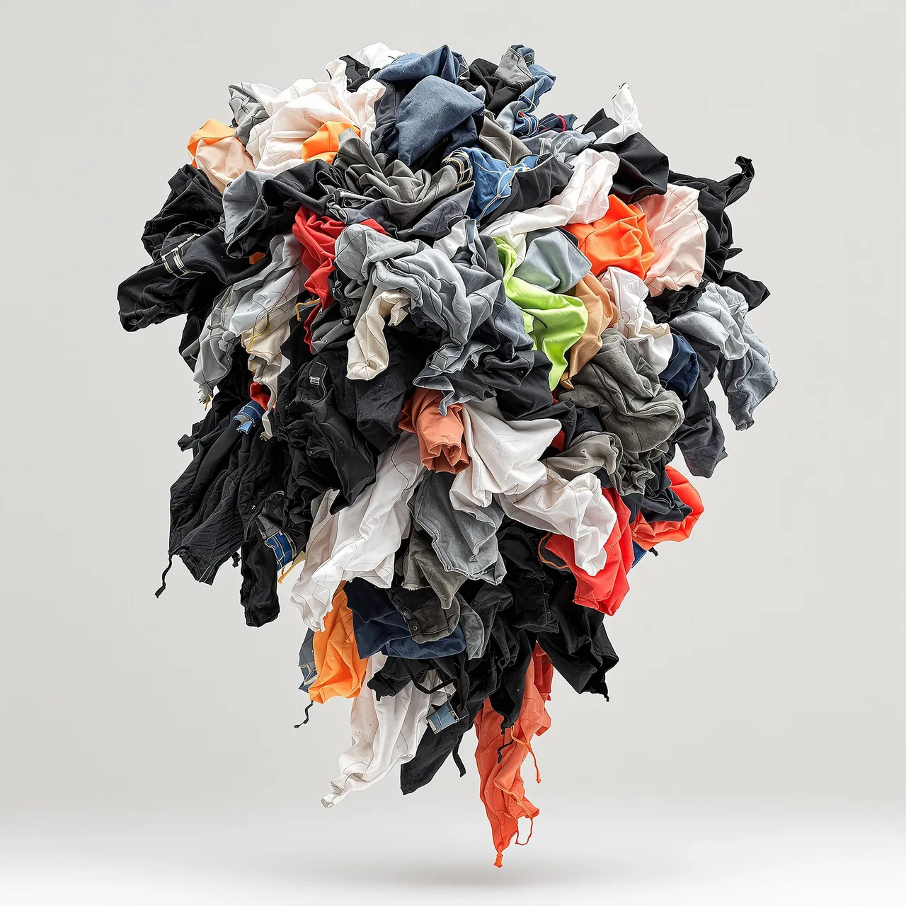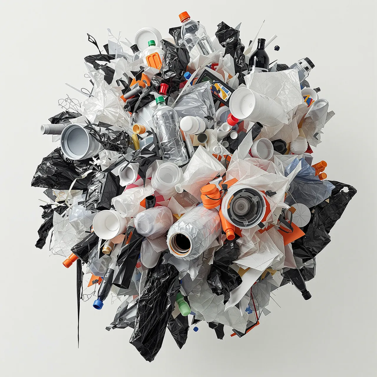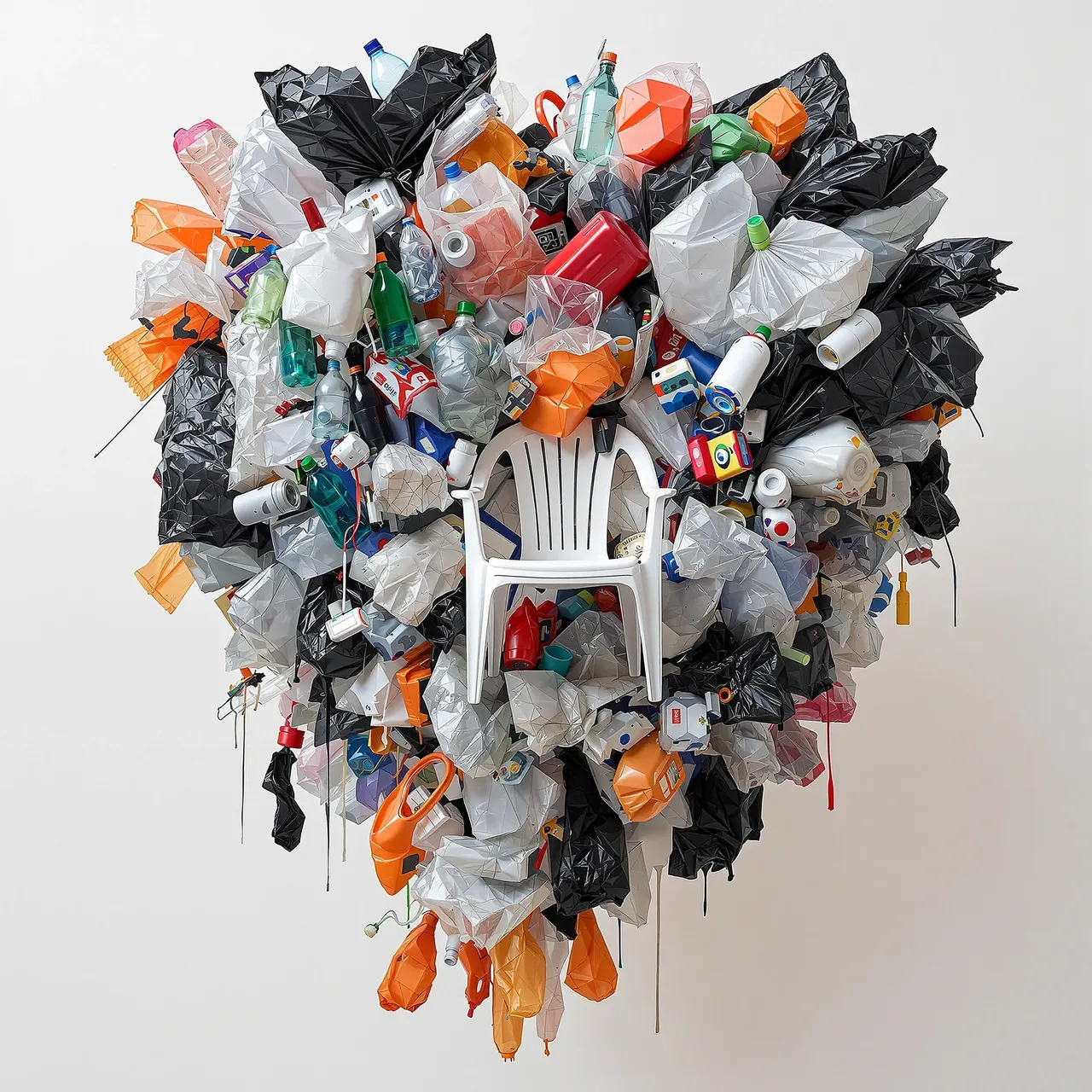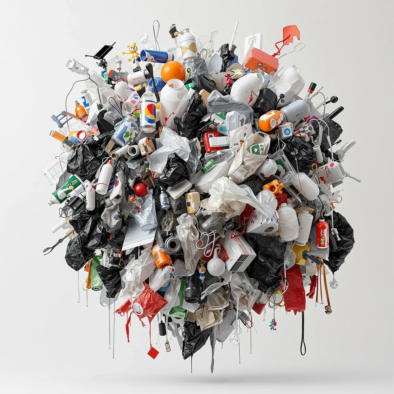 The series explores three distinct materialities: fabric, plastic, and metal — each behaving with startling realism. Twisted sheets of blackened metal, frayed cascades of fabric, and the chaotic detritus of discarded plastics are layered into dense, suspended masses. AI reveals an unexpected sensitivity to the textures and behaviours of these materials: fabric droops, folds, and drapes; metal shears, buckles, and twists; plastic crumples, bulges, and cracks. Each sculpture carries a hidden narrative about waste, accumulation, and decay — subtle commentaries on human excess, environmental exploitation, and the strange beauty of discarded things. The fabric and plastic works hint at broader questions about consumption and recycling, drawing attention to the tangled afterlife of the things we throw away.