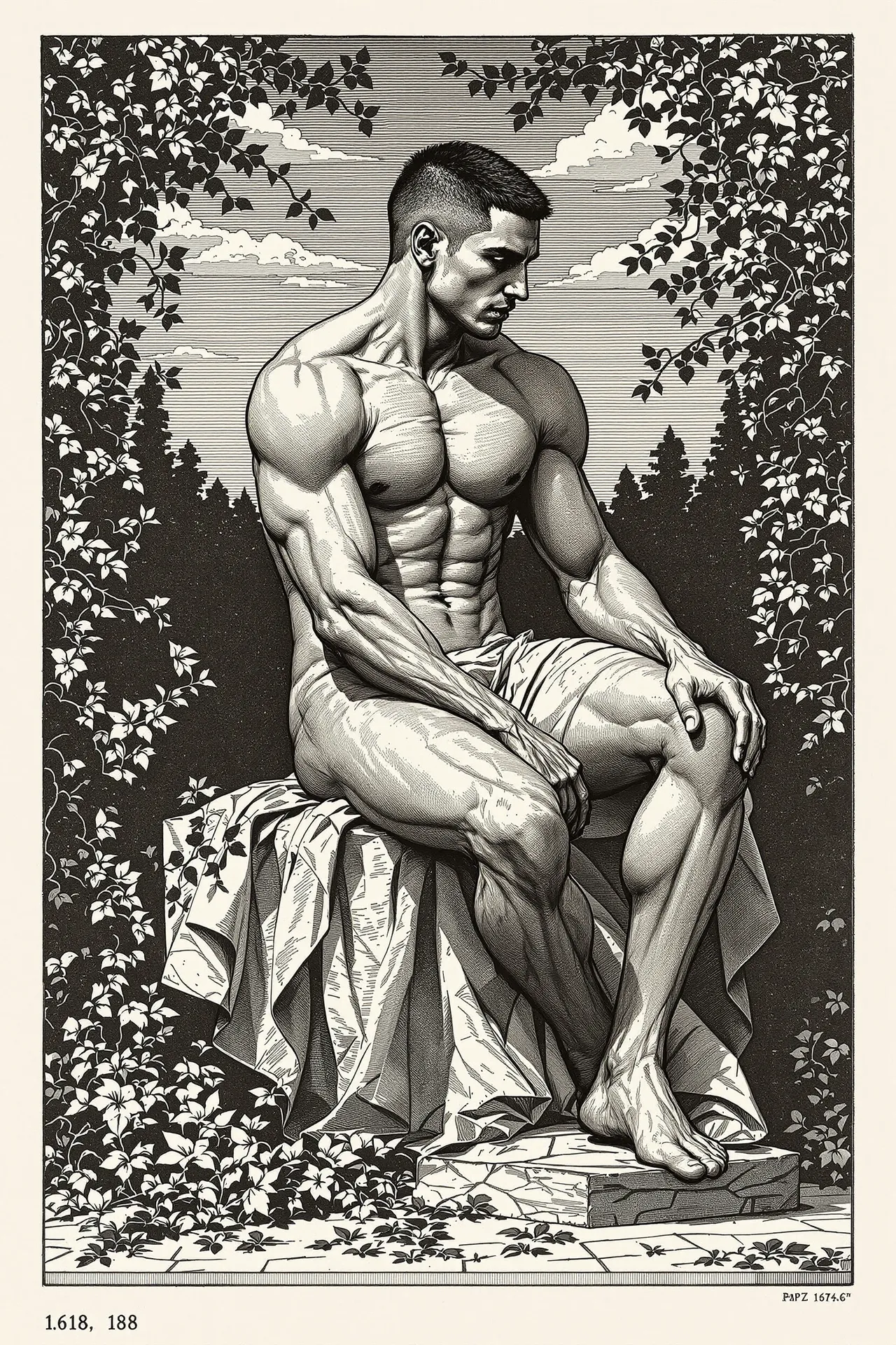 Two motifs recur throughout the series: the stylised male figure and the ornate botanical still life. The figures are calm and sculptural, echoing classical studies of anatomical perfection. The flowers are wild, abundant, and intricately composed. Their pairing is deliberate. Flowers to balance the boys. This is not sentimentality, but structure — a visual equilibrium between discipline and abundance, anatomy and ornament. Not a softening, but a symmetry. A rhythm between masculinity and sensuality, structure and excess.