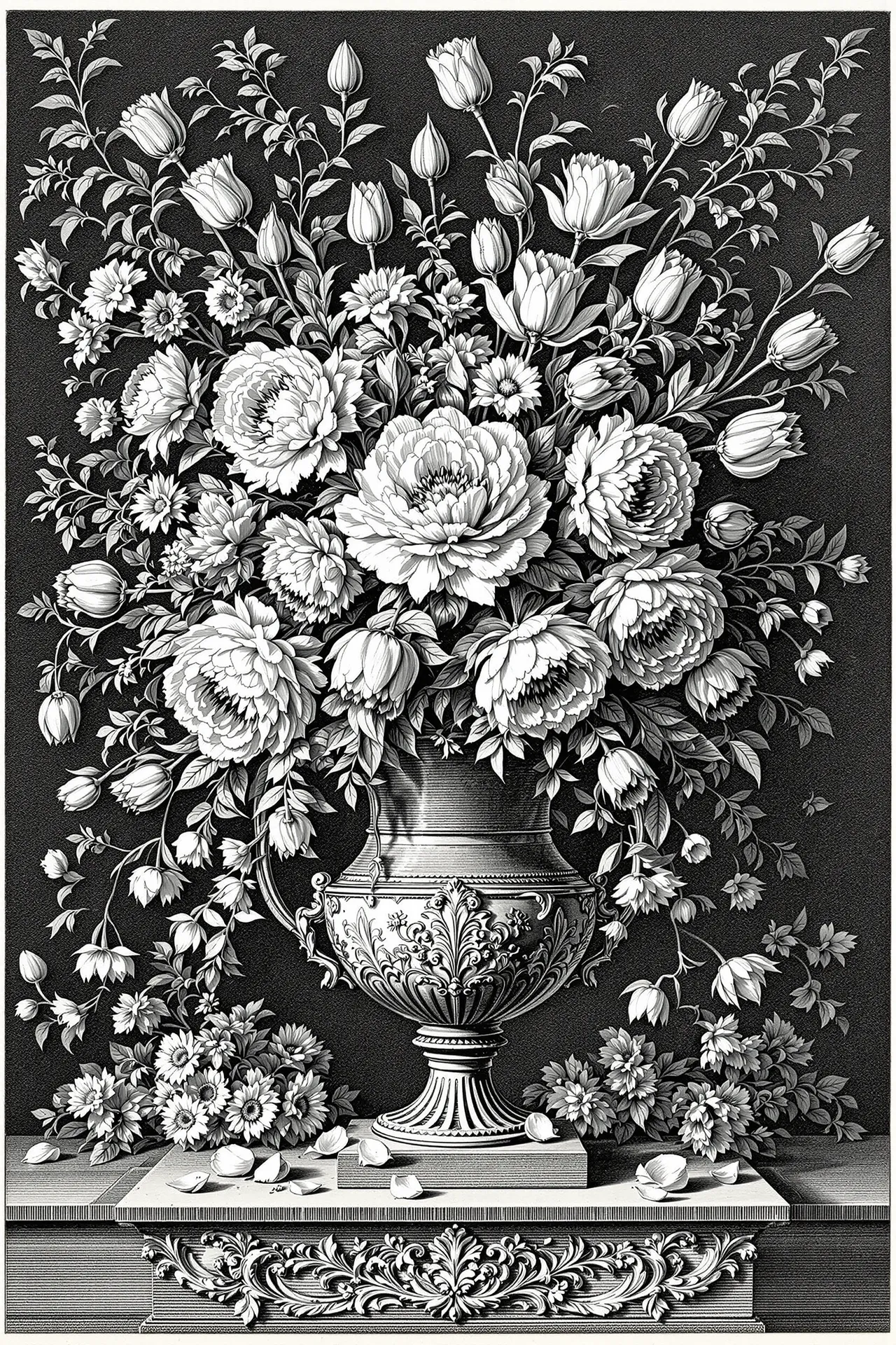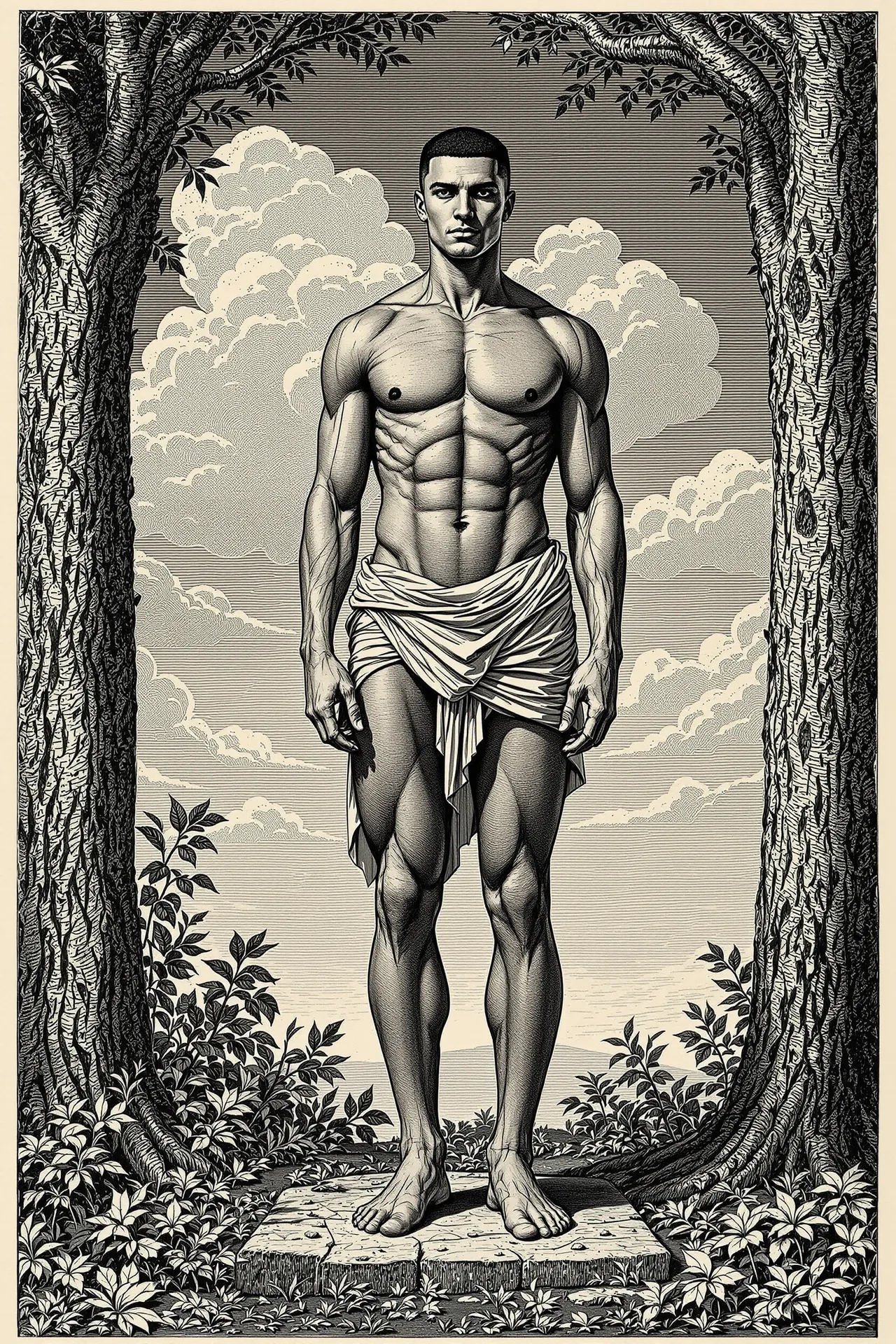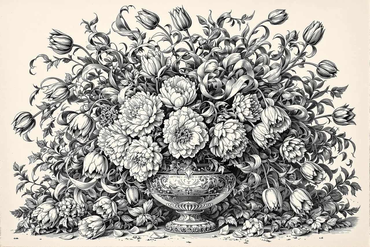 This series explores the visual language of etching and engraving — mediums rooted in incision, resistance, and the slow accumulation of line. First developed in the 15th and 16th centuries, these printmaking methods once required hand-cut copper, end grain blocks, acid baths, and the rhythmic pressure of a printing press. Here, those same effects are achieved not with metal, wood, or ink, but with prompt engineering. Each image was created using artificial intelligence, mimicking the gestures of the engraver's hand: cross-hatching, stippling, drypoint burrs, and burin-sharp contours rendered with uncanny precision. The colour palette is restrained — black line on aged, off-white ground — yet these are not historical prints. They are digital simulations, composed entirely through language.