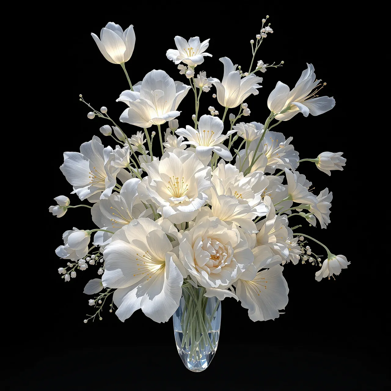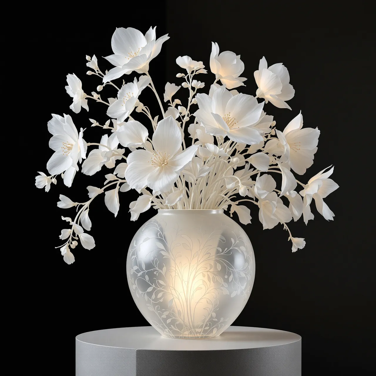 Created with the assistance of artificial intelligence, Vitris is less a document of craftsmanship than a study in simulation. AI cannot touch glass. It cannot feel weight, heat, or tension. But it can read and follow instructions. It can learn from language, absorb research, and generate images that behave — optically, structurally, metaphorically — like glass. The title Vitris, derived from the Latin vitrum, acknowledges this distance. It is a word about glass, not of it. These objects are not flowers, glass, or vases. They are about them. They sit at the intersection between what is known and what is created. Impossible, yet authentic. Imaginary, yet believable.