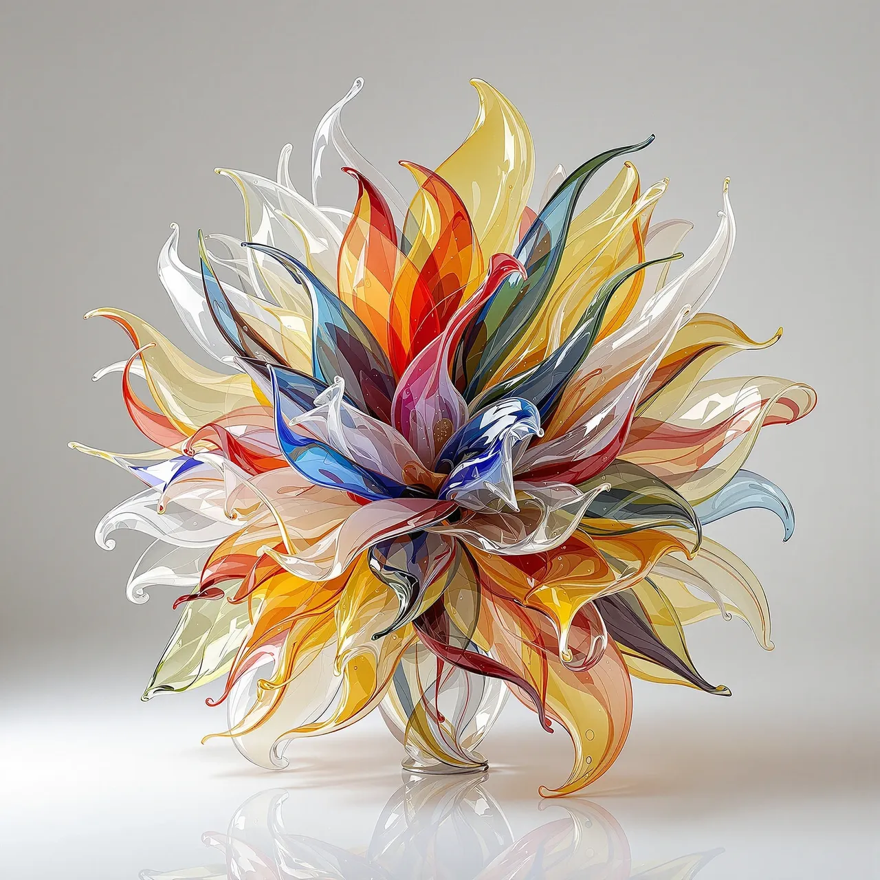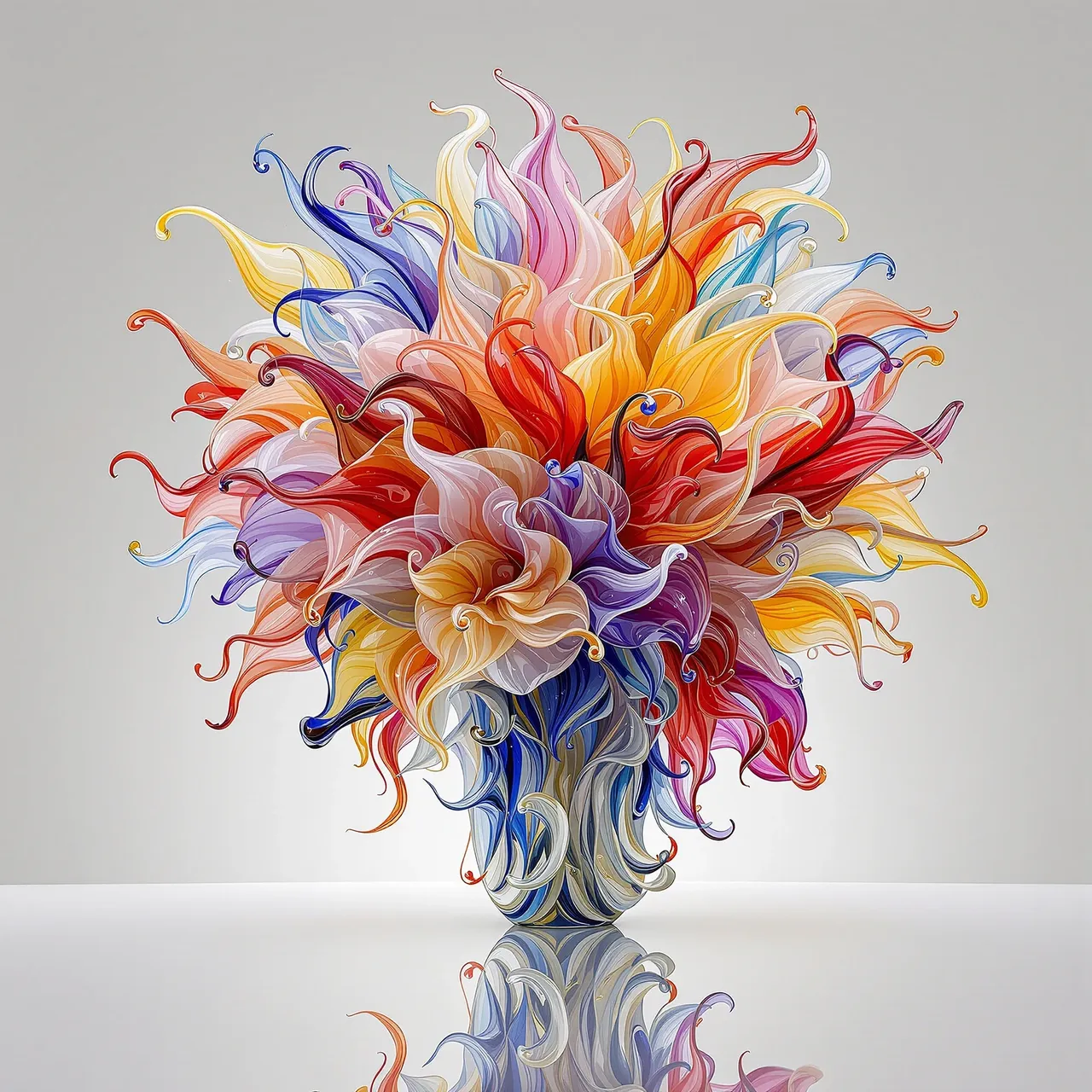 Glass is a material defined by tension — between fragility and permanence, solidity and light, transparency and distortion. These works present flowers that never lived, arrangements that could never wilt — crafted entirely from glass, yet suspended between natural memory and imagined perfection. In some pieces, the glass swirls are hypnotic — more like a performance than a sculpture, as if the bouquet were captured mid-dance, frozen in centrifugal ecstasy. In others, petals appear so delicate they seem as though they might shatter at any moment. The absence of botanical realism in many cases allows the AI to lean fully into abstraction and materiality. These are not glass flowers pretending to be real. They are a fantasy of opulence made manifest in molten form.