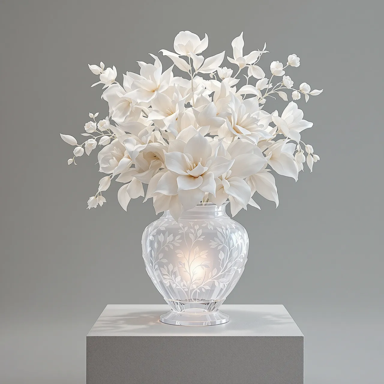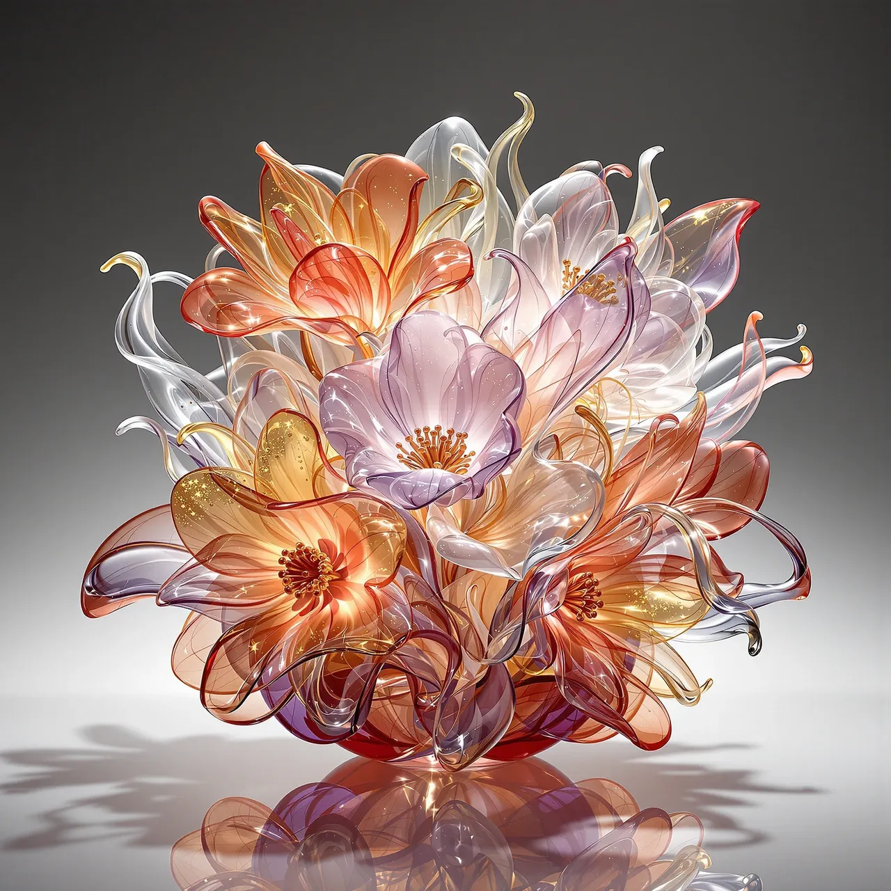 At the heart of Vitris lies an engagement with history and technique. Some arrangements are inspired by the still lifes of 17th-century Dutch flower painting, reinterpreted through the material traditions of Murano and Lalique. From Murano, the work borrows exuberance: gold-leaf inclusions, millefiori detailing, saturated colour, and the expressive volatility of hand-blown forms. From Lalique comes restraint: satin-finished crystal, frosted translucency, and the sculptural quiet of cast glass. Together, these influences allow Vitris to move fluidly between maximalism and minimalism, between heat and silence. It is both ornamental and contemplative — echoing techniques too delicate for human hands, and forms too elaborate to exist outside the digital realm.